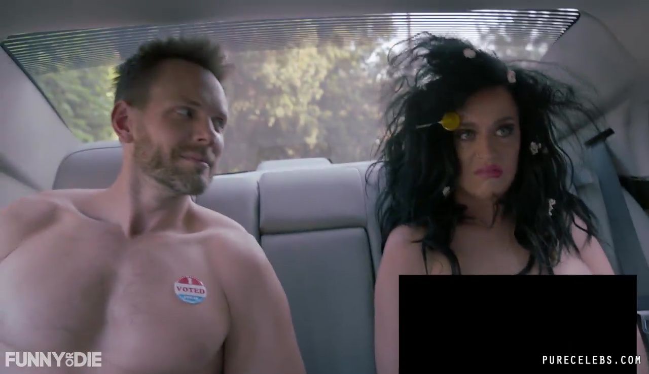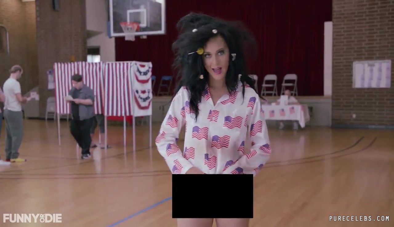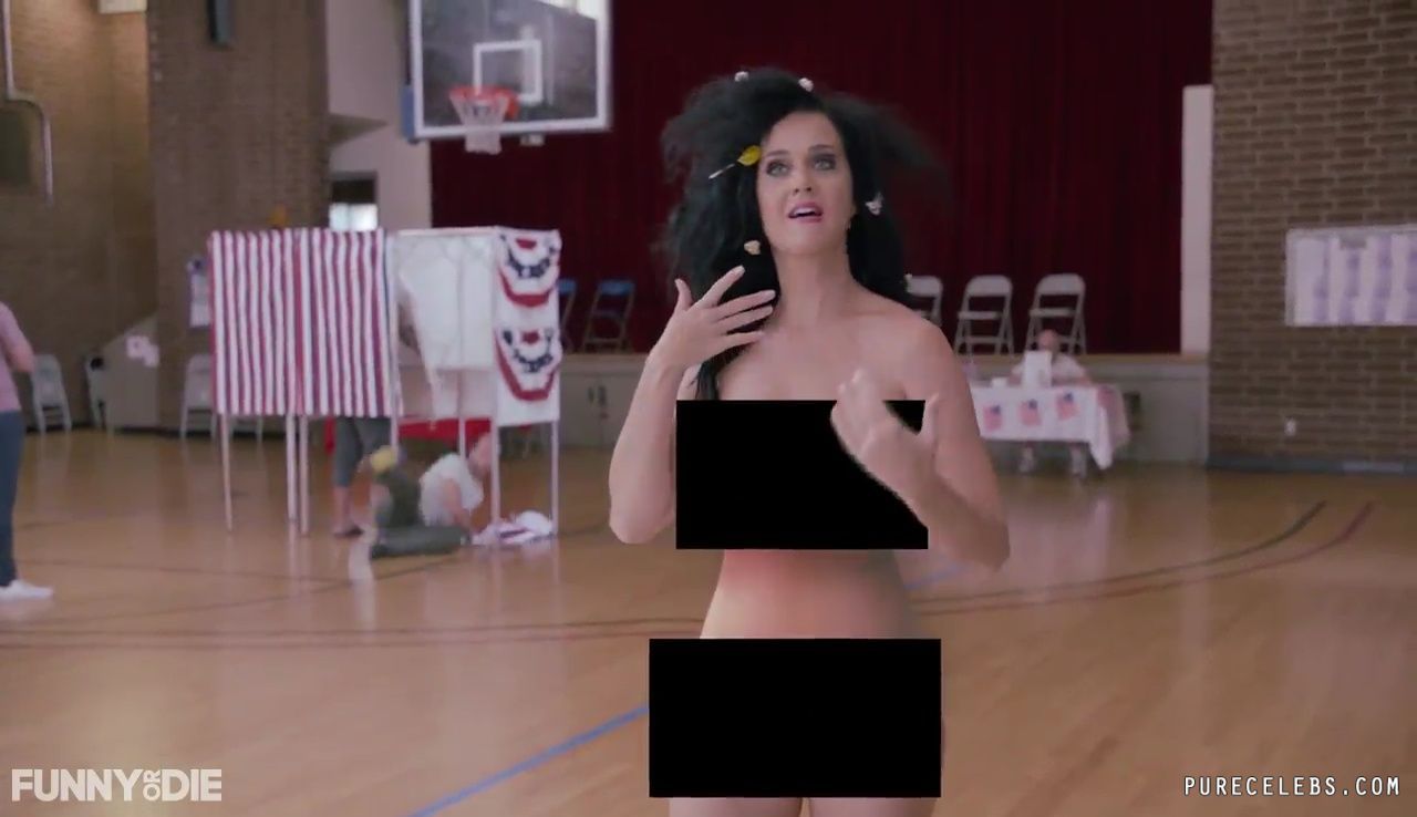 Gorgeous American babe and singer, Katy Perry tickles the imagination of every man with her big busty breasts and sexy figure. In her campaign for the American Presidential elections, she made a short video showing you how easy it is to go out and vote and during that time she was naked, but everything was censored. But it’s still funny and you can let your imagination go wild.