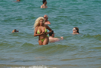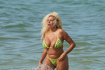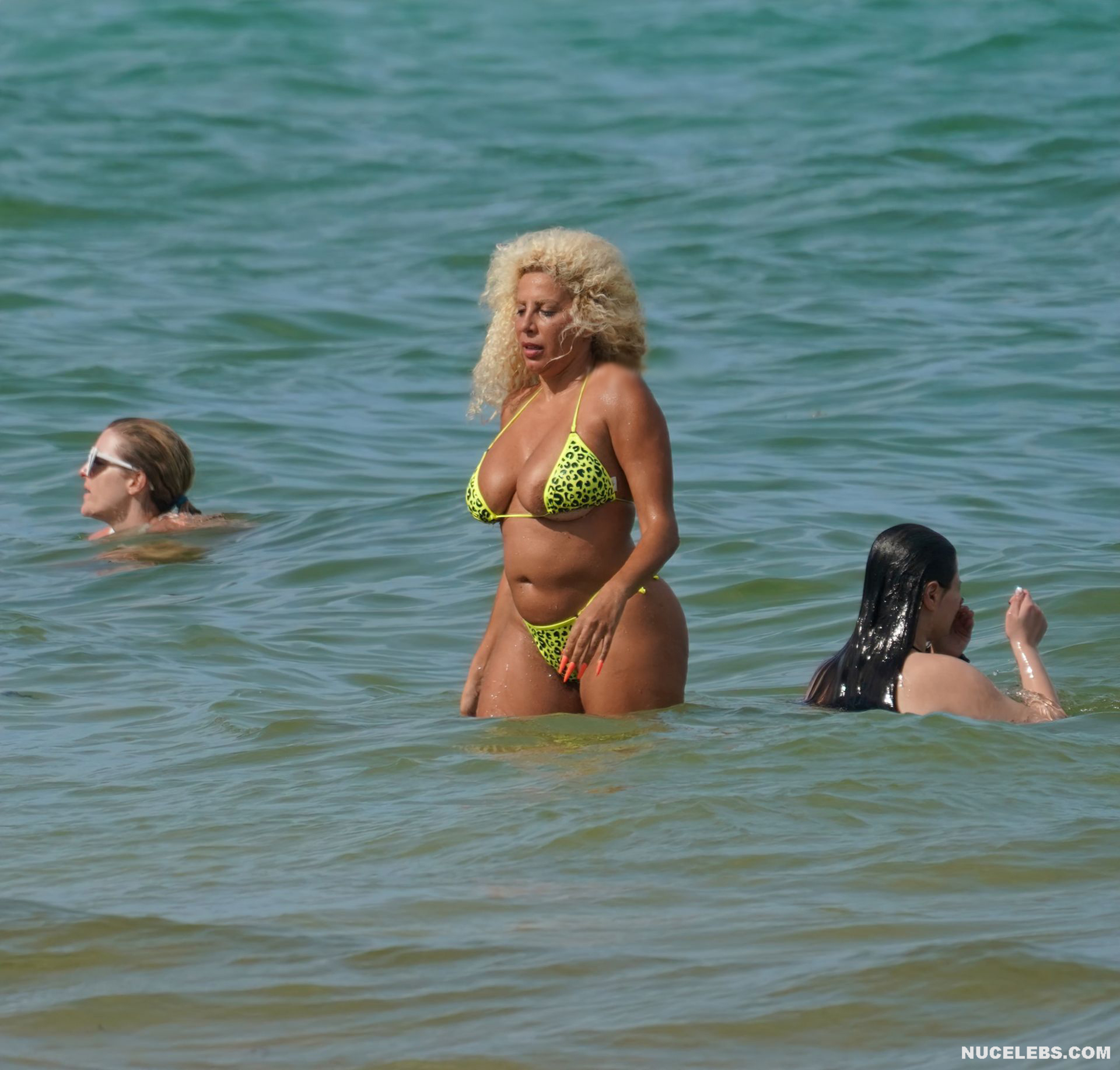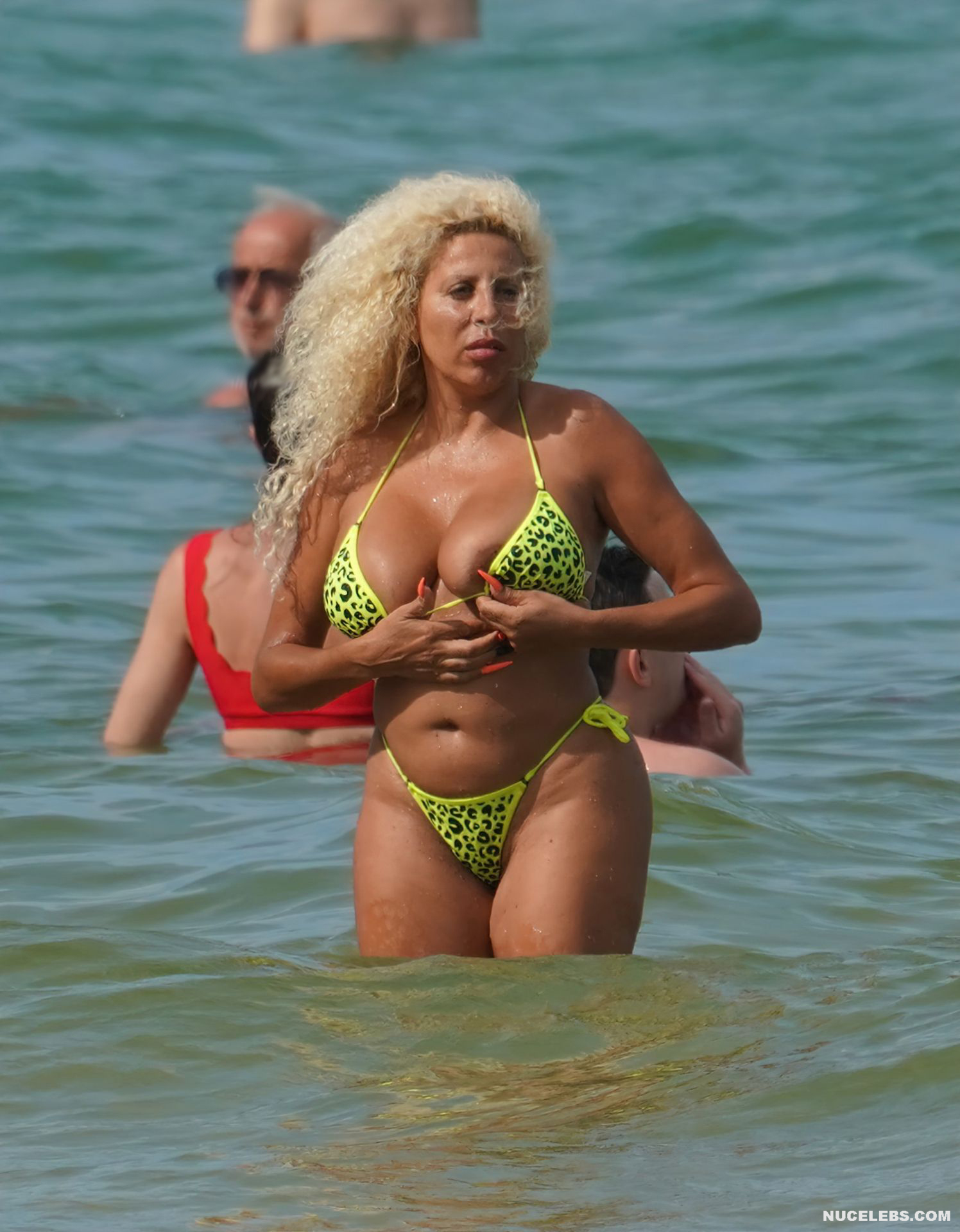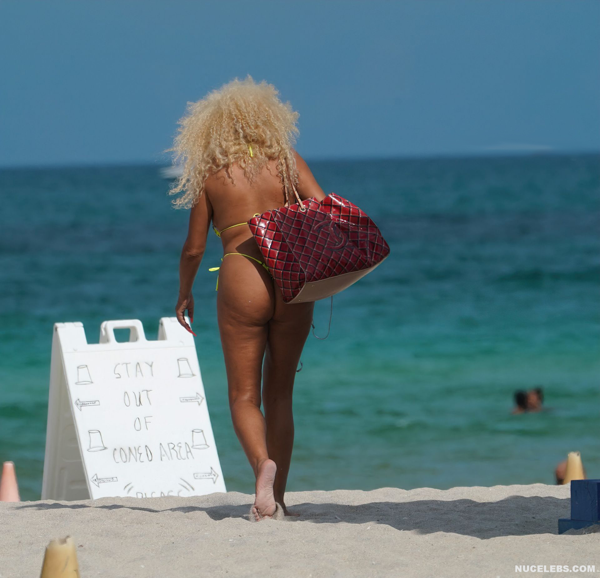 Busty beauty Afida Turner came under the sight of paparazzi cameras. So, this French singer was photographed during her recent beach vacation. It was impossible to look away from this celebrity, because her yellow printed bikini was petite! Small pieces of fabric barely covered Afida Turner’s pussy, and her ass seemed completely nude, because she was covered only by a narrow strip of thongs. By the way, the paparazzi also managed to photograph the moment when Afida Turner’s nude boob jumped out of her small bra. Her big brown nipple looked so sweet, didn’t it?