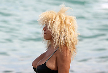 The paparazzi managed to capture stunning nude photos of Afida Turner on the beach. This 45-year-old celebrity seemed to have picked up a bikini that was too small for herself, which didn’t cover up her naughty bits well. Therefore, when Afida Turner came out of the sea, she did not immediately notice that her nude boobs were visible to everyone around! Well, the little black bra couldn’t hold on to her big melons with hard nipples!