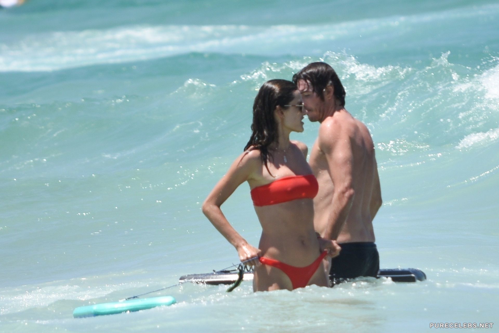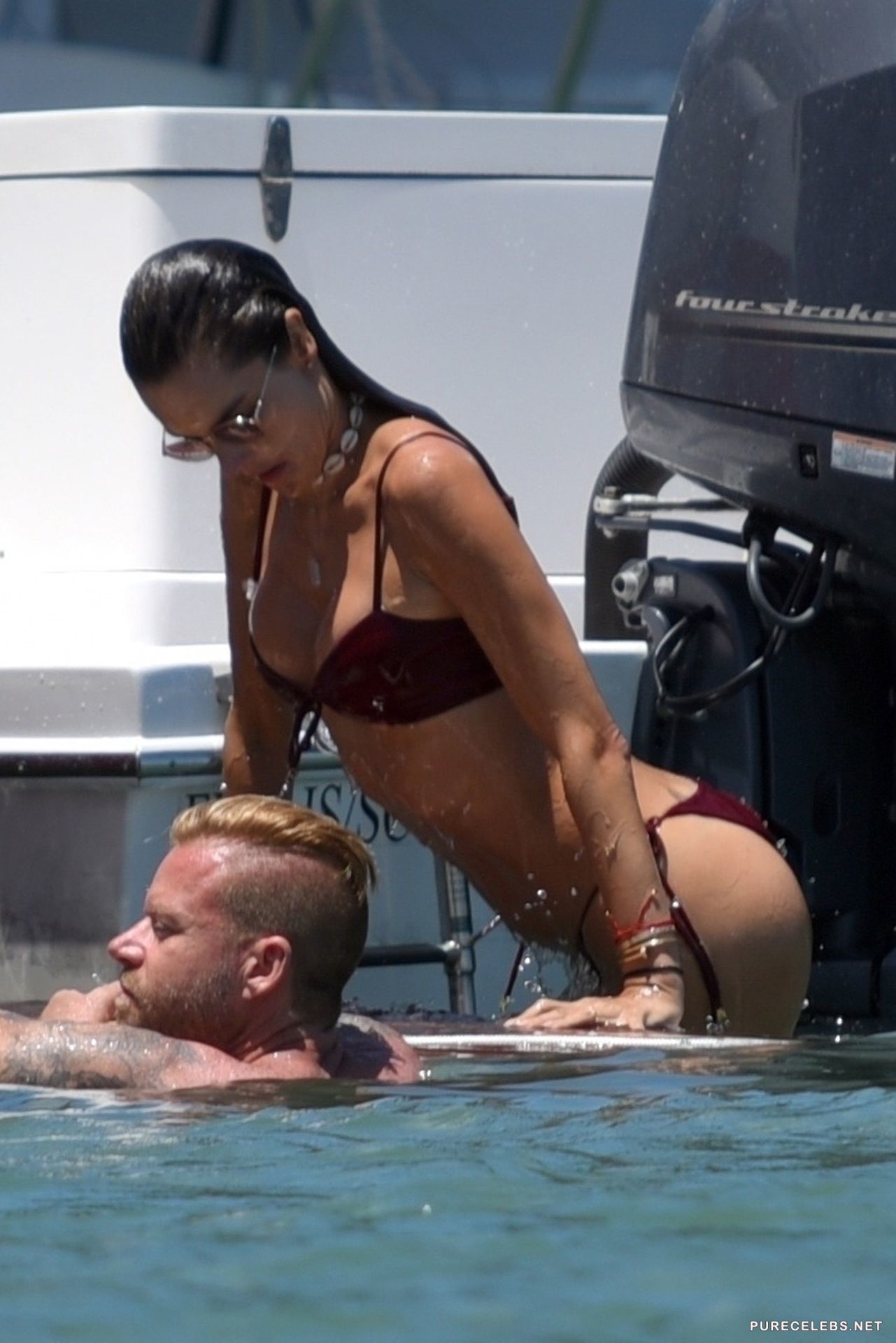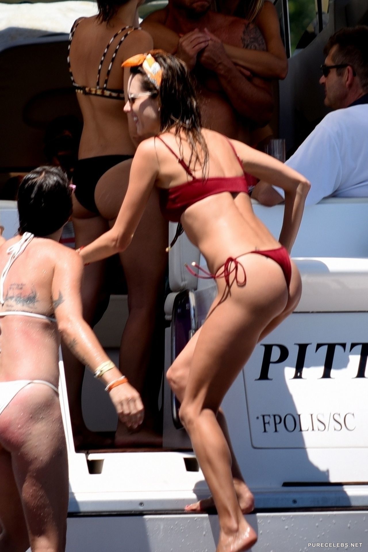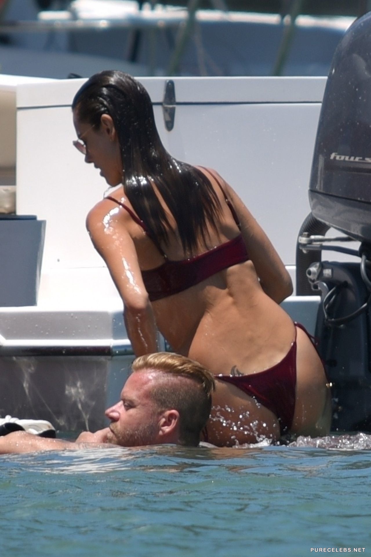 Hot mom of two, and well known model, Alessandra Ambrosio was one of the Victoria’s Secret angels and it is more than obvious why. It seems like this hot woman is not changing, she looks stunning as always. She was wearing a red bikini with a thong bottom and sunglasses, soaking herself in the water here and there and going straight back inside the yacht, to avoid too much tanning.