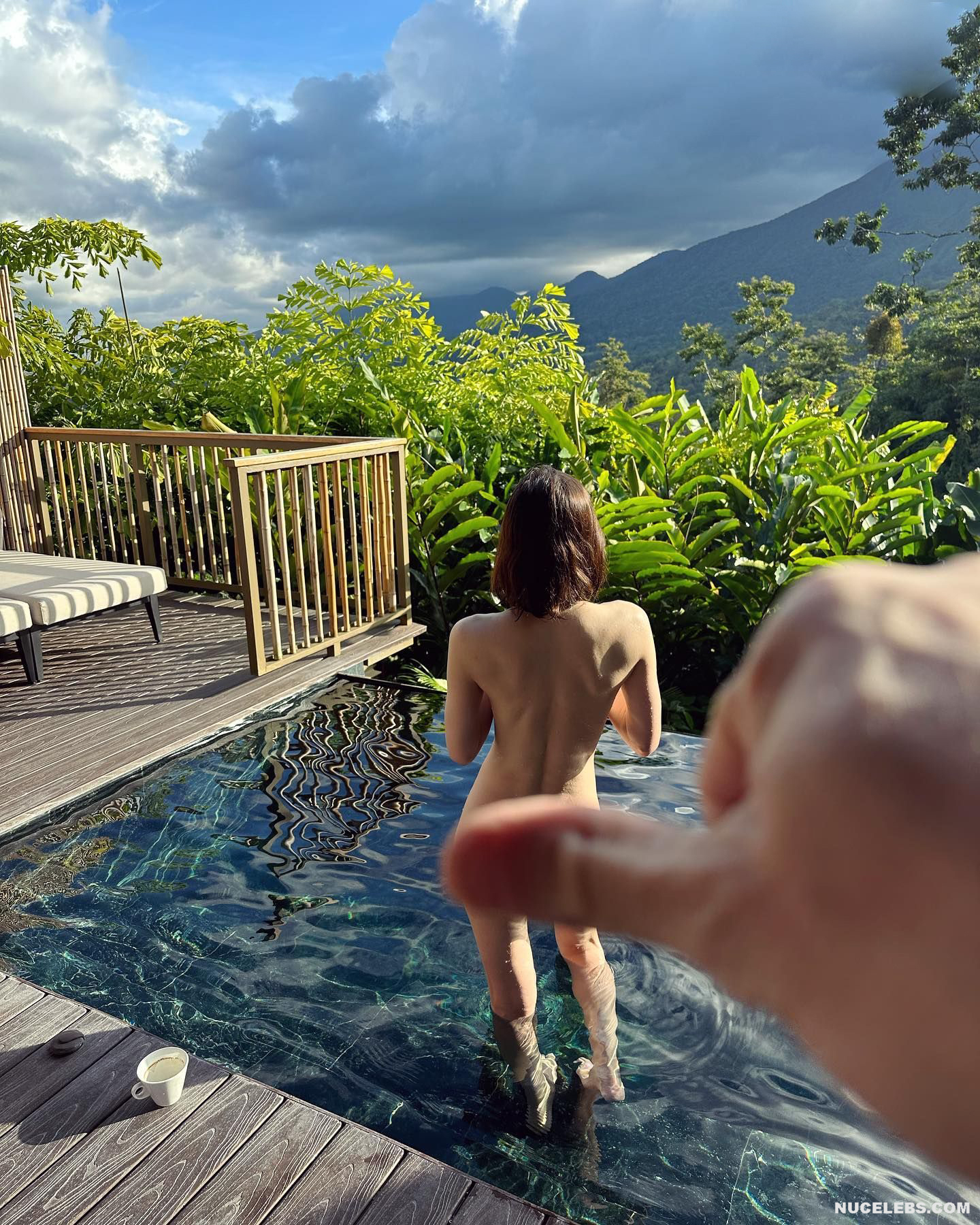 Alexandra Daddario knows how to demonstrate her nude body by thinking over rather unusual images for this. For example, this American actress stood in the middle of the pool, pouring water over her body. At the same time, you could only see her bare back and the top of her naked ass. And in another photo you can see how the finger covers Alexandra Daddario’s nude bum when she enters the water. Also, this 36-year-old celebrity, wearing striped panties, posed topless on the balcony!