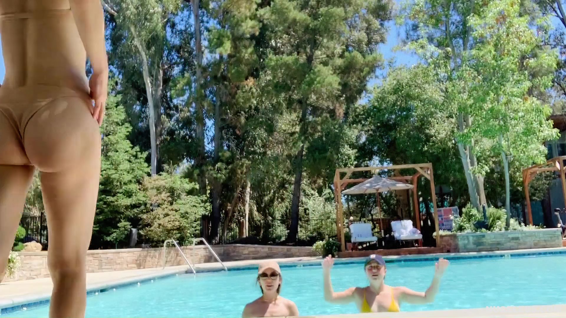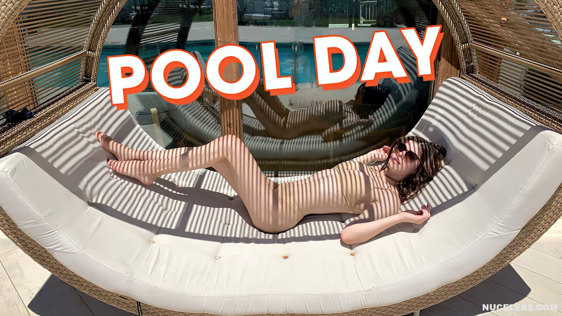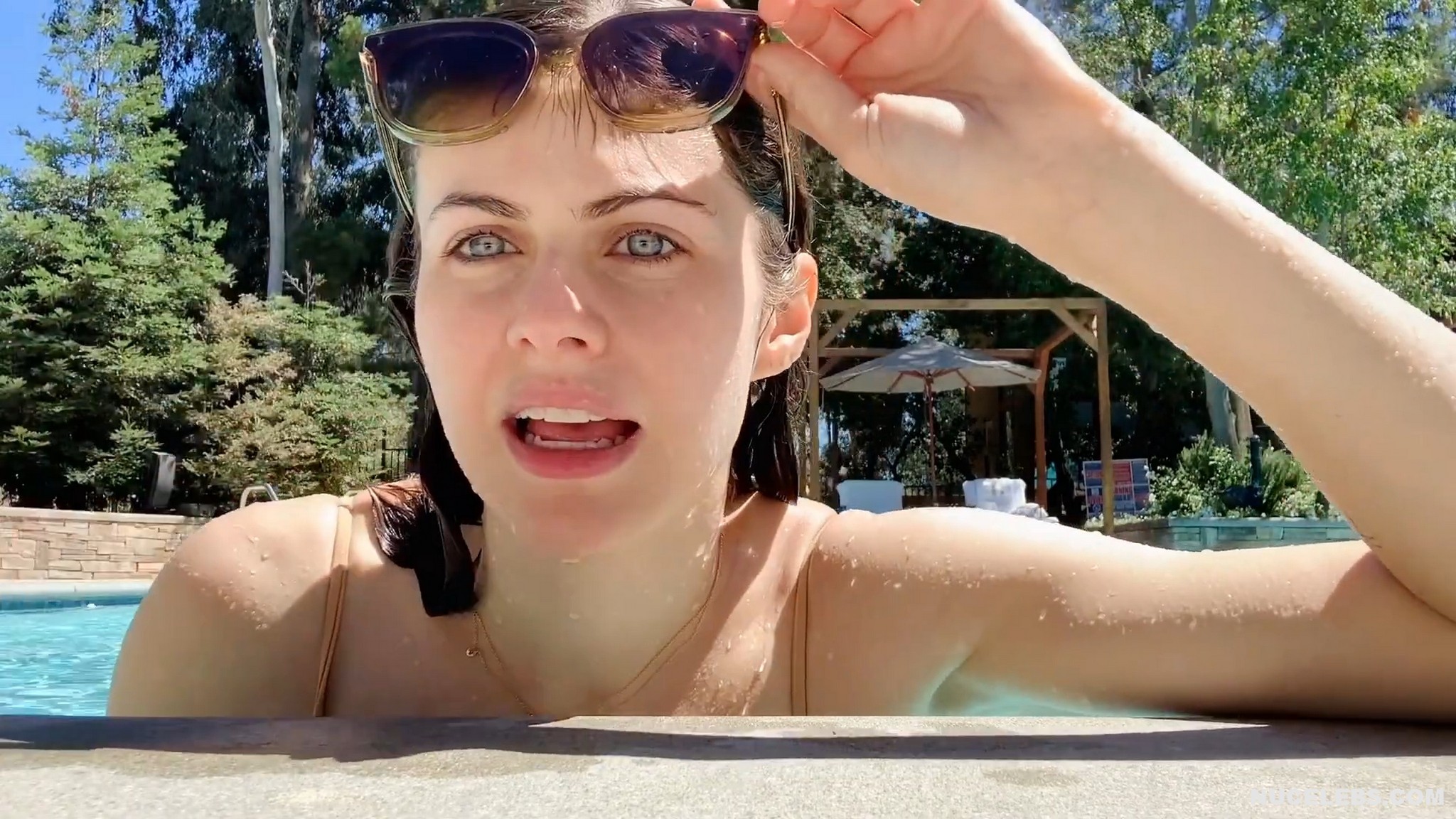 Alexandra Daddario decided to tease her fans by showing her almost nude boobs during a day at the pool with her friends. This adorable American actress wore a petite beige bikini through the top of which her poking nipples were visible. In addition, Alexandra Daddario’s nude boobies were ready to slip out of the small bra whenever she bent over. Check out also her gorgeous butt in small panties and her awesome cameltoe, which she showed in close-up.