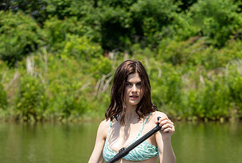 36-year-old beauty Alexandra Daddario teases her fans by showing off her almost nude body. So, this actress flaunted her wonderful figure in a miniature green bikini. She, along with her friend, sailed in a boat on the river, not far from the shore. And when Alexandra Daddario lay down on the boat, her nude juicy boobies almost jumped out of her tiny bra! Well, we look forward to new even more candid photos of this charming star!