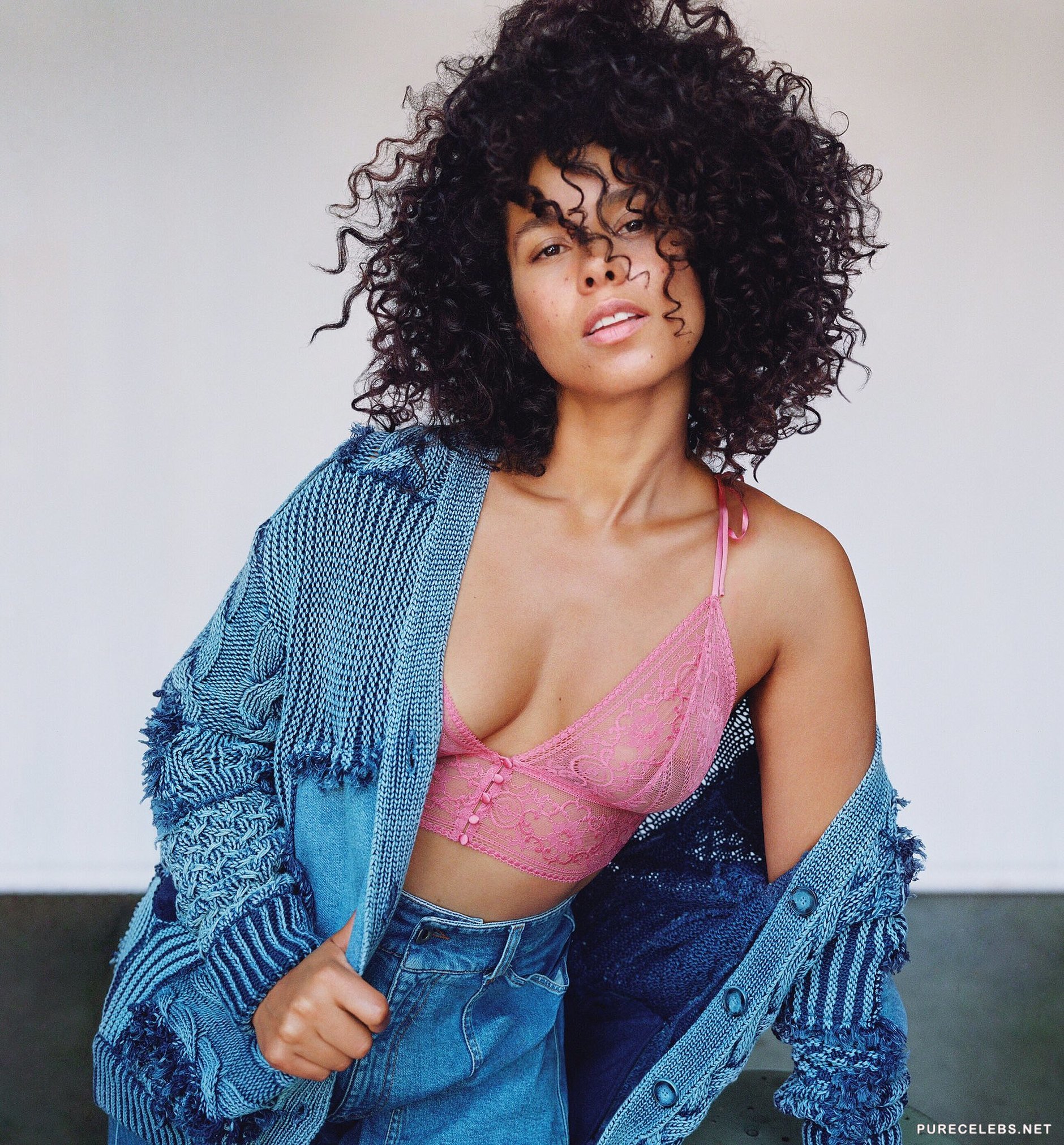 Alicia Keys is best known to the public for her amazing voice, but this talented musician decided to showcase her other assets is a recent magazine photo shoot. The hot ebony babe posed for the camera wearing a sheer pink bra that showed off her heavenly boobs. She playfully smiled for the camera while exposing her chest and even took time in between shots to pose with members of the crew.