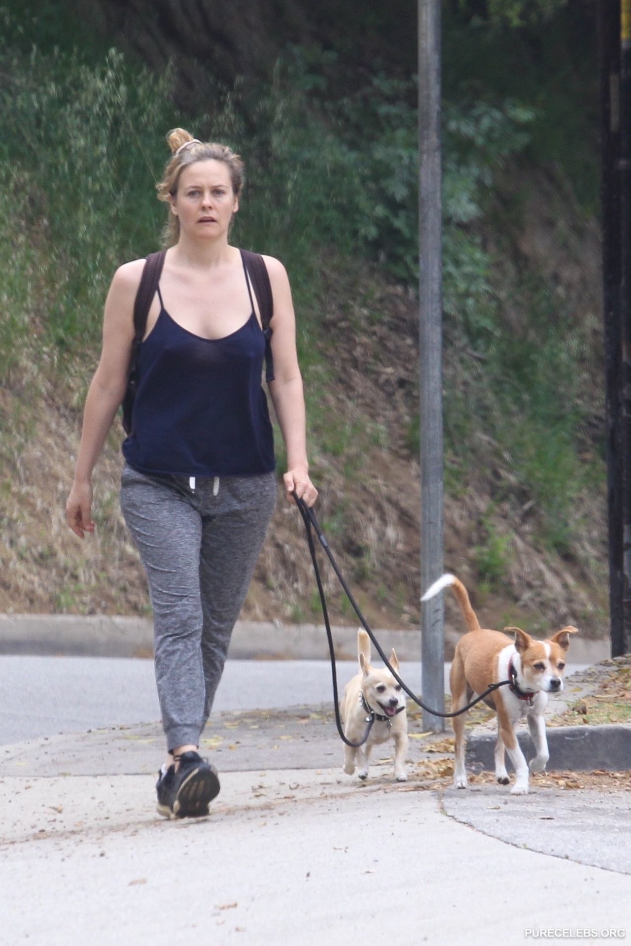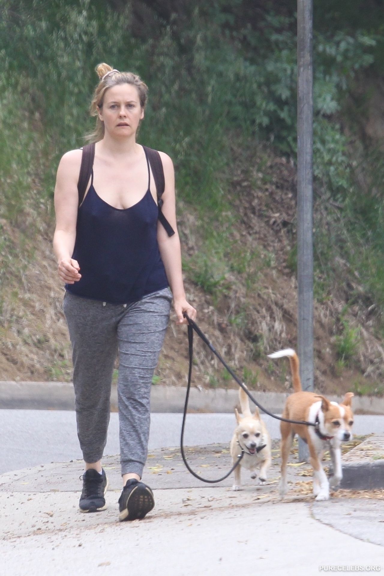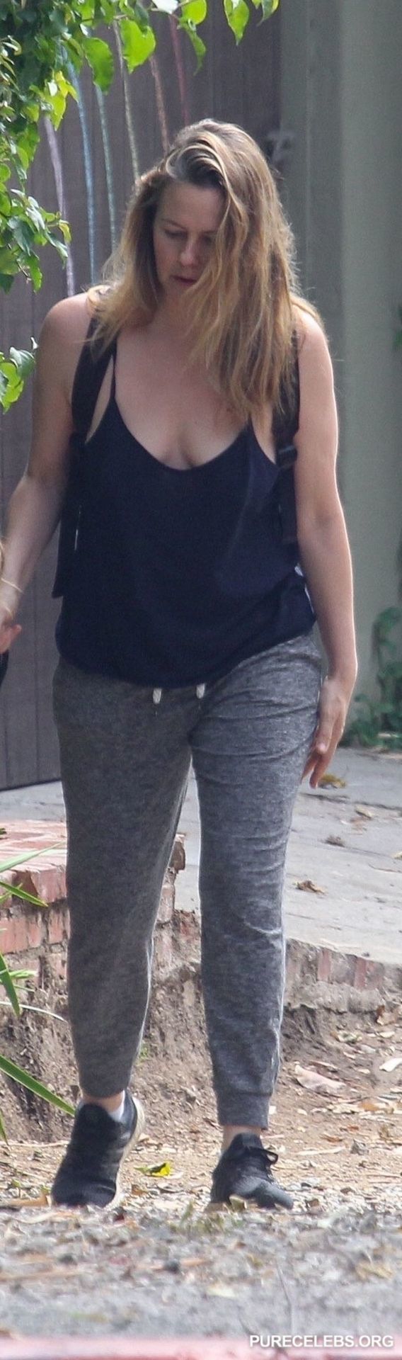 Hot blonde Alicia Silverstone nearly flashed her nude titties right on the street. Paparazzi photographed this celebrity when she was walking her dogs. This American actress was wearing gray sweatpants and a black top. In addition, she was braless. Therefore, through the thin fabric of the top, her poking nipples were clearly visible. And the top also had a very low neckline and it seemed that Alicia Silverstone’s nude tits could slip out of it at any moment.