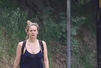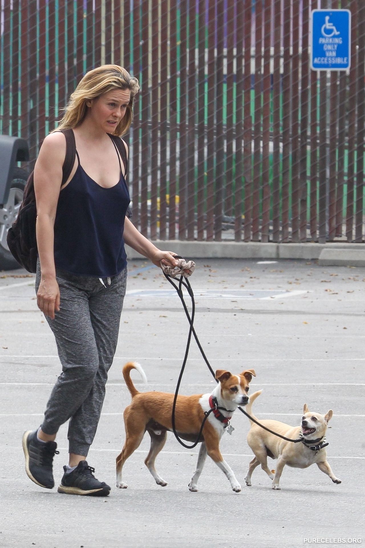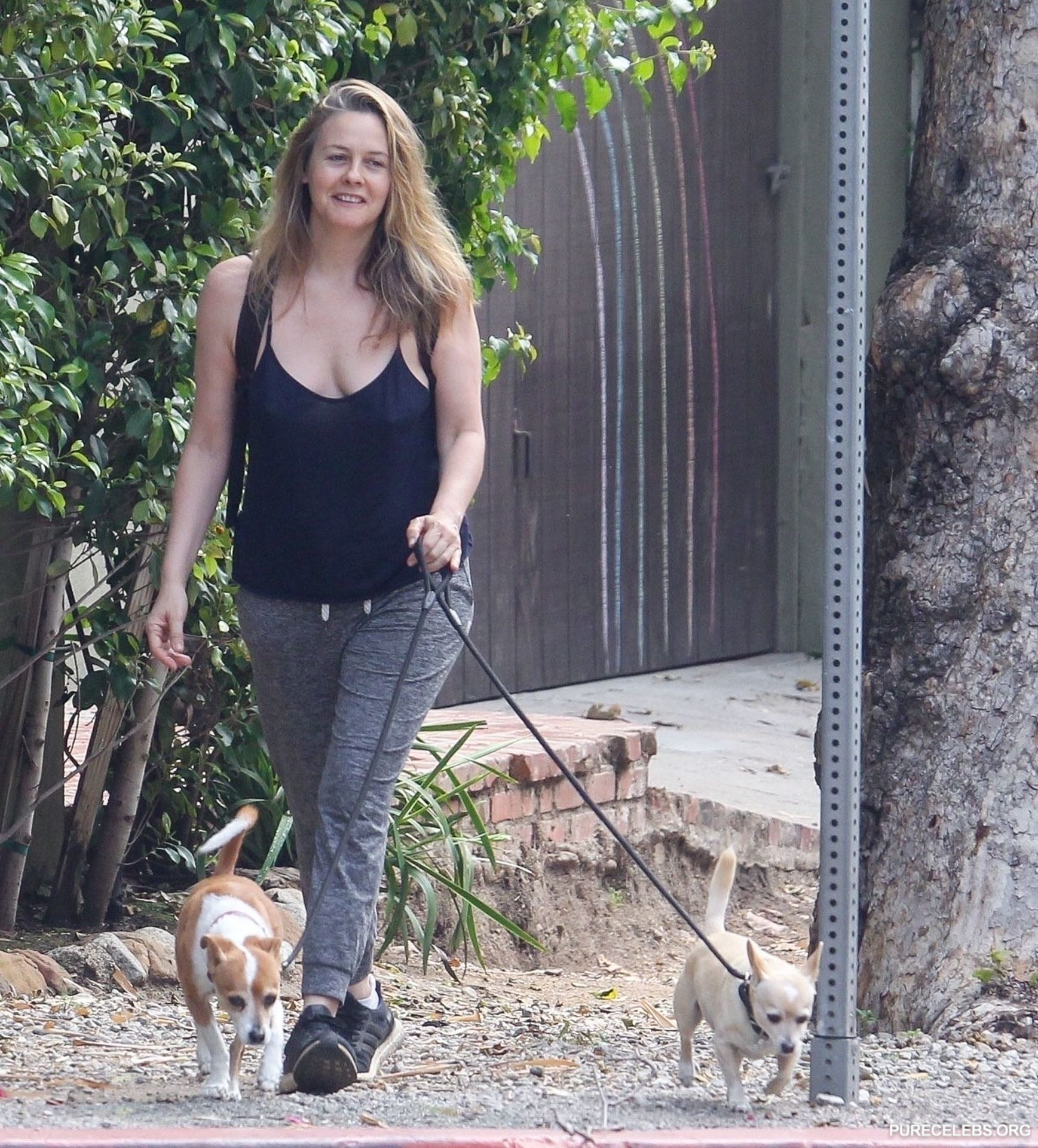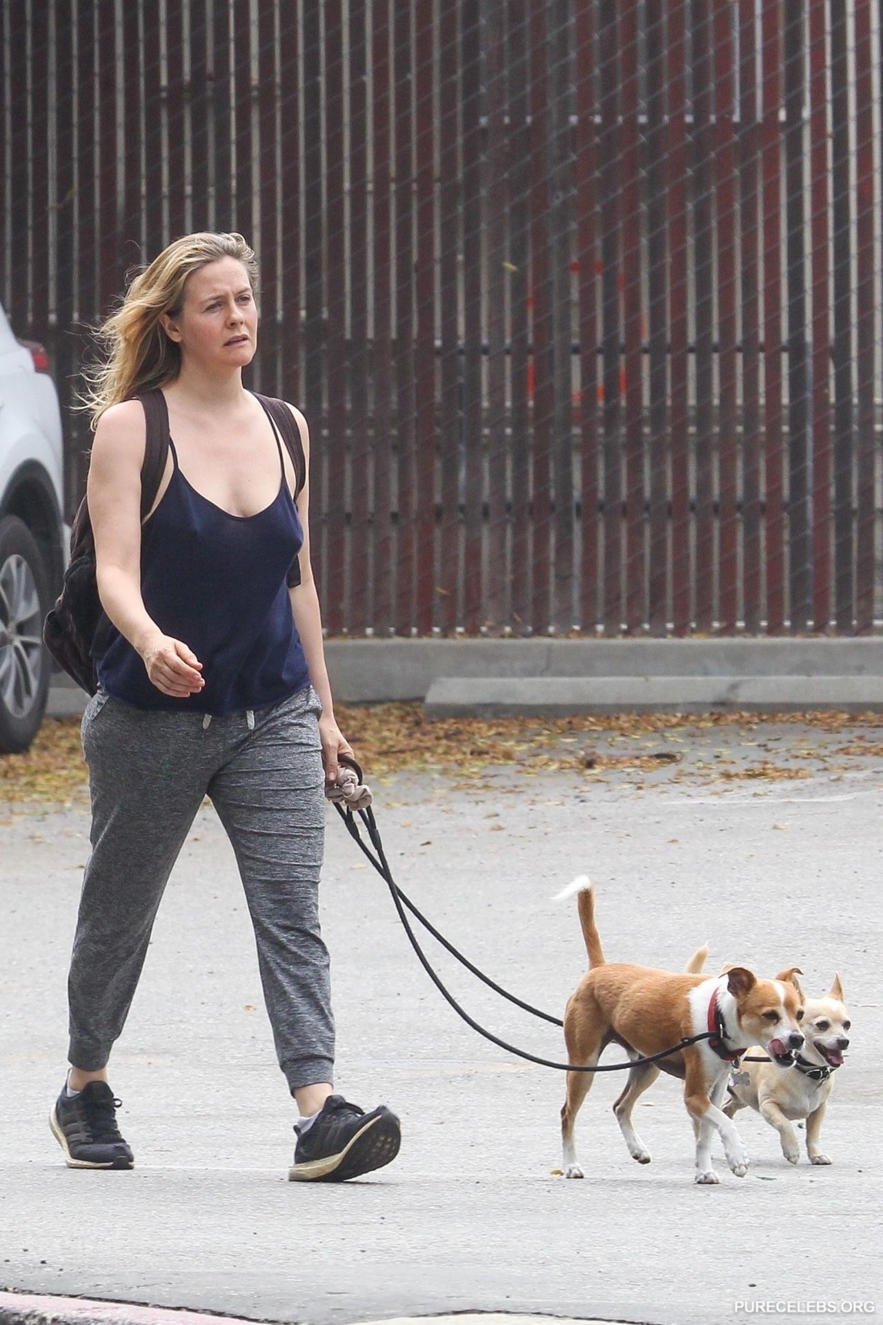 Hot blonde Alicia Silverstone nearly flashed her nude titties right on the street. Paparazzi photographed this celebrity when she was walking her dogs. This American actress was wearing gray sweatpants and a black top. In addition, she was braless. Therefore, through the thin fabric of the top, her poking nipples were clearly visible. And the top also had a very low neckline and it seemed that Alicia Silverstone’s nude tits could slip out of it at any moment.