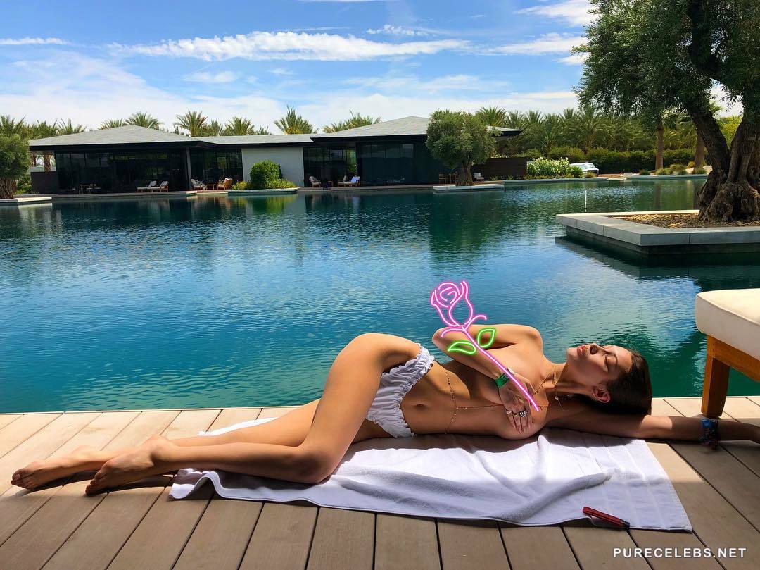 Bella Hadid treated us with some juicy photos that she posted online. She poses in see through shirts, exposing her big juicy boobs with dark nipples and large dark areolas clearly visible through the shirt. Later she poses in sexy bikini swim suits, now exposing her great legs as well. In the end she gets really daring and takes some topless photos which she thankfully shared with us.