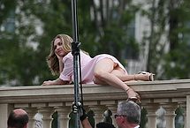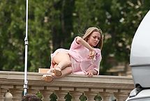 Model and actress Amanda Seyfried is a blonde beauty like you’ve never seen, and thanks to these candid photos, you can see her showing off her gorgeous body unknowingly. During a photo shoot in public, this slender honey is posed on a stone balcony railing in a short skirt and frilly shirt, and managed to give the paparazzi who made this enticing images a nice view of her ass and upskirt.