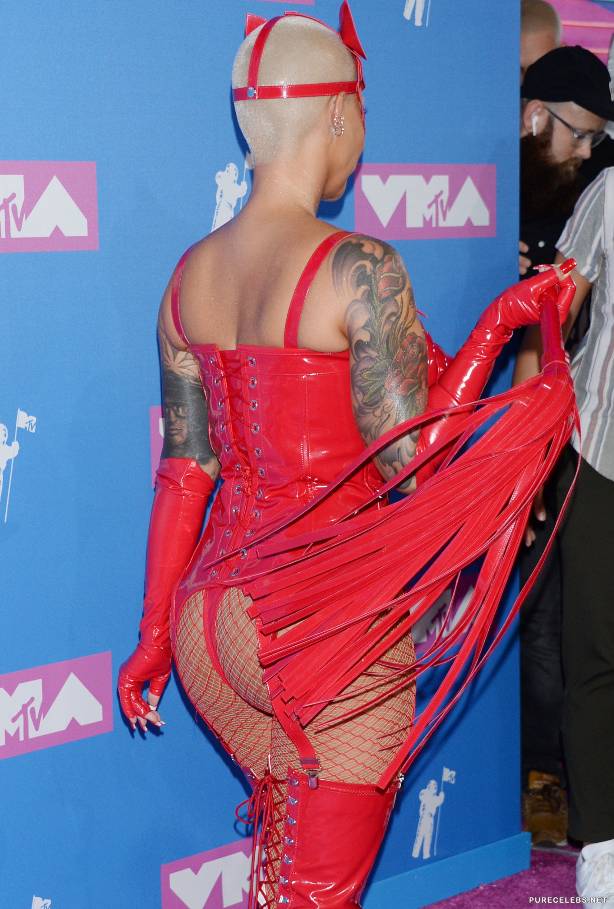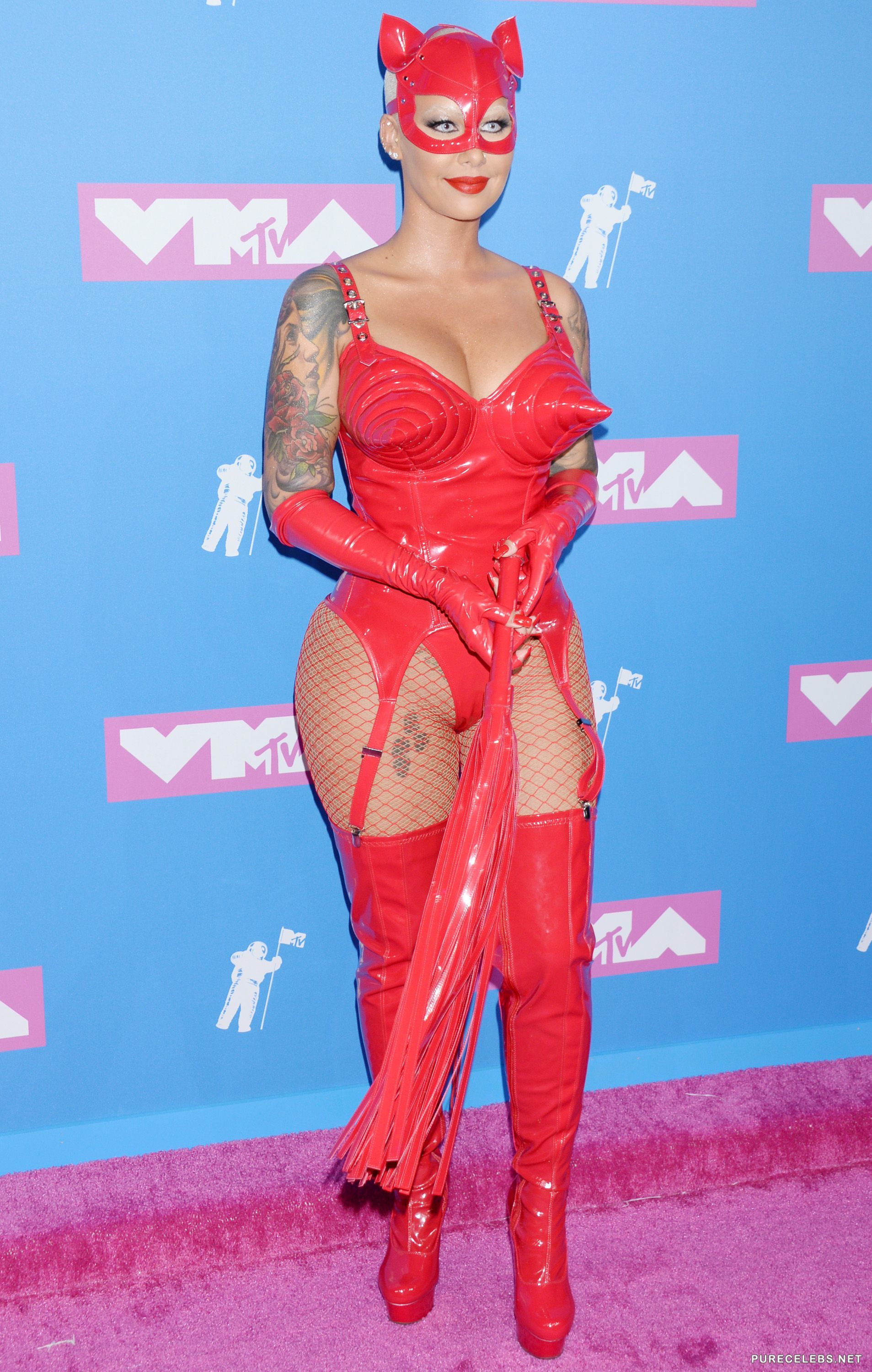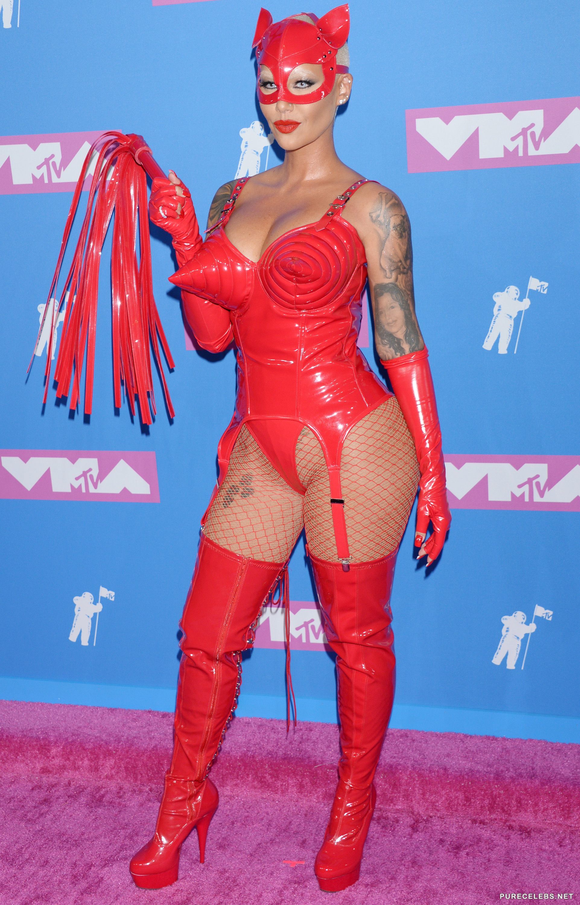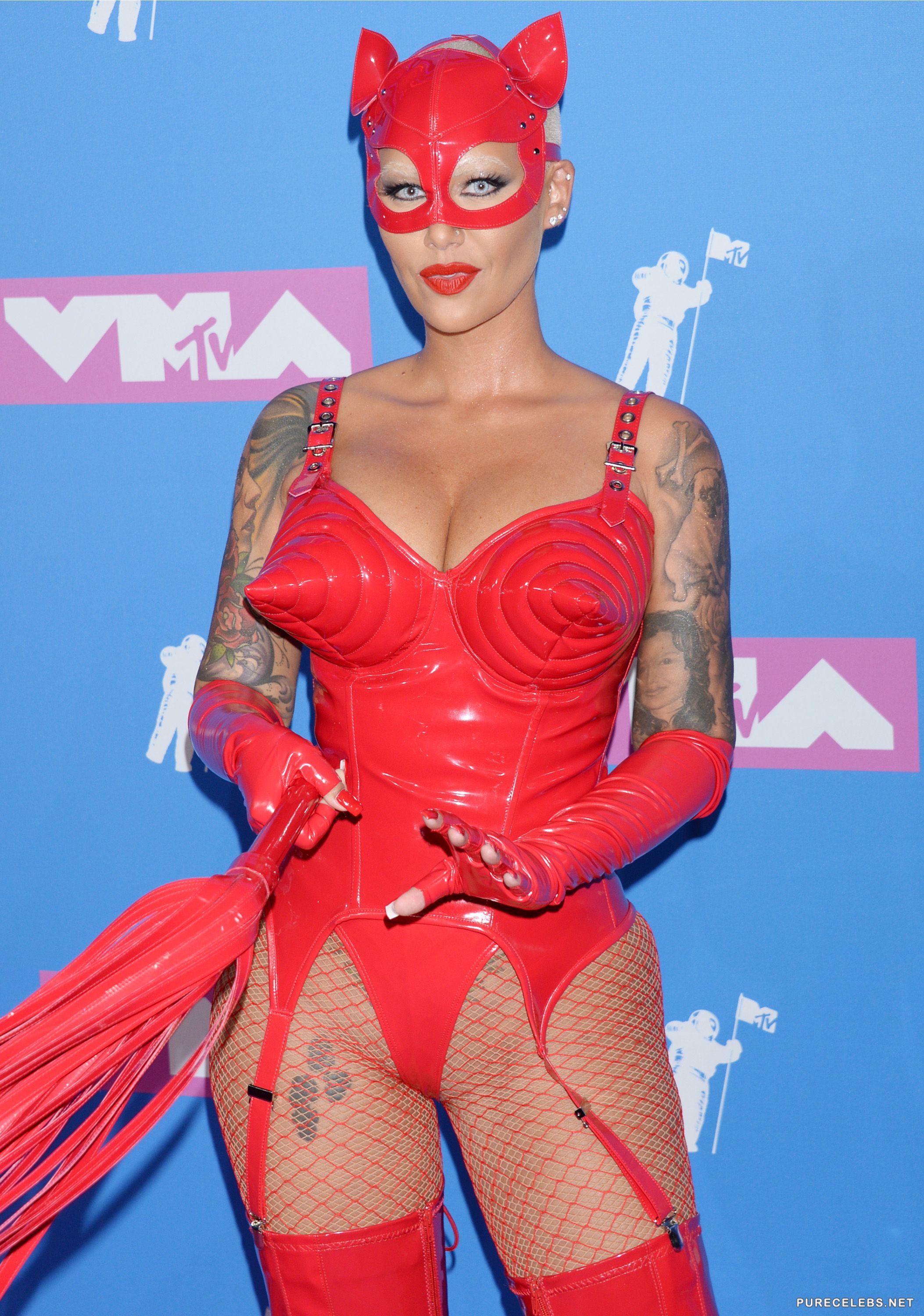Mouthwatering blonde with voluptuous curves and tattoos, Amber Rose has again made us gasp when she has published her BDSM inspired photos, wearing red, latex costume, fishnets, tiny panties and a mask while holding a whip. In the end of this gallery, there is a short video of this temptress, teasing and doing some seriously sexy stuff while sitting on the bed and touching herself in a very naughty way.