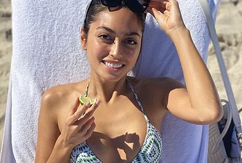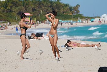 Filipina-Italian model Ambra Gutierrez does not mind boasting her chic body on the beach. This beauty took a lot of selfies on the beach to please her fans. The girl was wearing a white print bikini. Her bra was so small that it seemed Ambra Gutierrez nude boobies could jump out of it at any moment. By the way, her tanned butt in small panties looked great!