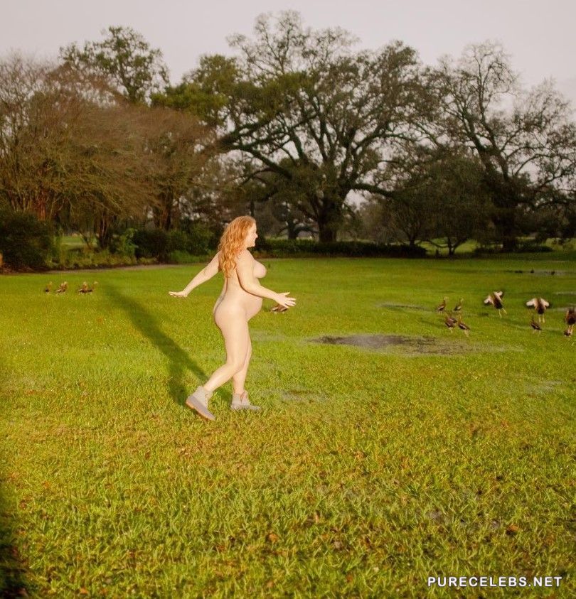 American actress Amy Schumer wants to show everyone that she is pregnant and also boast about the changes in her wonderful body. So she not only shows off her huge juicy boobs in her bra but also decided to make an absolutely nude photo session. Celebrity runs on a green field, completely naked, and we can enjoy the view and her huge beautiful melons and her peachy posterior.
