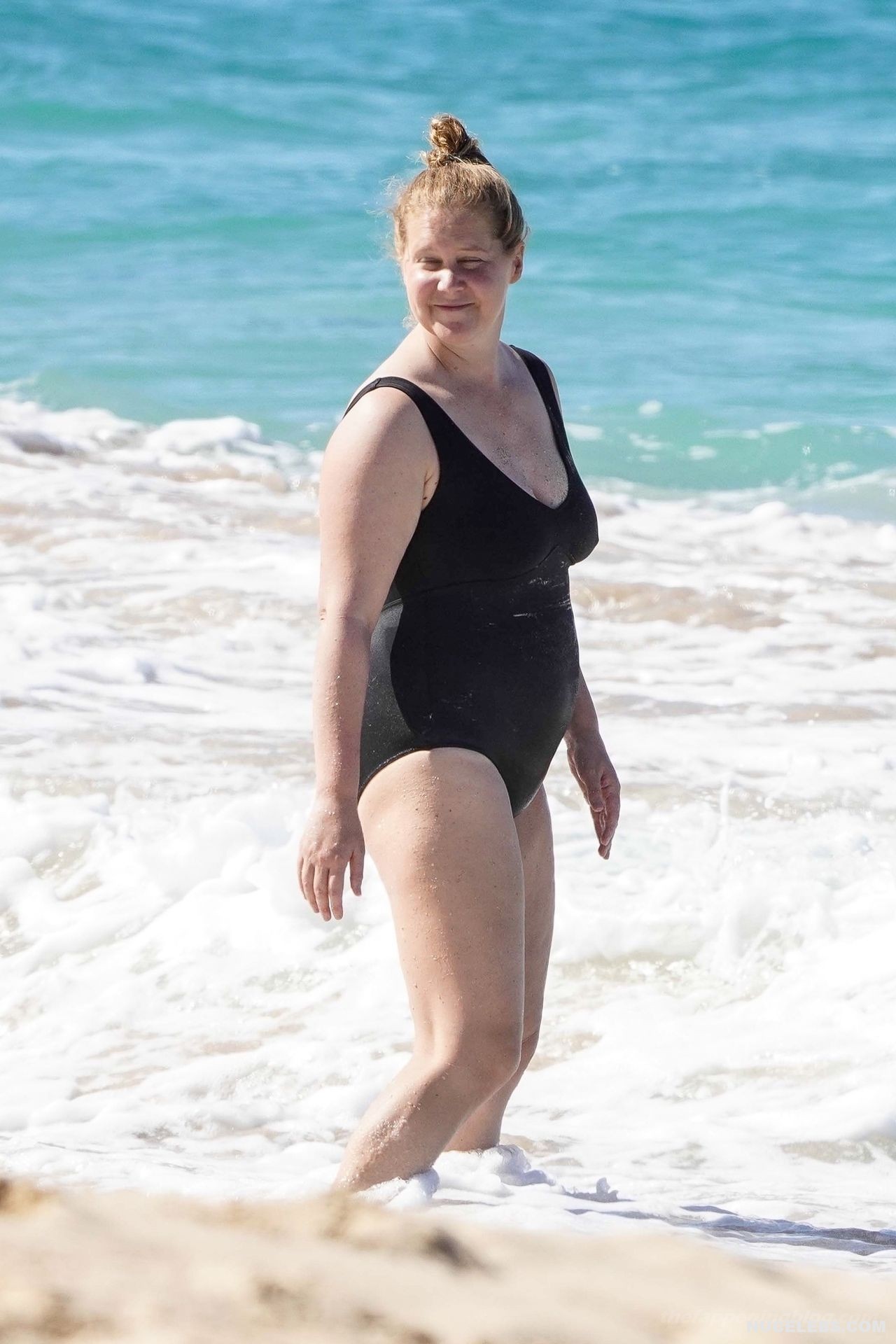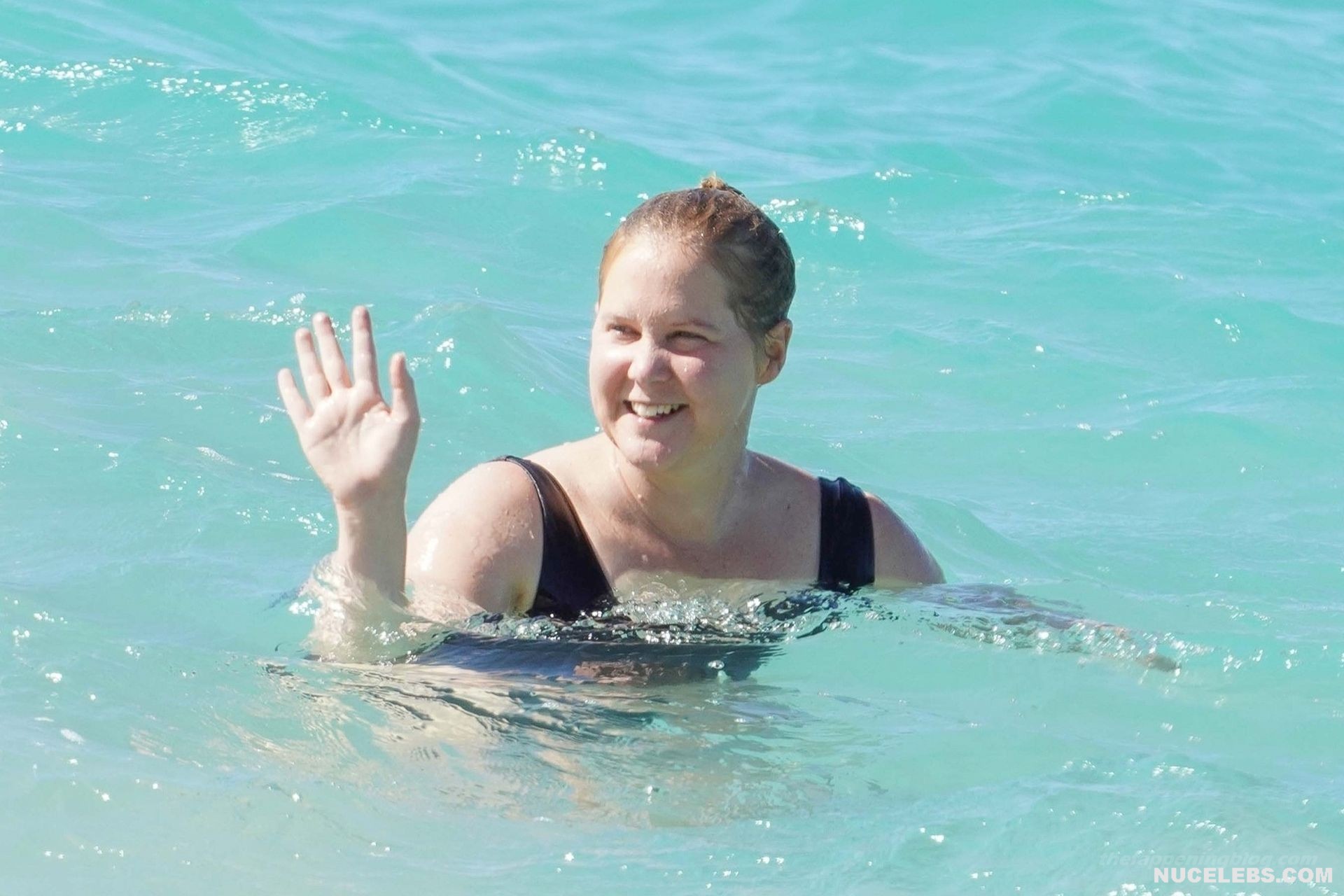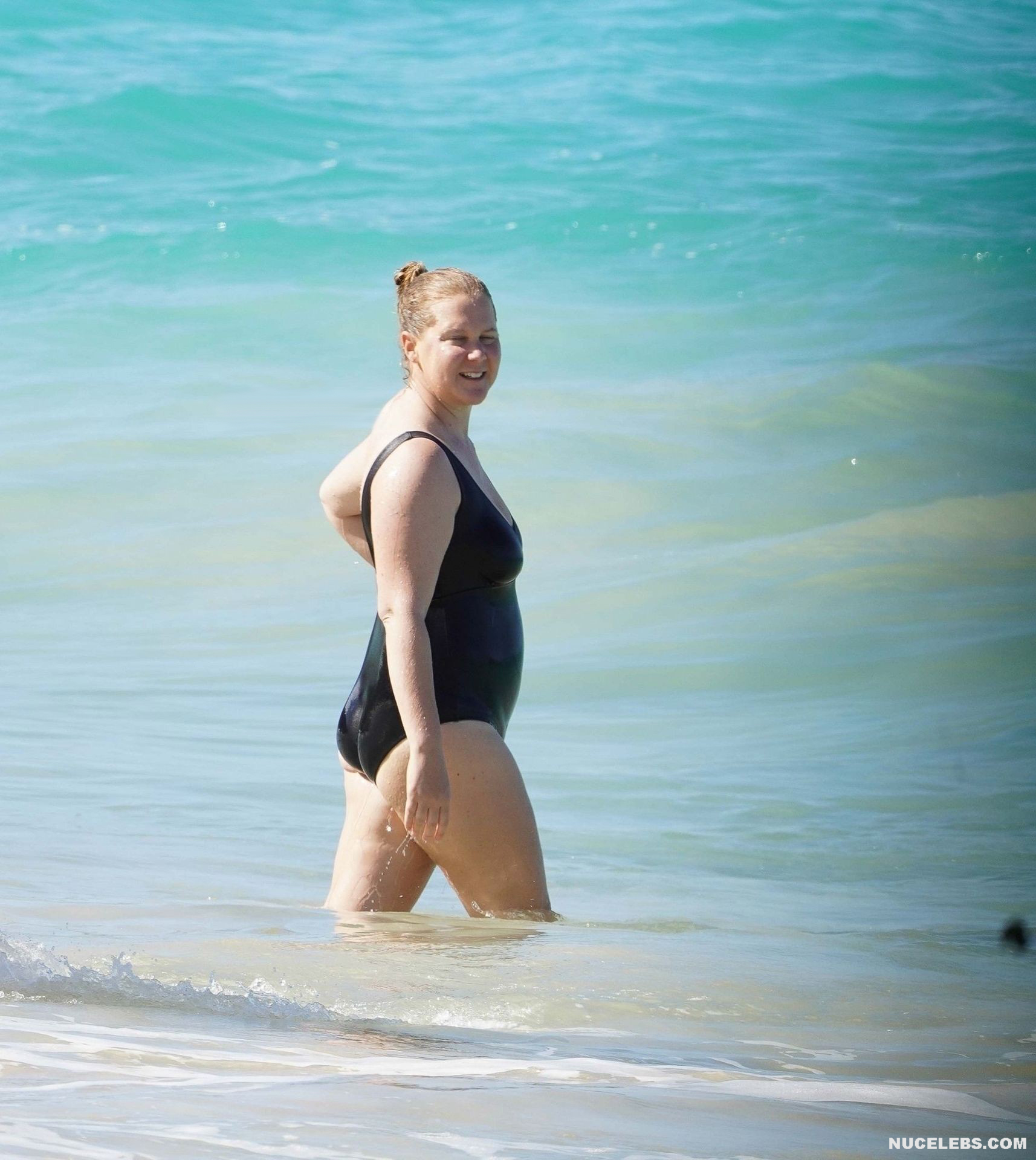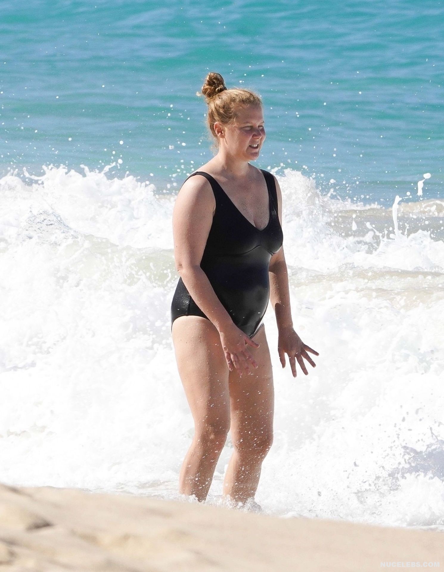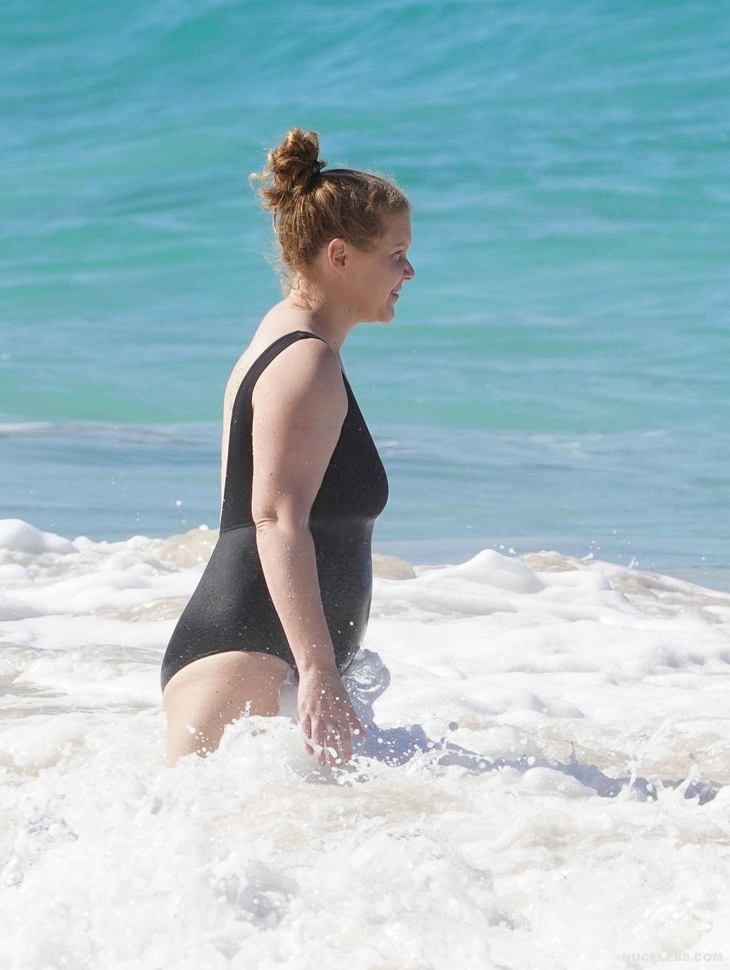 As you know, Amy Schumer takes great pride in her curvaceous forms and gladly demonstrates them whenever possible. So the paparazzi managed to photograph this American stand-up comedian during her beach vacation. This time, the celebrity was wearing a black swimsuit that fit her curves perfectly. The wet swimsuit fabric wrapped around her lovely ass as she stepped out of the sea. And Amy Schumer’s nude boobs were so huge in a swimsuit and it seemed they could slip out of her swimsuit at any moment.