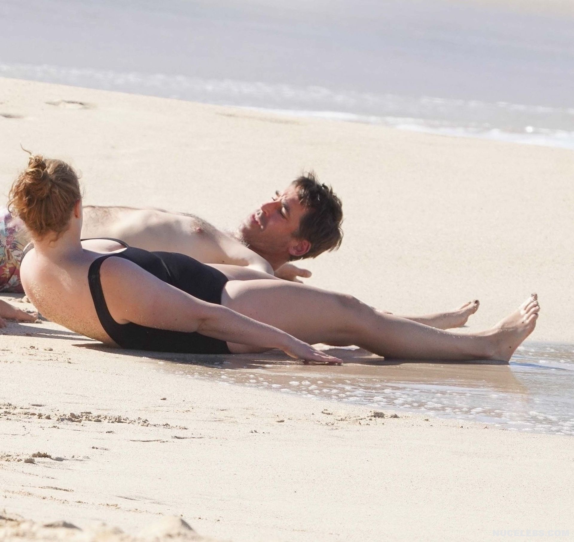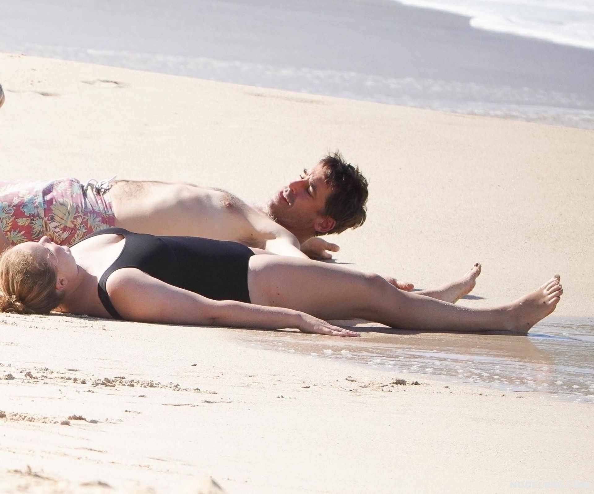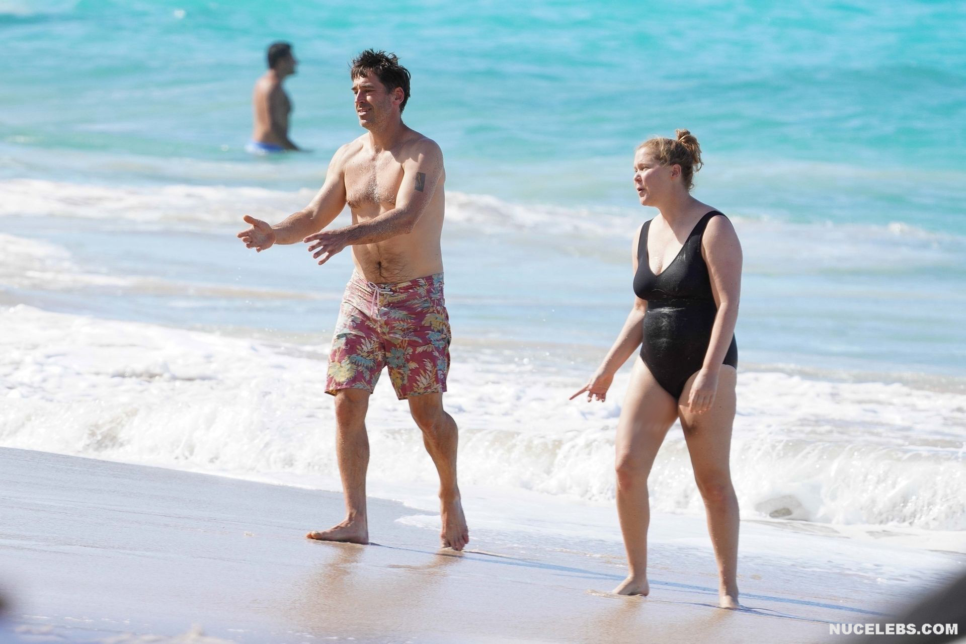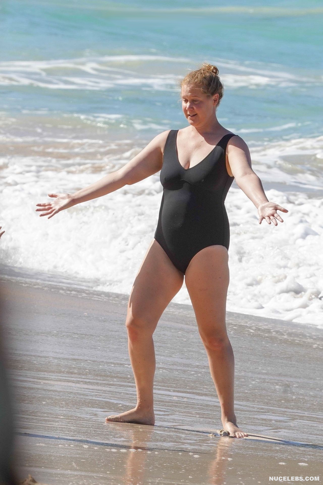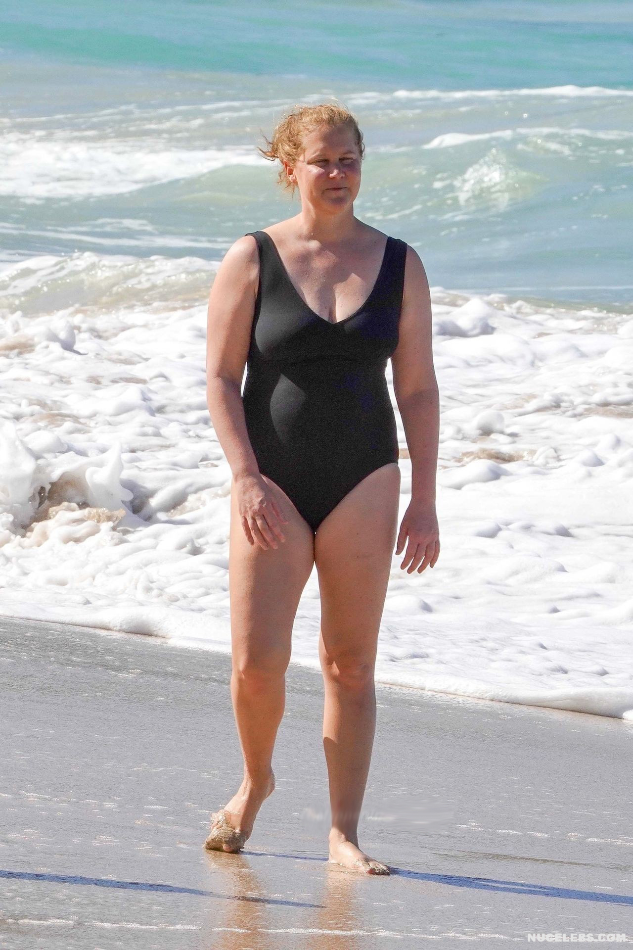 As you know, Amy Schumer takes great pride in her curvaceous forms and gladly demonstrates them whenever possible. So the paparazzi managed to photograph this American stand-up comedian during her beach vacation. This time, the celebrity was wearing a black swimsuit that fit her curves perfectly. The wet swimsuit fabric wrapped around her lovely ass as she stepped out of the sea. And Amy Schumer’s nude boobs were so huge in a swimsuit and it seemed they could slip out of her swimsuit at any moment.