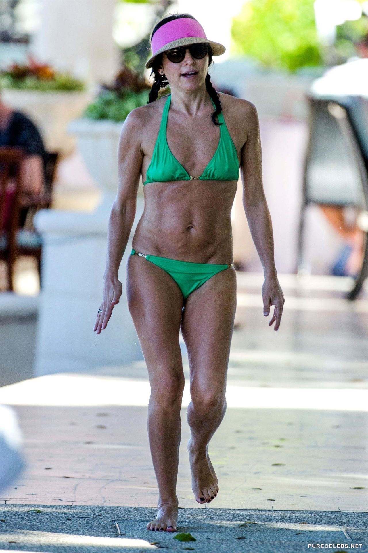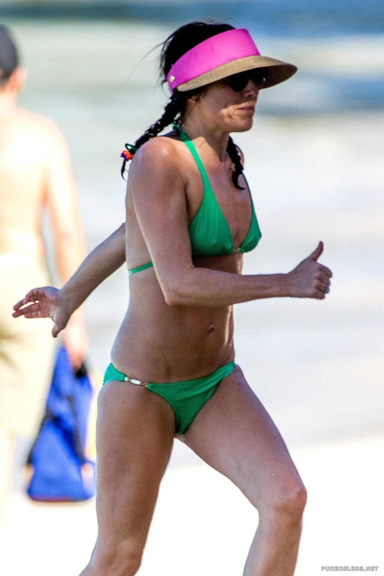 Remember the pop rock group “The Corrs”? Well this good looking woman is one of the members, Andrea Corr herself, looking good and wearing a two piece swimsuit for a day on the beach. She had braided hair and paired her green bikini with a pink hat, and we are not sure if she did it on purpose or she just grabbed the first thing that came to her hand.