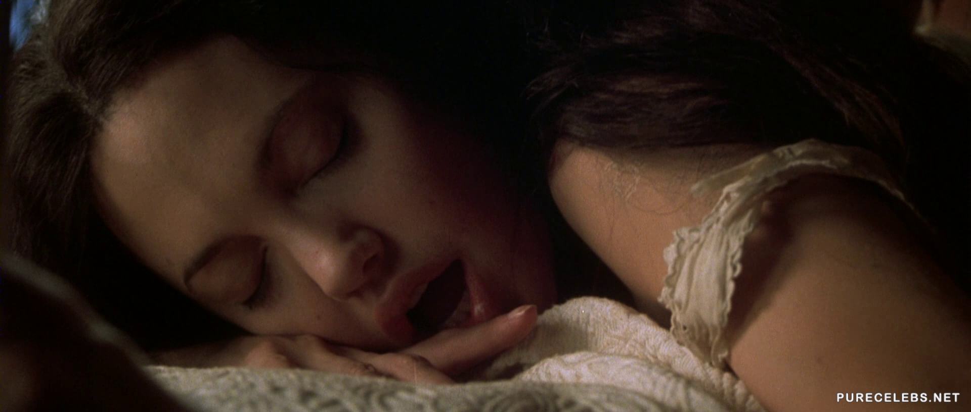 Here are some old shots of Angelina Jolie while she was hot and before she chopped off her large pretty tits. She is on her back on the bed and she is she is getting kissed while she is making moaning noises. She turns around and she then gets some doggy style action from the dude that is happy to hold her tits and ass in his hands.