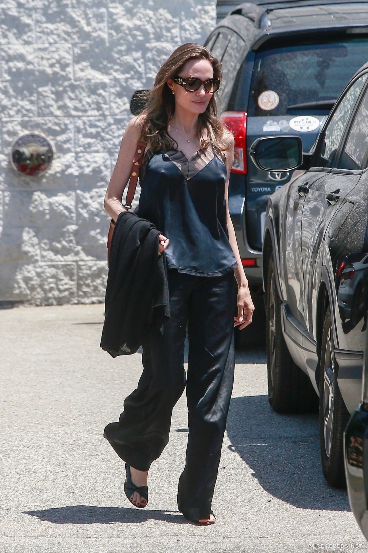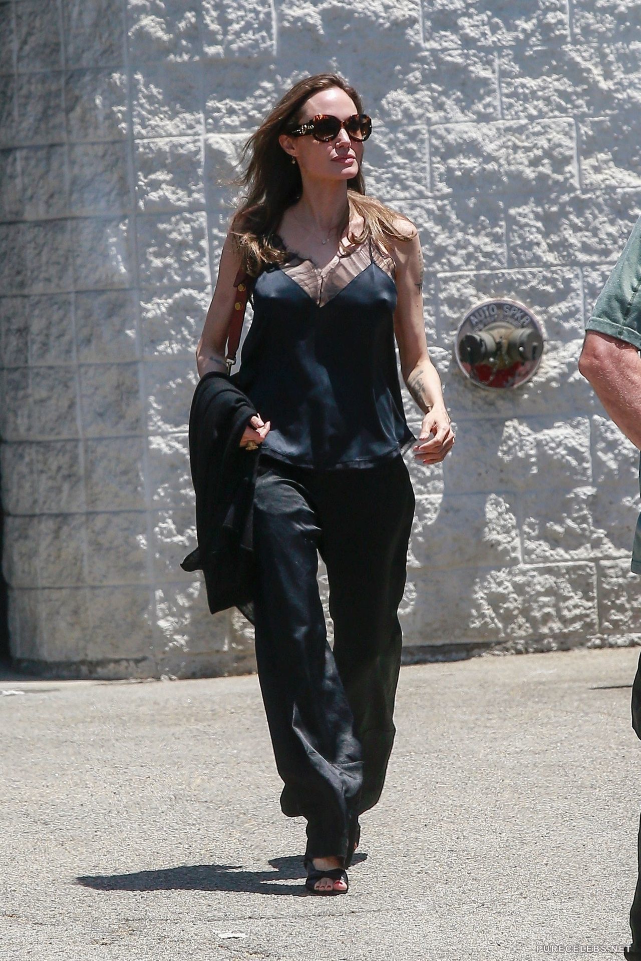 The sexiest Hollywood beauty Angelina Jolie has long been recognized as a model of fashion and style. Paparazzi are watching this charming actress day and night, trying to catch at least some moments of her personal life. Not so long ago, this celebrity was seen on the street in a black pantsuit and black sunglasses. Through her lace top, her poking nipples were clearly visible and it looked incredibly seductive!