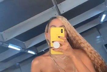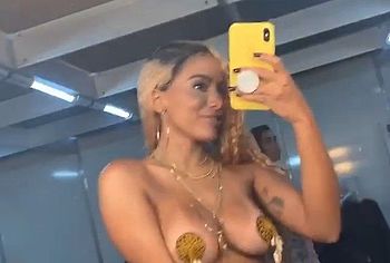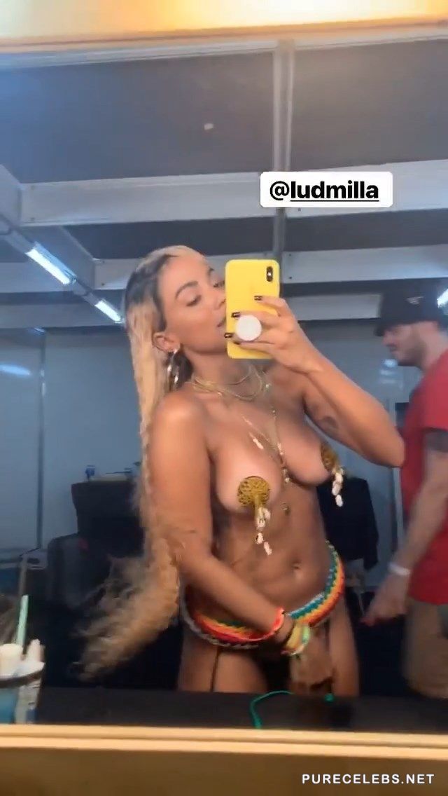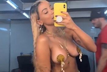 Anitta is topless in front of the mirror and the only thing covering her nipples are her pasties. The woman is snapping shots of her body in a sexy manner here and she is trying to look as sexy as possible for her fans. The top heavy blonde sure knows how to attract attention and give all the men watching her hard ons.