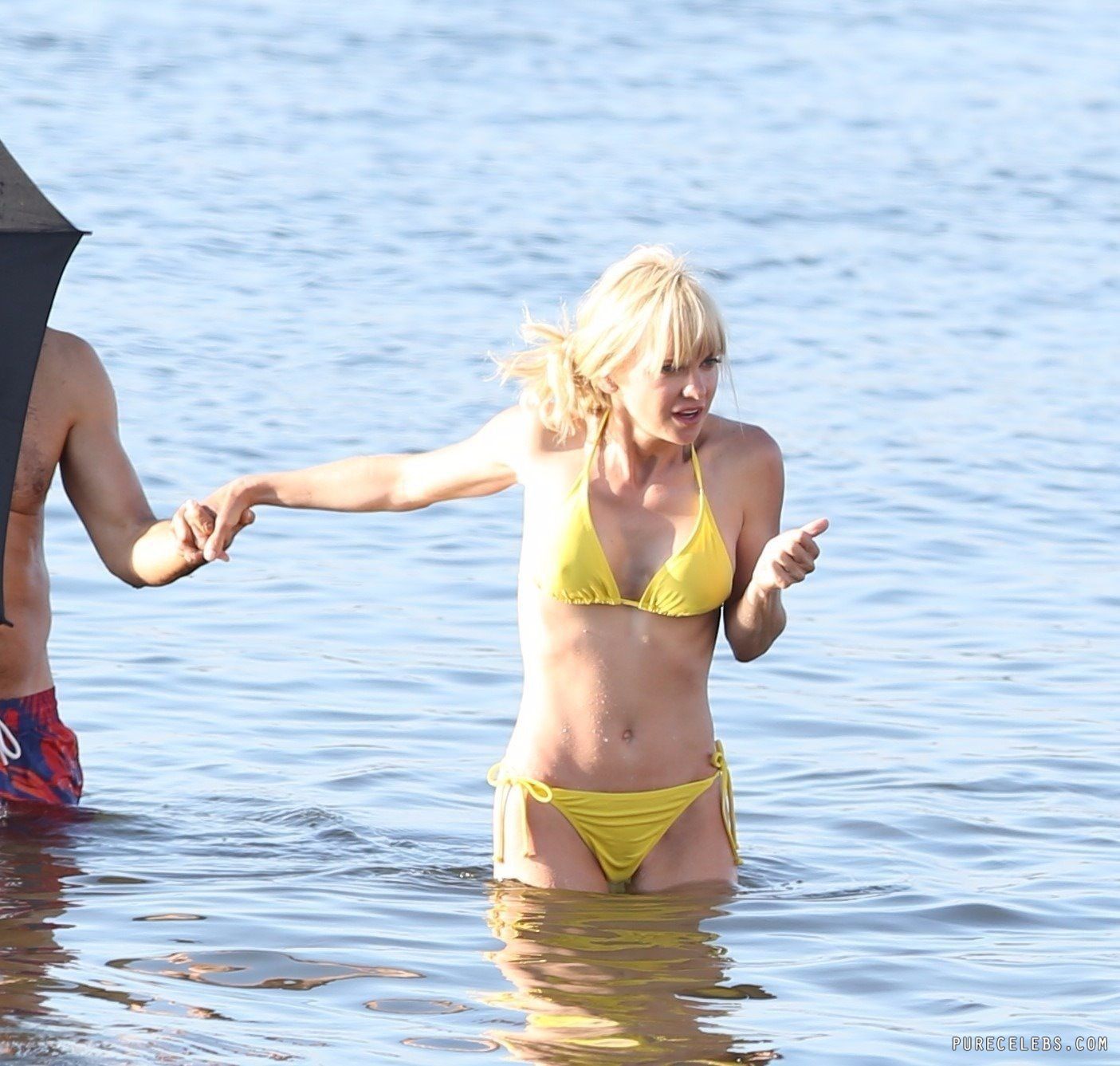Paparazzi caught Hollywood actress Anna Faris during her beach vacation. As it turned out, they were not in vain watching this charming blonde. Anna Faris was dressed in a small yellow bikini, which was barely covered her nude body. Her sweet petite boobies in a small bra were breathtaking. And besides, the paparazzi managed to photograph the gorgeous cameltoe of Anna Faris when she came out of the water.