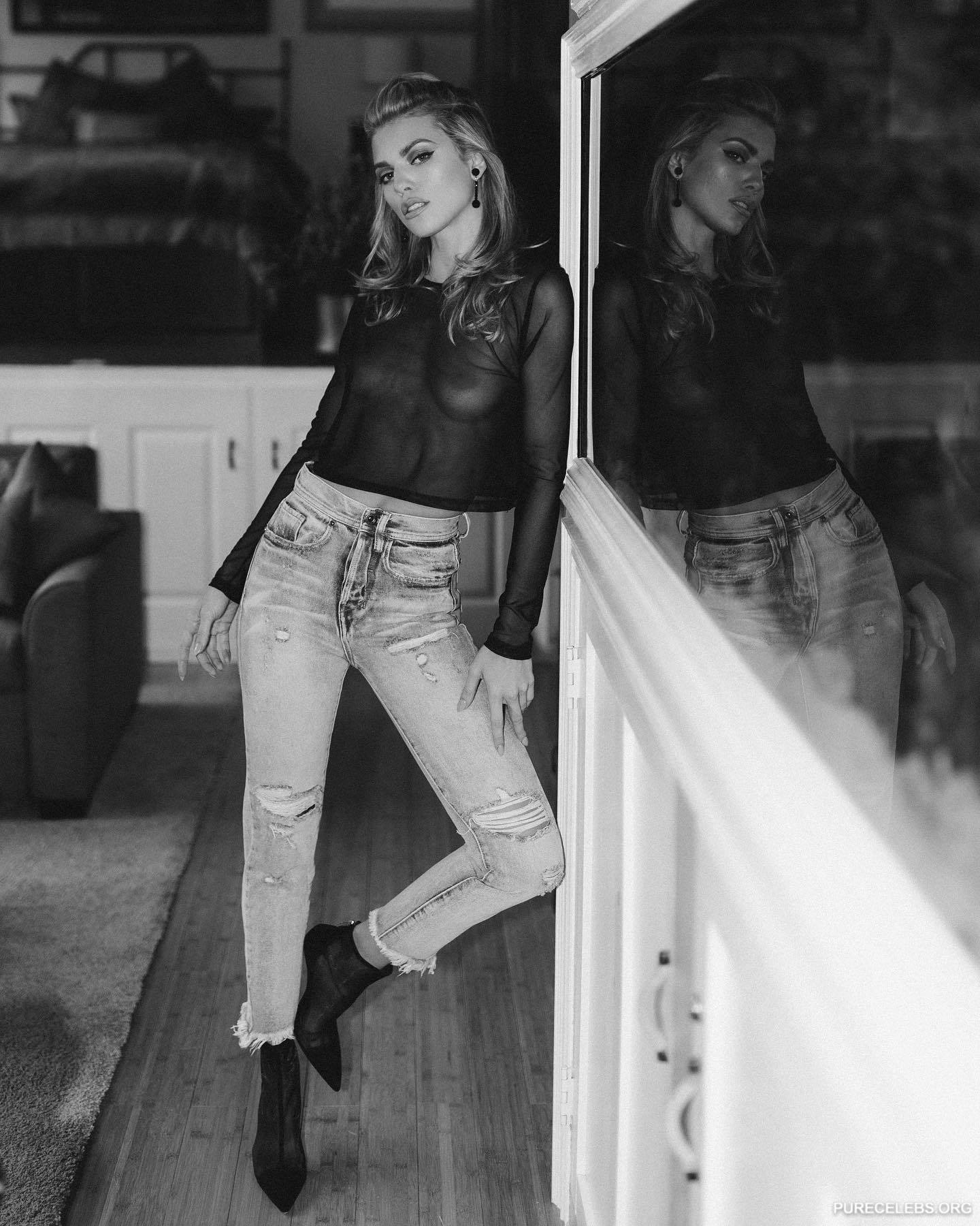 You will be delighted when you see nude and lingerie photos of the charming blonde AnnaLynne McCord. This American actress enjoyed posing in jeans and a transparent black blouse through which her breasts were visible. Also, this celebrity boasted her narrow waist and awesome ass in sexy lingerie. But AnnaLynne McCord did not stop there and posed topless near the mirror, flaunting her nude boobies.