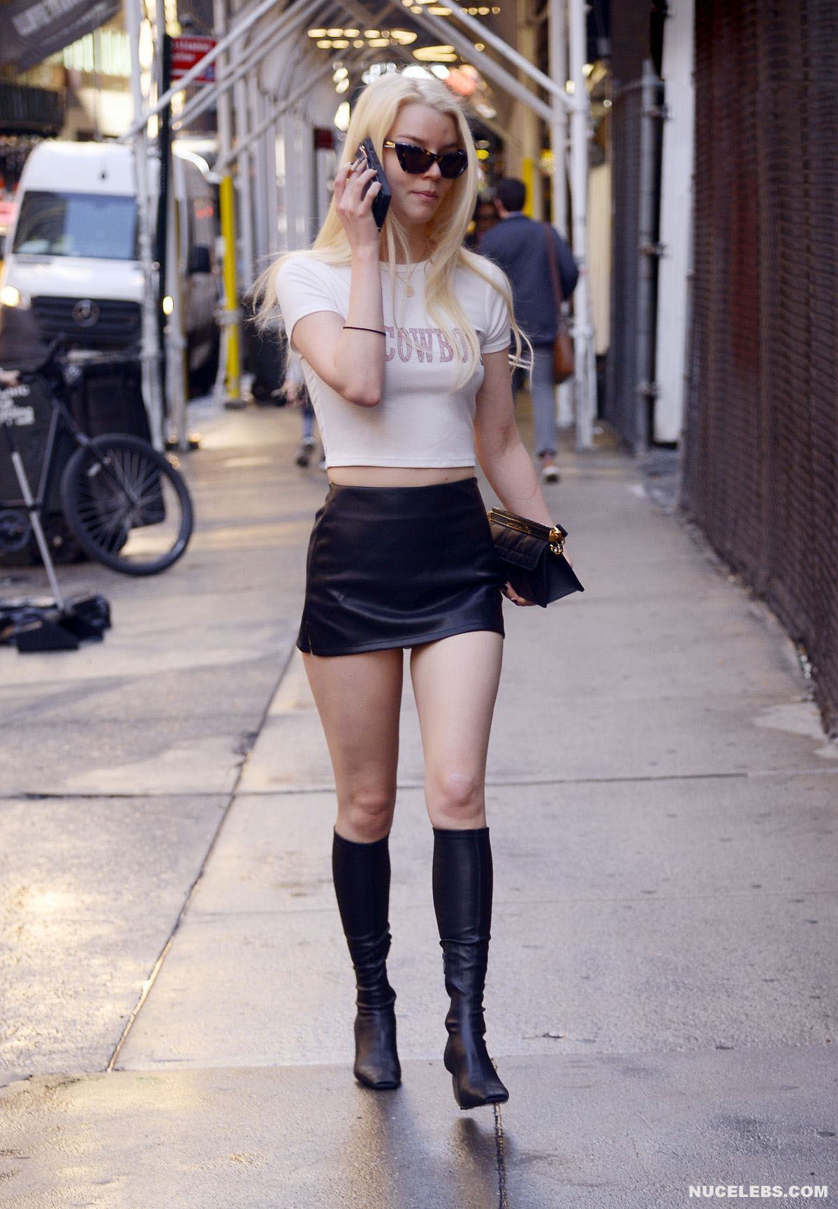 Anya Taylor-Joy will charm you with her stunning appearance! This 28-year-old actress was spotted on the street wearing a very provocative outfit. So, Anya Taylor-Joy’s poking nipples were clearly visible through her white crop top. The girl was also wearing a miniature leather skirt and leather boots. Her skirt was so short that it bounced when she walked. So it’s no surprise that Anya Taylor-Joy’s panties were showing as she walked down the street.