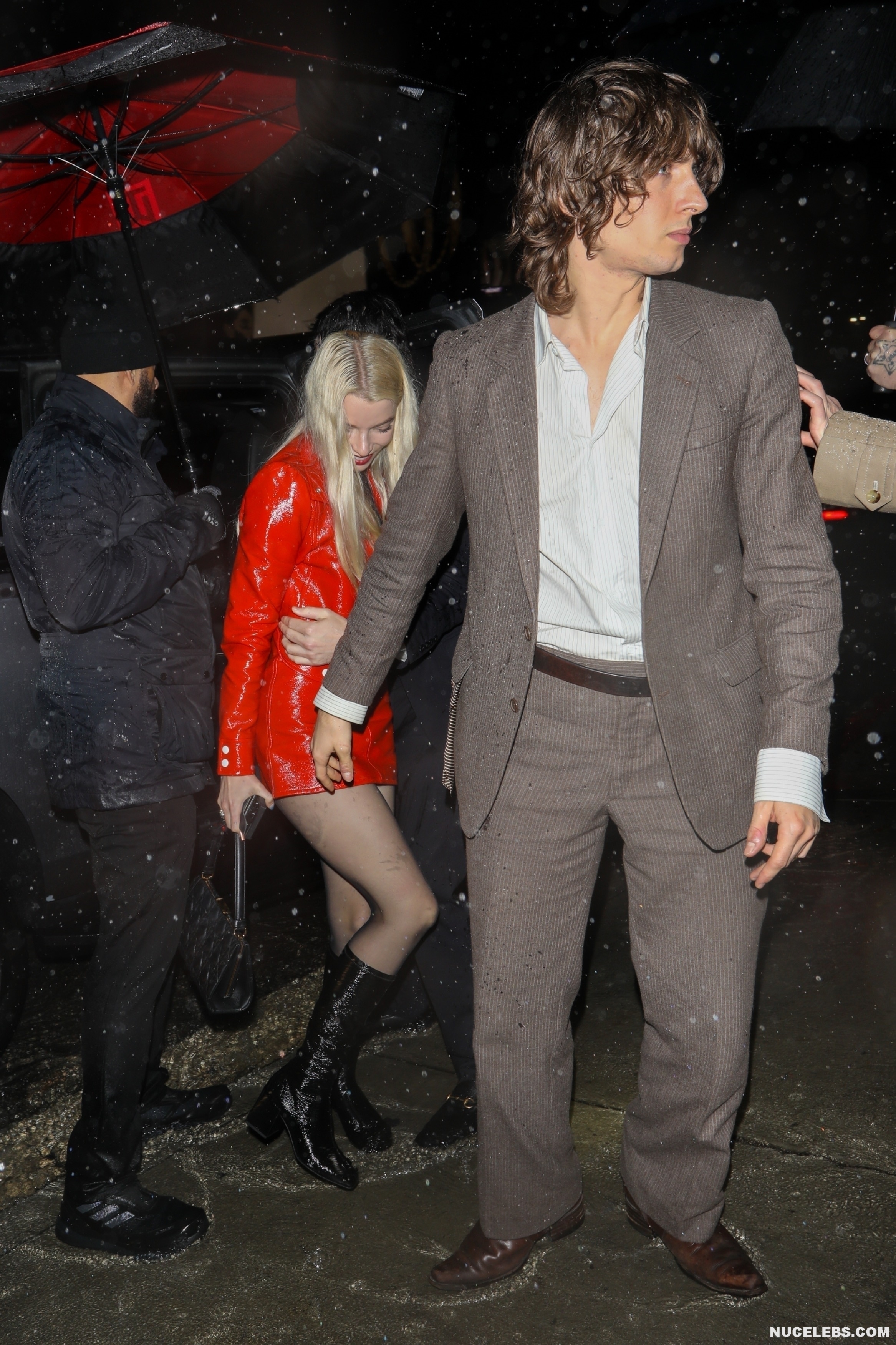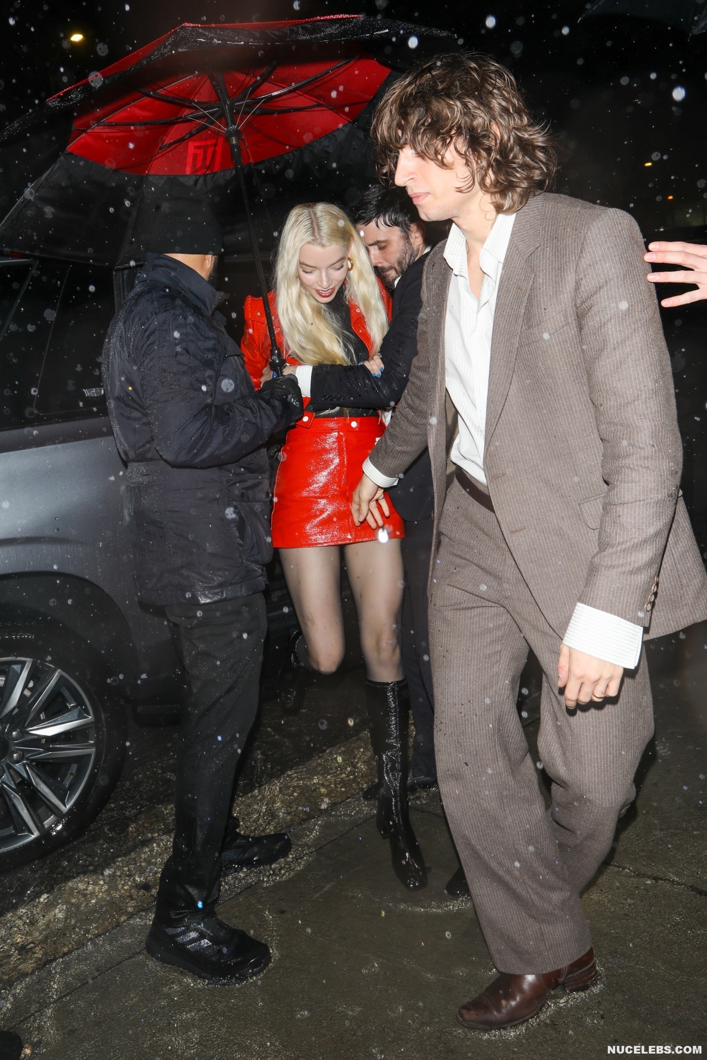 It was easy for the paparazzi to take Anya Taylor-Joy upskirt photos. While this 27-year-old star got out of the car and security guards tried to cover her with umbrellas from the rain, all the attention of the paparazzi was focused on her outfit. This time the actress was wearing a red patent leather jacket and a miniskirt of the same color. It was at those moments when the girl got out of the car that the skirt jumped up a little, and Anya Taylor-Joy’s panties became visible.