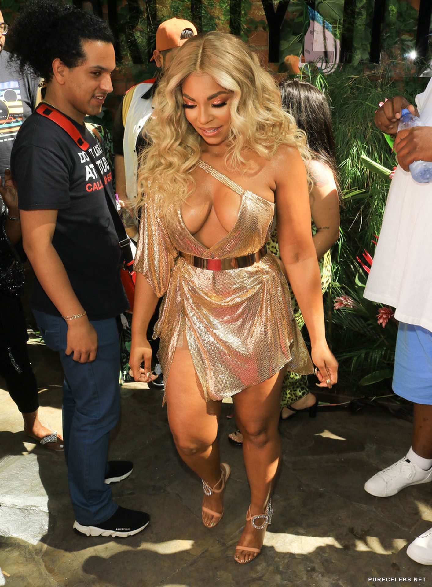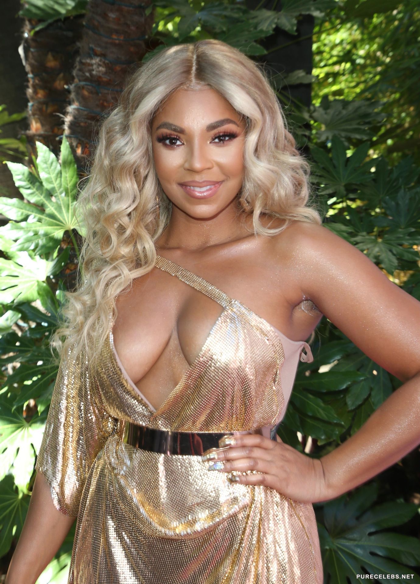 American singer Ashanti used to always look brilliant and attract all views to herself. Not so long ago, the star arrived at the event, wearing a gold-fitting dress, which remarkably emphasized her gorgeous figure. Charming blonde decided to boast his huge breasts, so the dress was a huge neckline, which showed the sides of her juicy boobs. This hot babe will make you dream of her all night long!