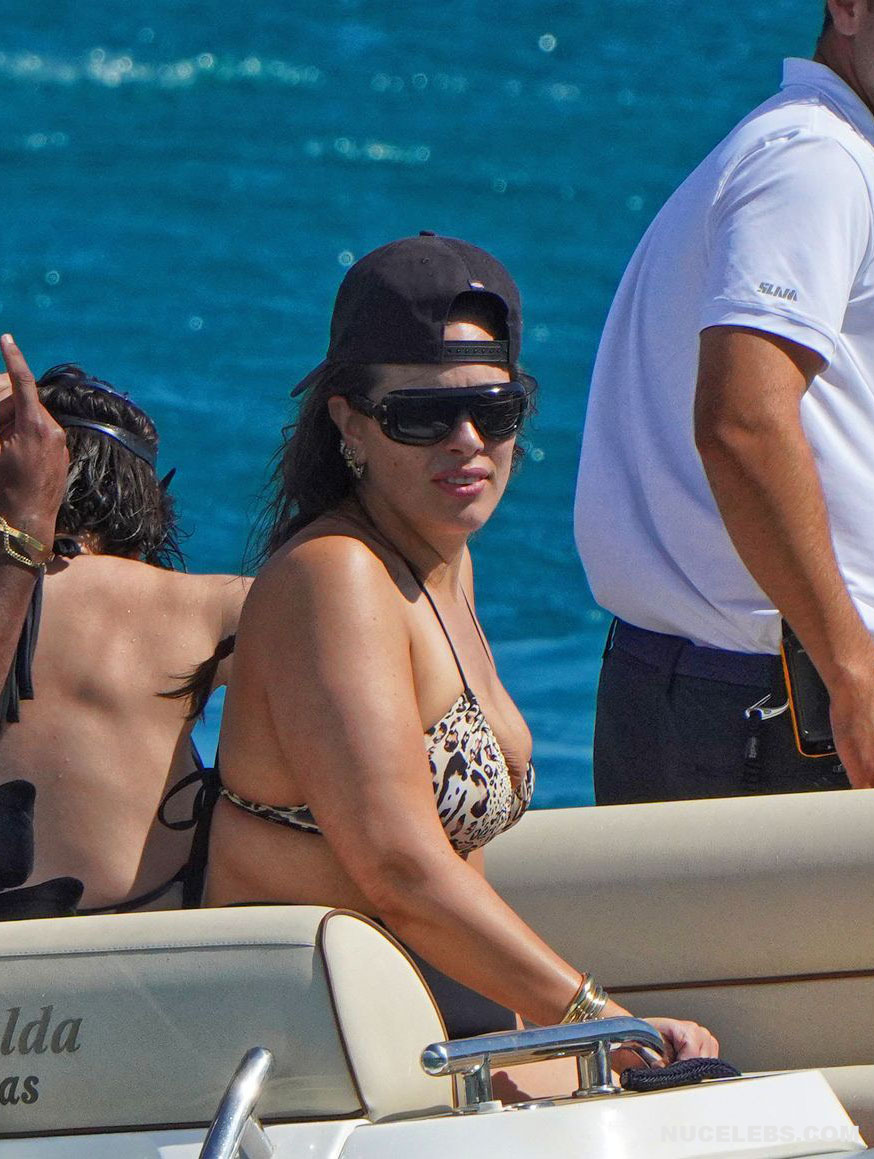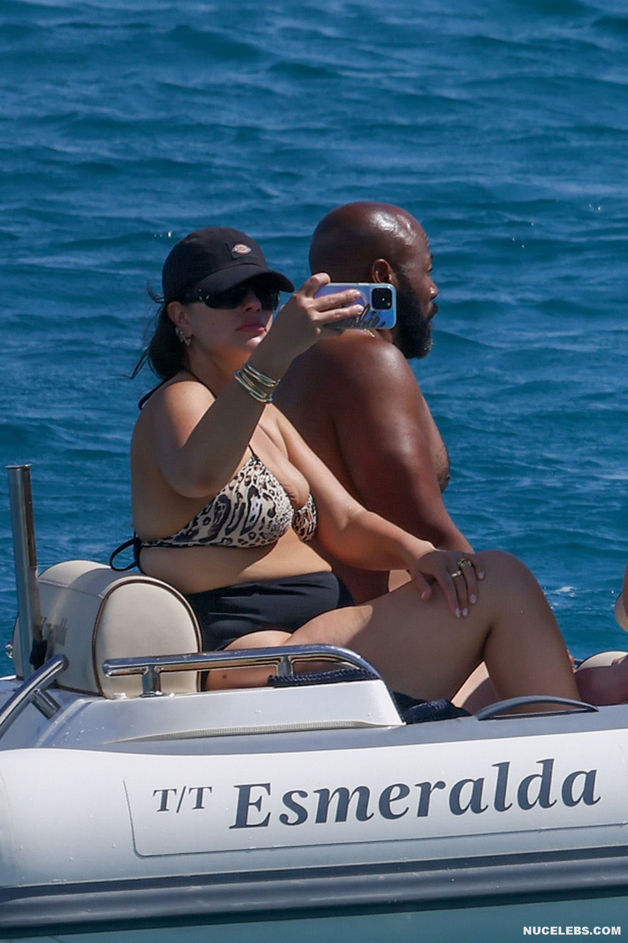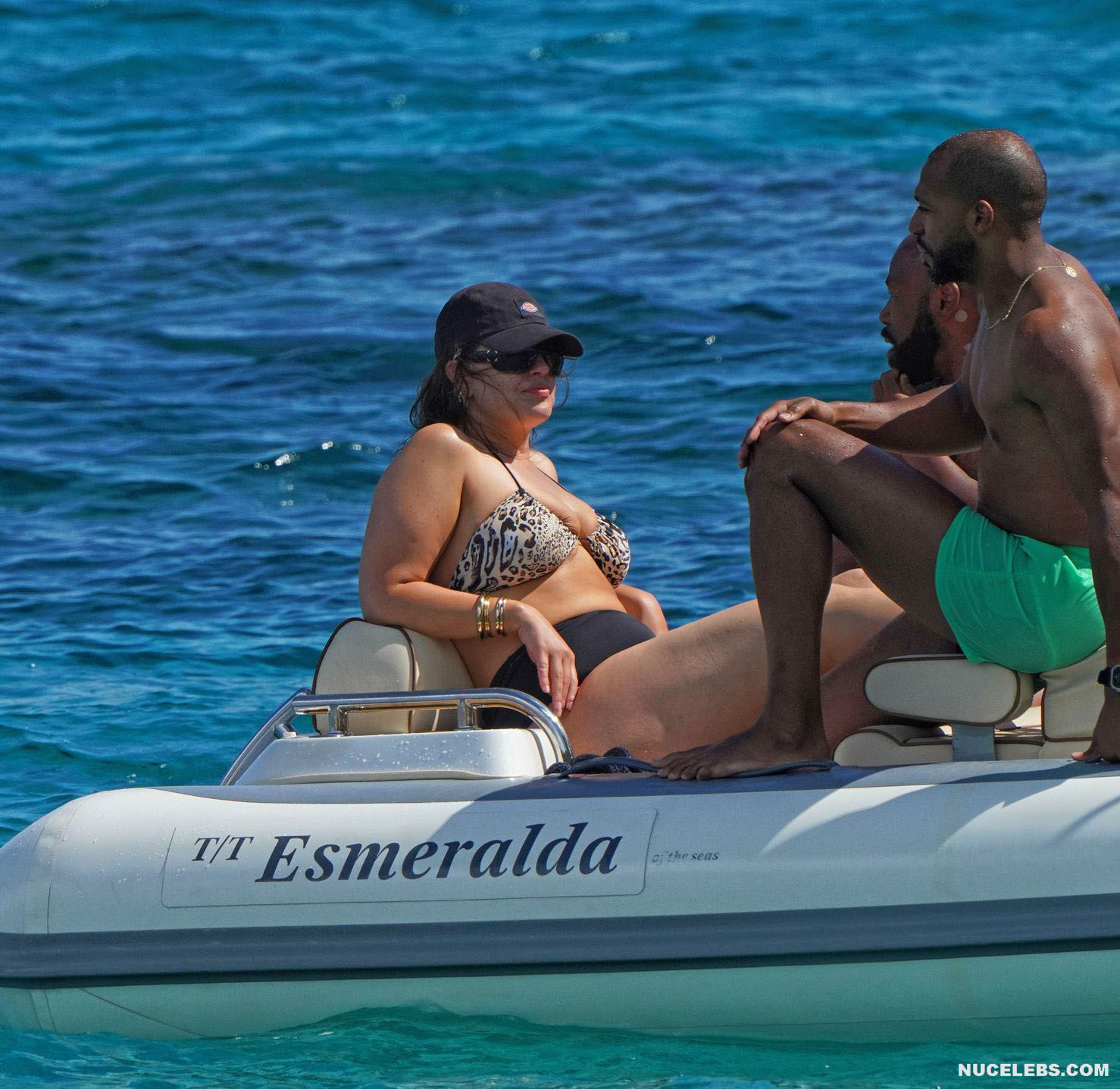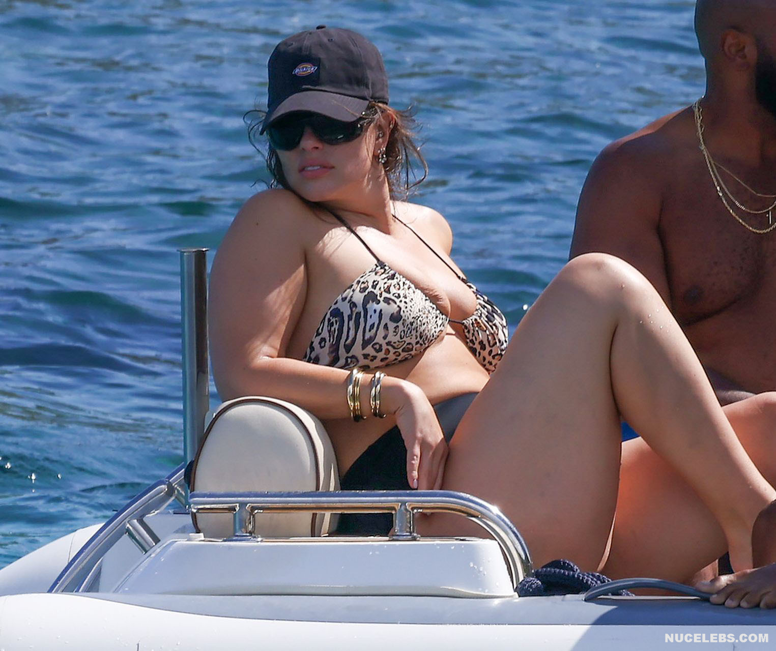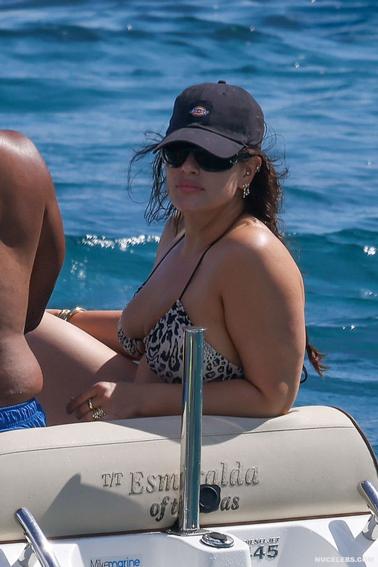 Step into the thrilling world of Ashley Graham as she transforms her yacht into an adventure haven. Get a glimpse of unscripted joy as this relaxes in a bikini in animal print. The celebrity also wore sunglasses and a black cap. Ashley Graham looked absolutely relaxed as she sailed the sea on a speedboat. Maybe that’s why Ashley Graham didn’t notice how her nude boob slipped out of her small bra and her nipple was exposed?