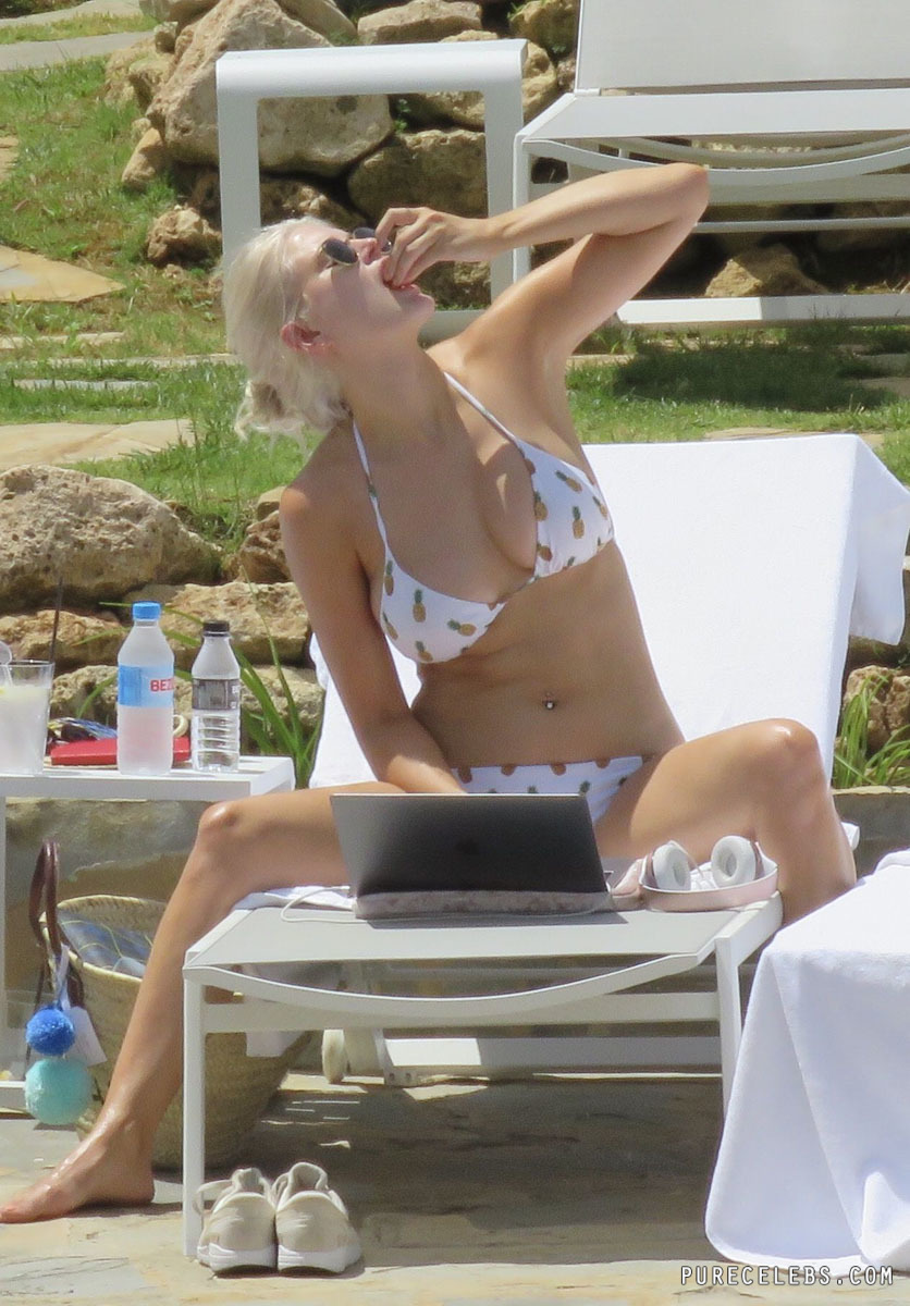 Paparazzi caught the TV star Ashley James during her beach vacation. The girl had a great time sunbathing and working on her laptop. Ashley James looked beautiful in her white bikini, and she did not need to be nude to attract the attention of the public. Her huge melons were ready to jump out of a small white bra at any moment. And her little panties emphasized the celebrity’s flat belly with a navel piercing and her beautiful hips.