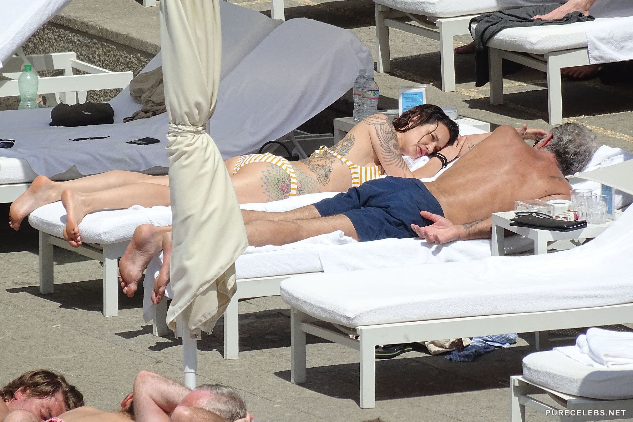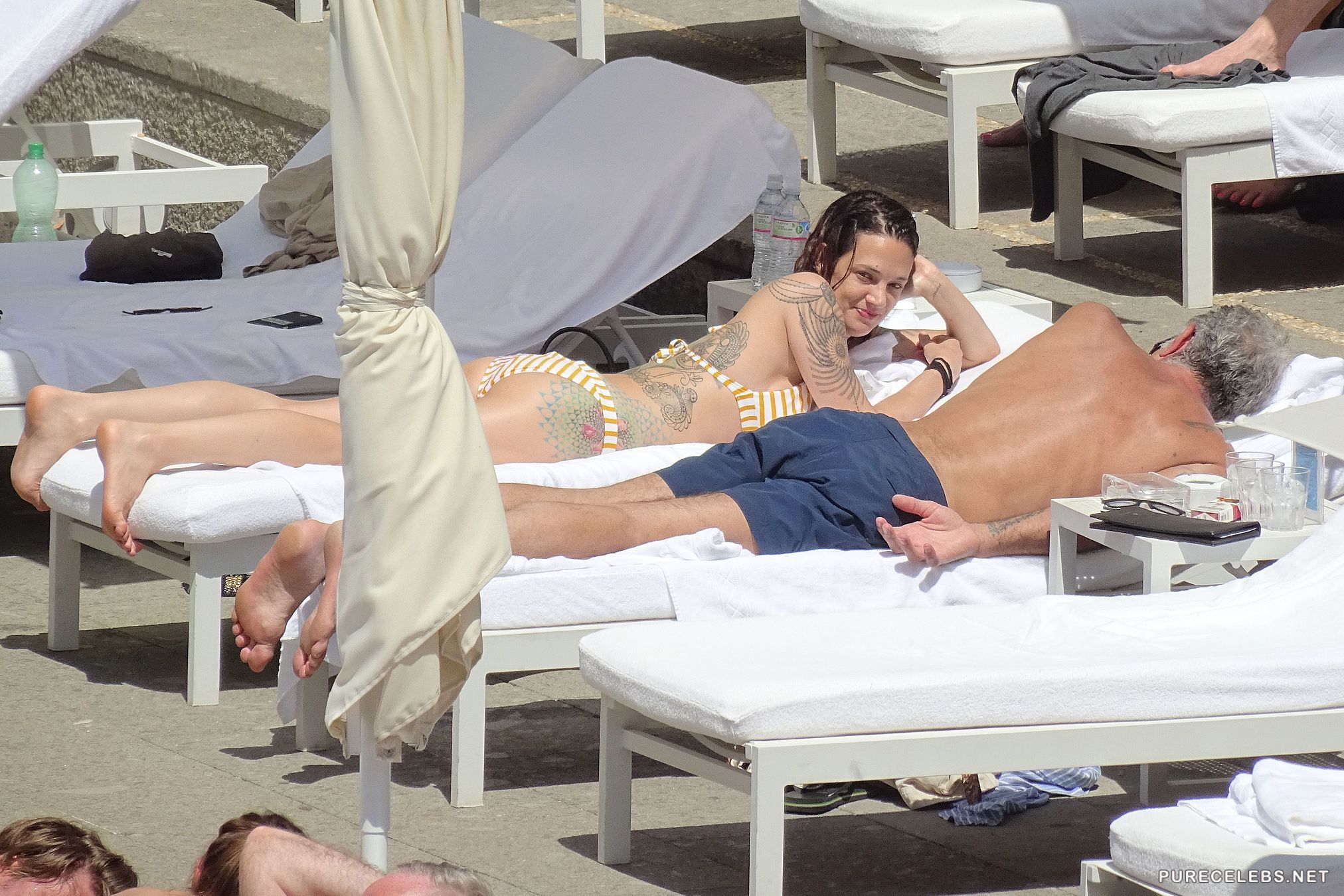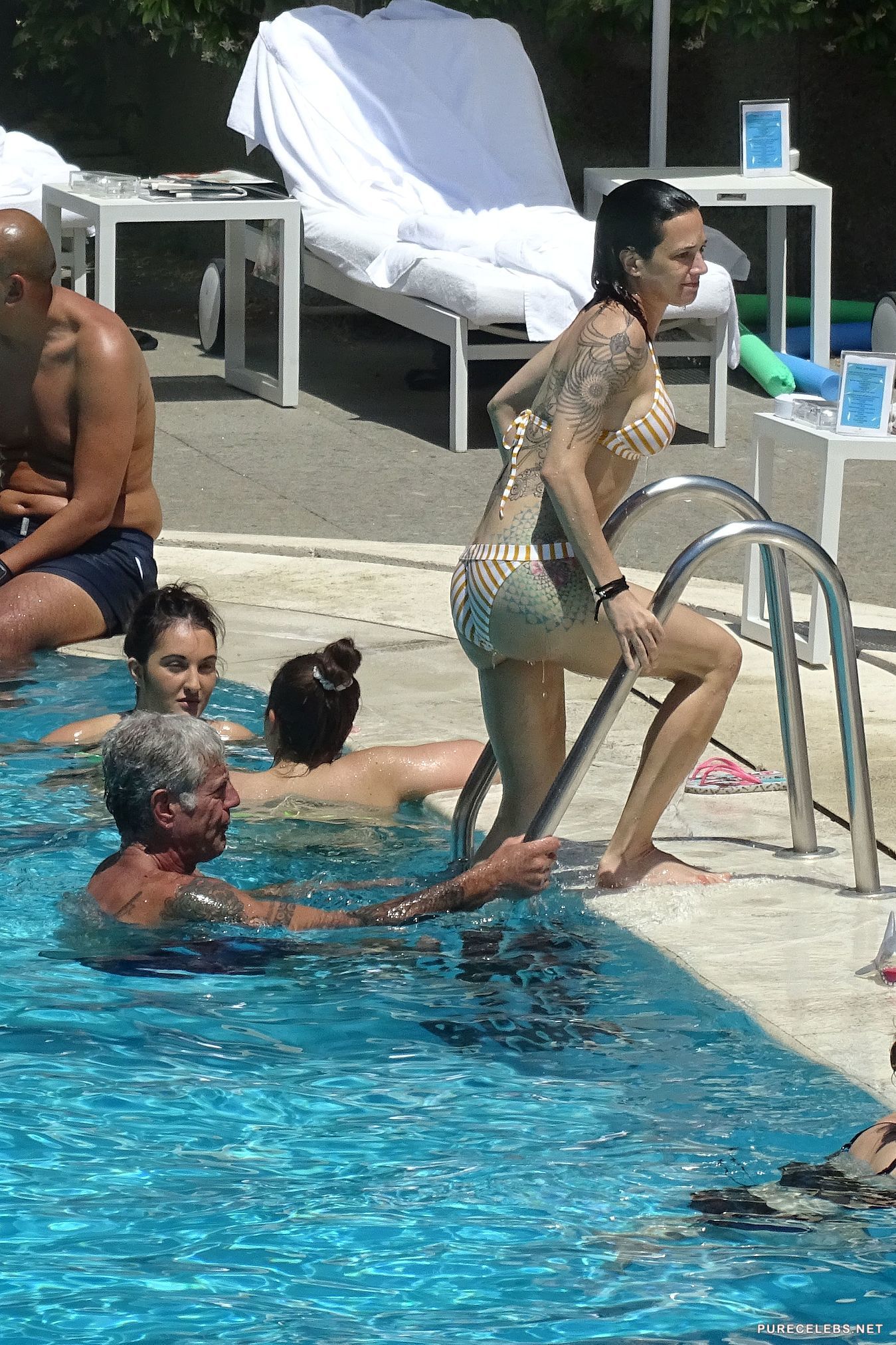 Europe has always been known as the home of beautiful women and Italian actress and model Asia Argento is no exception. This summer she was spotted by paparazzi longing around the pool in a miniature bikini that highlighted her massive fake tits. The 42 year old tattooed MILF enjoyed tanning and swimming with her friends as much as we enjoy seeing her stunning body in a wet bikini.