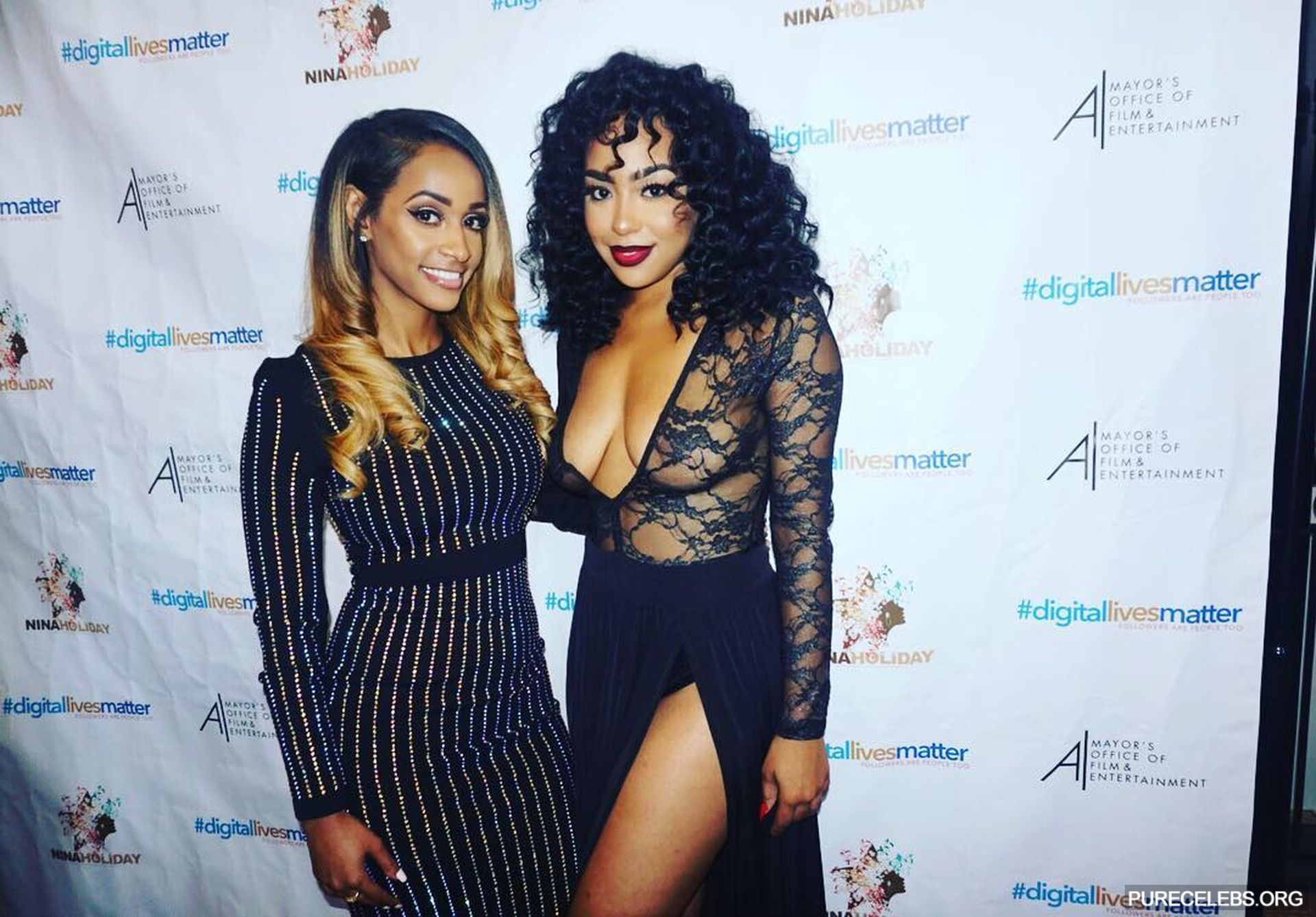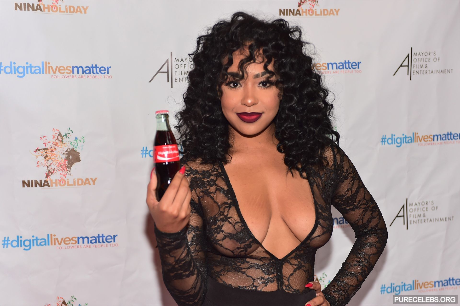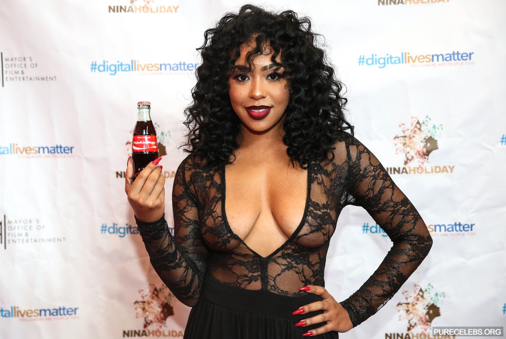American actress B.Simone loves to be in the center of public attention and does her best to attract this. For example, she dresses in very frank and sexy outfits that simply cannot go unnoticed. So, the paparazzi photographed this hot beauty in a black dress with a high slit, the top of which was lace and through it you could clearly see her awesome tits with poking nipples. Oh, this beauty looked incredibly seductive!
