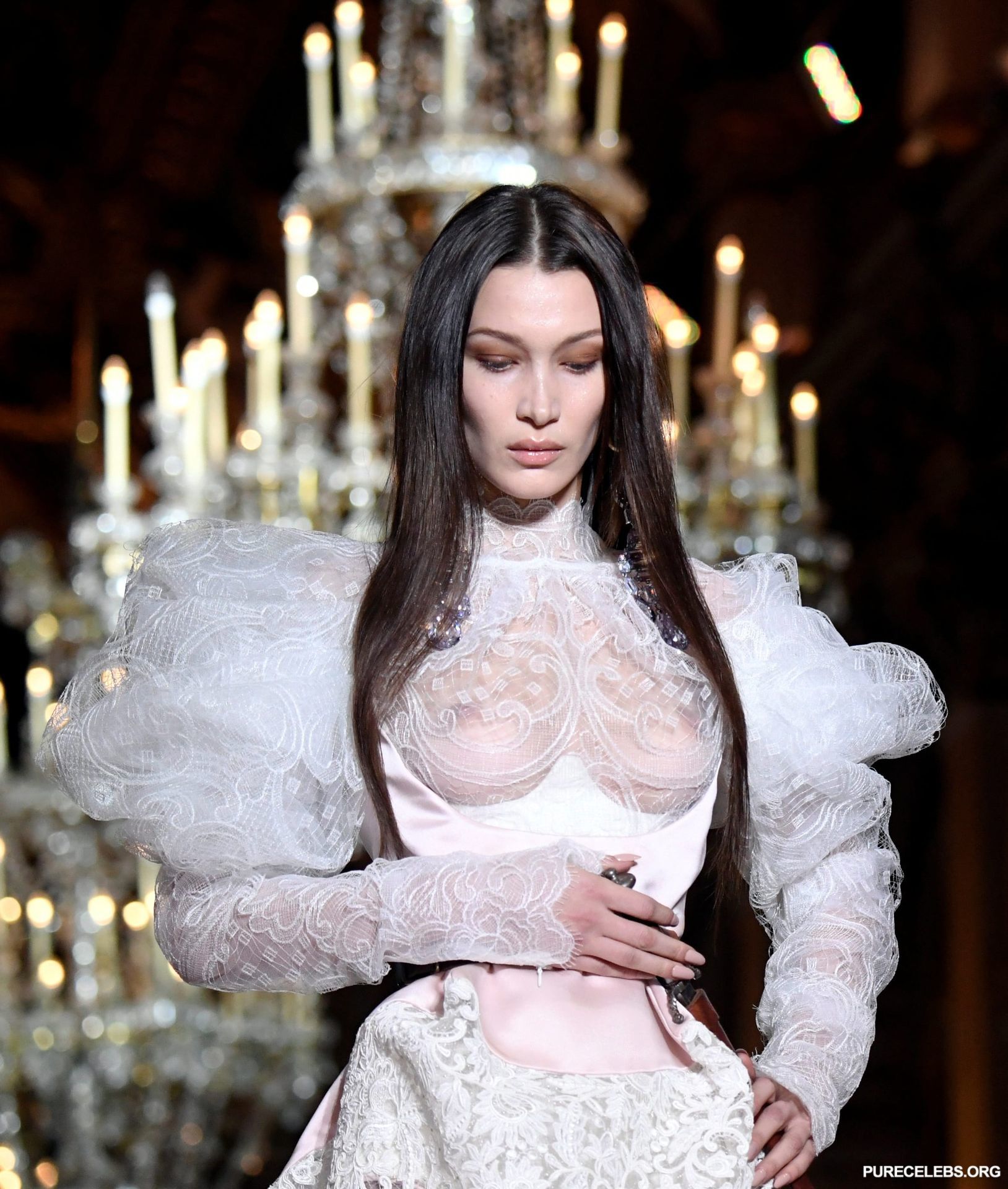 Bella Hadid looked incredibly confident as she walked the runway in a long black dress. It seems that she was not at all embarrassed by the fact that the dress was almost completely transparent! By the way, that’s why Bella Hadid’s nude juicy boobs were put on public display! This celebrity also looked incredibly seductive in a short dress decorated with rhinestones. And although Bella Hadid’s nude pussy was covered with black panties, her gorgeous boobies were completely naked!