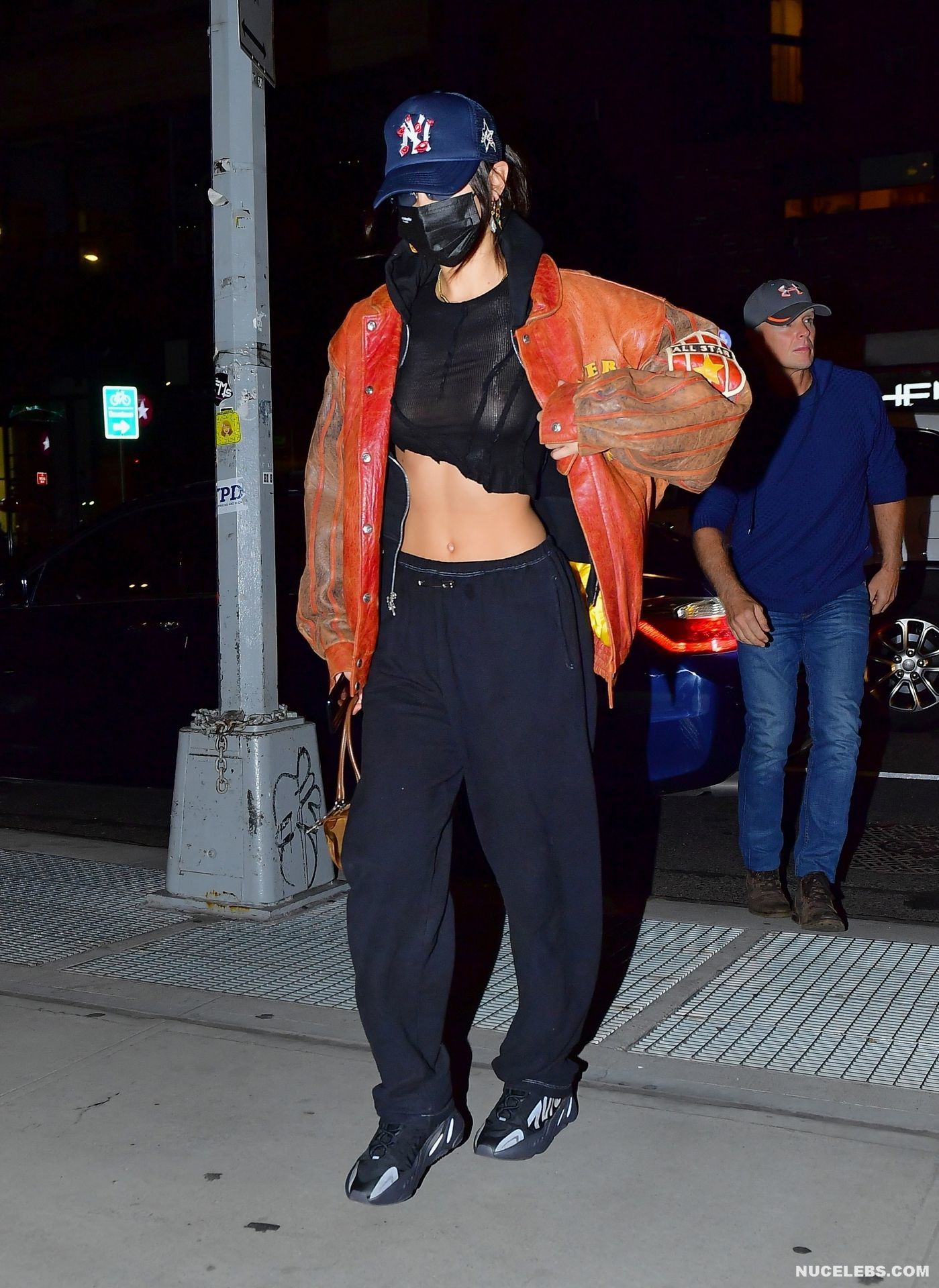 The quarantine is making its own adjustments by forcing celebrities to wear masks. Bella Hadid, who was recently photographed by the paparazzi wearing a mask in the middle of the street, was no exception. Although the girl’s face was covered with a black mask and black sunglasses, she looked incredibly sexy. And all because Bella Hadid decided not to hide her nude tits from the public. The celebrity was wearing a braless, in a black crop top, sweatpants, and a red jacket unbuttoned. As you can see, her top was so transparent that Bella Hadid’s nude boobs with brown nipples were visible through it.