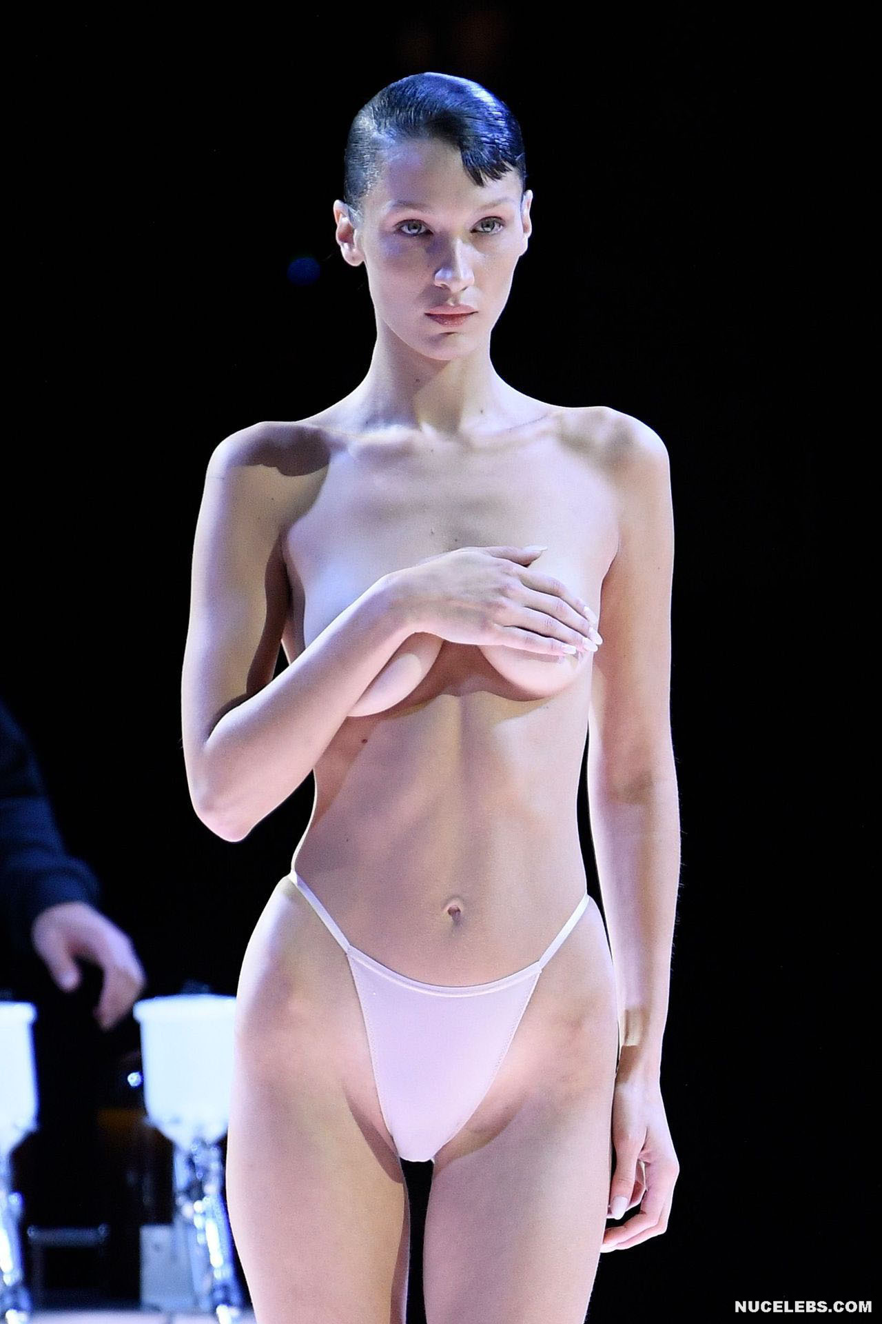The hottest American model Bella Hadid again showed her nude tits right on stage. This happened during one of the fashion shows when a star walked along the catwalk in a long white dress with a brown belt. The celebrity looked very hot and sexy, especially considering the fact that she was braless. I think that everyone around was going crazy looking at the transparent top of her dress. After all, through him were clearly visible Bella Hadid nude boobies with brown nipples!
