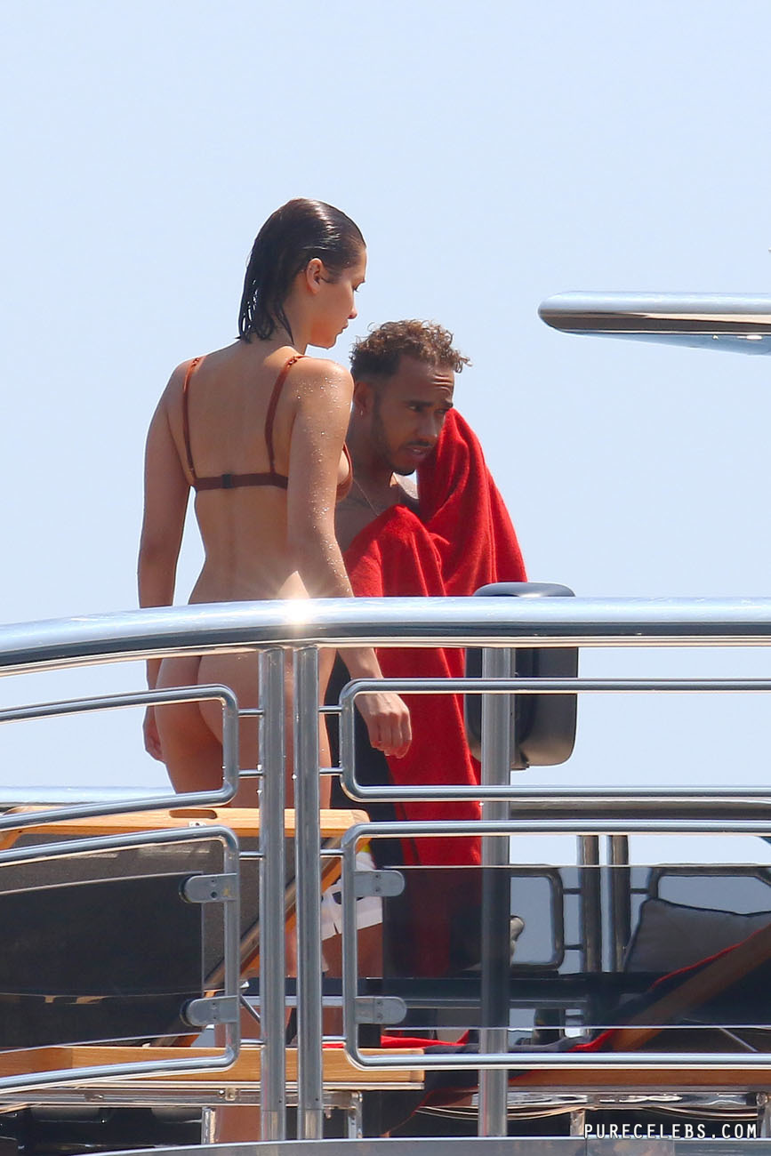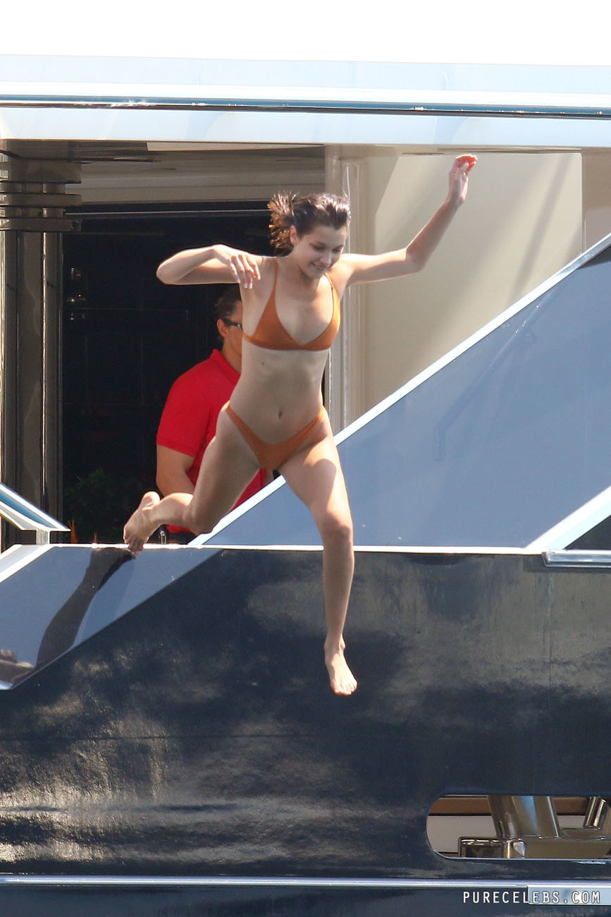 American model Bella Hadid was spotted by paparazzi during her holiday on a yacht. The celebrity was wearing a small orange bikini. It seemed that her juicy boobies were ready to jump out of a small bra at any moment. And be sure to pay attention to her wonderful cameltoe, which was visible through tight-fitting panties. By the way, sometimes part of the star’s shaved pussy peeked out of her panties. And it was an amazing sight!
