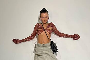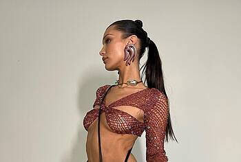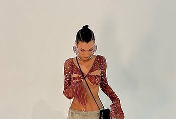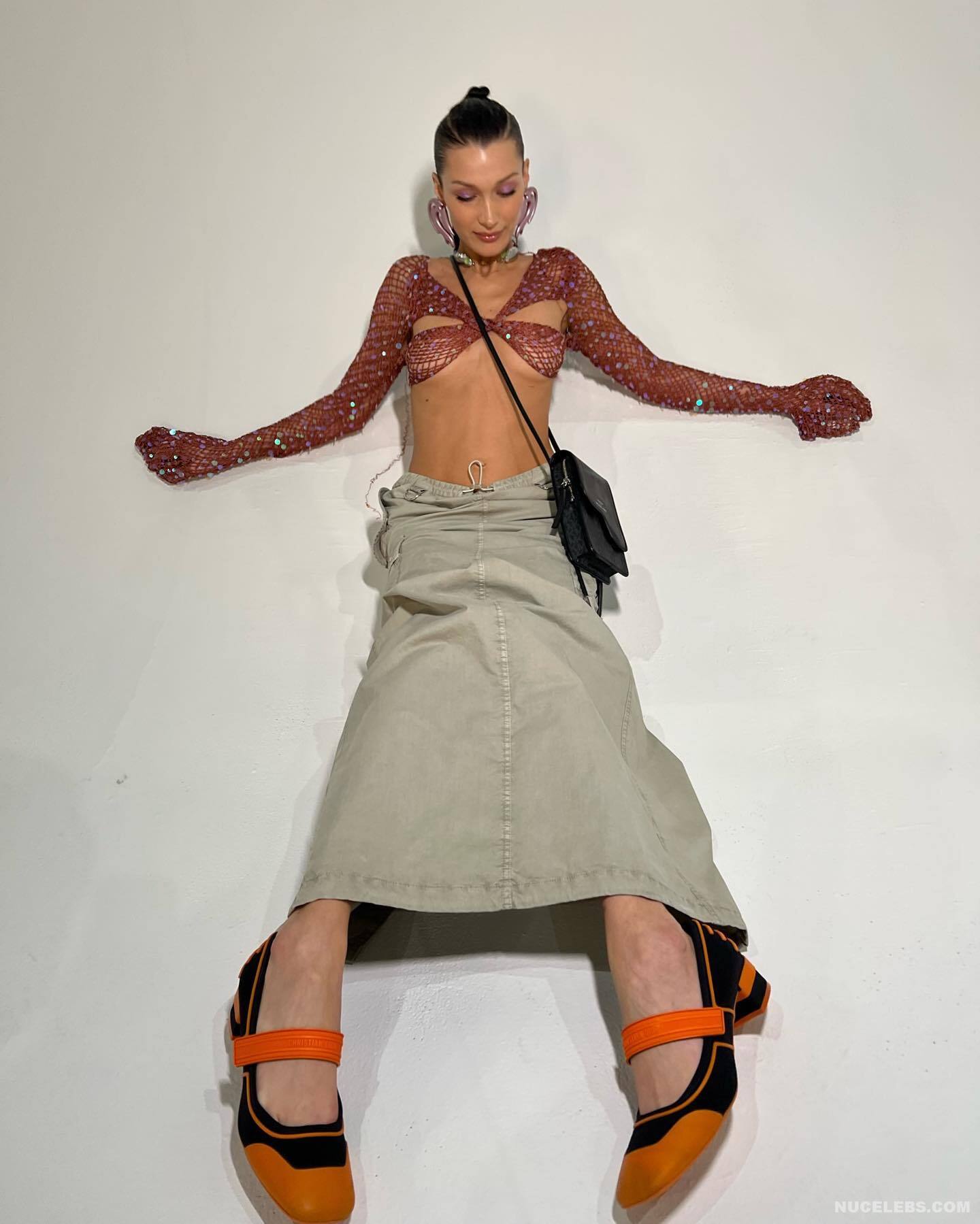 Many are already accustomed to the fact that Bella Hadid always dresses brightly and stylishly. But some of her photos are especially breathtaking! For example, this American model posed in a gray maxi skirt and a red sequined mesh sweater. The main feature of this image was that Bella Hadid’s nude tits showed through her outfit, because she was braless. Also, this star posed in an unbuttoned red plaid suit on the beach. Bella Hadid flaunted her nude breasts and only small white stickers covered her nipples. And you will definitely howl with delight, looking at how Bella Hadid posed completely nude, covering her pussy with a purse!