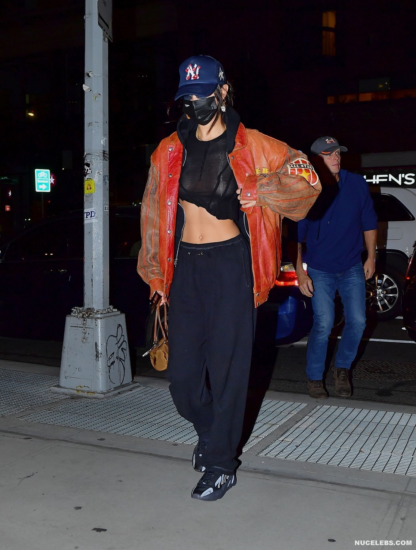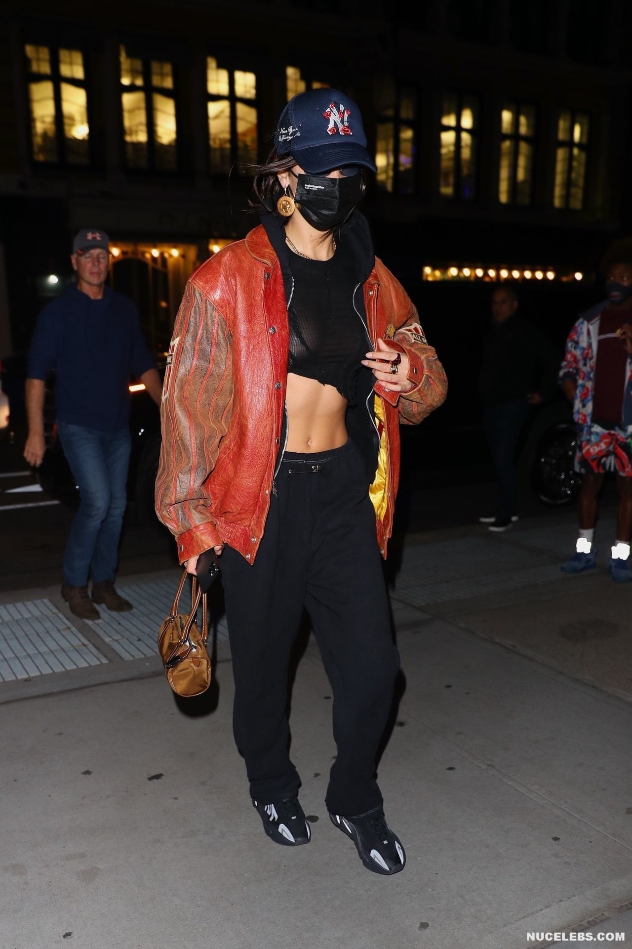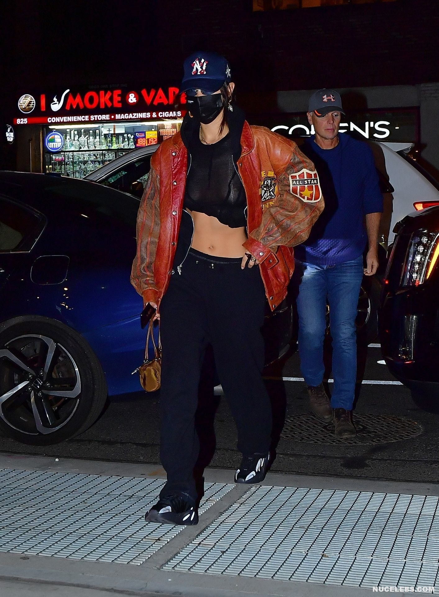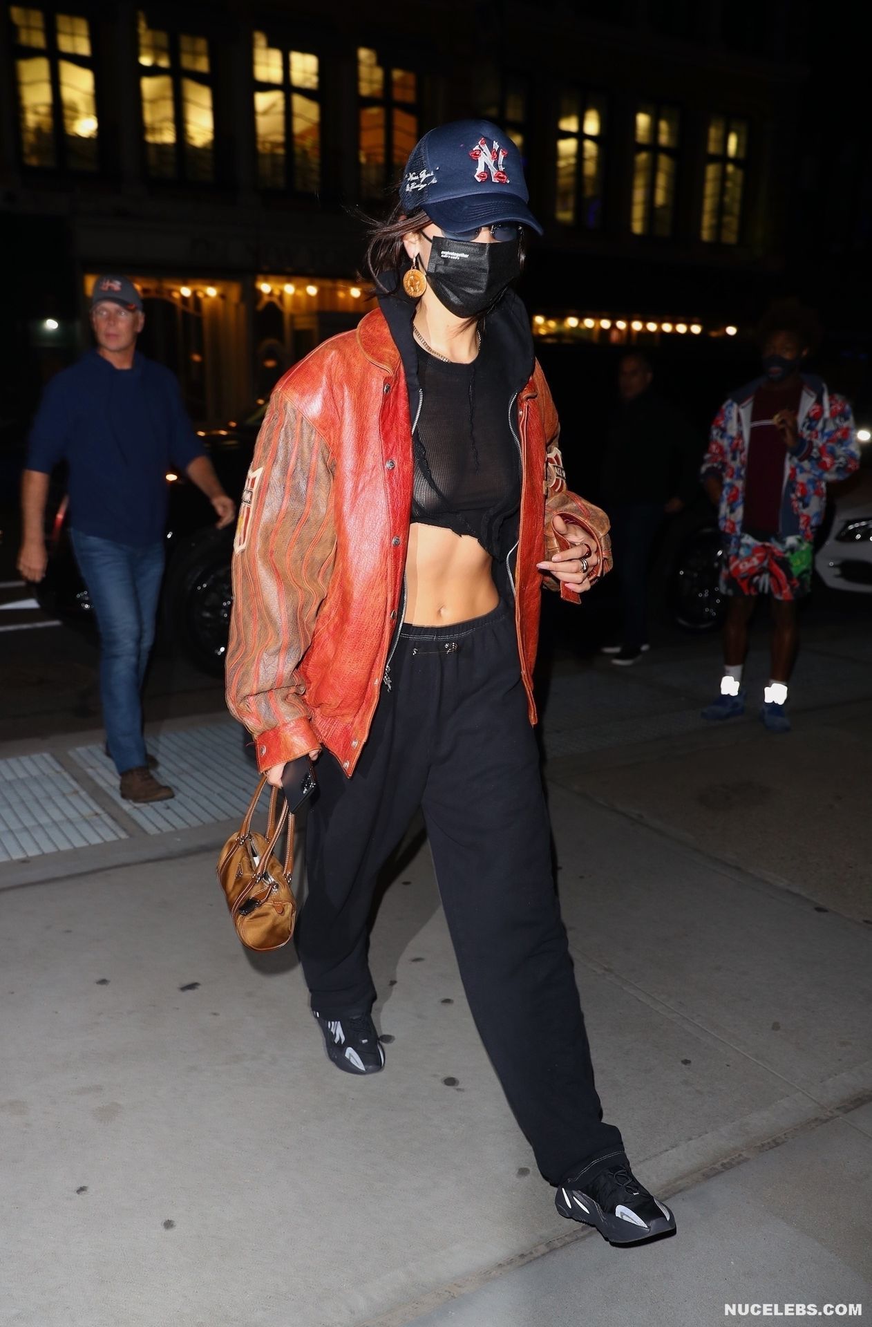 The quarantine is making its own adjustments by forcing celebrities to wear masks. Bella Hadid, who was recently photographed by the paparazzi wearing a mask in the middle of the street, was no exception. Although the girl’s face was covered with a black mask and black sunglasses, she looked incredibly sexy. And all because Bella Hadid decided not to hide her nude tits from the public. The celebrity was wearing a braless, in a black crop top, sweatpants, and a red jacket unbuttoned. As you can see, her top was so transparent that Bella Hadid’s nude boobs with brown nipples were visible through it.