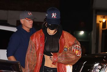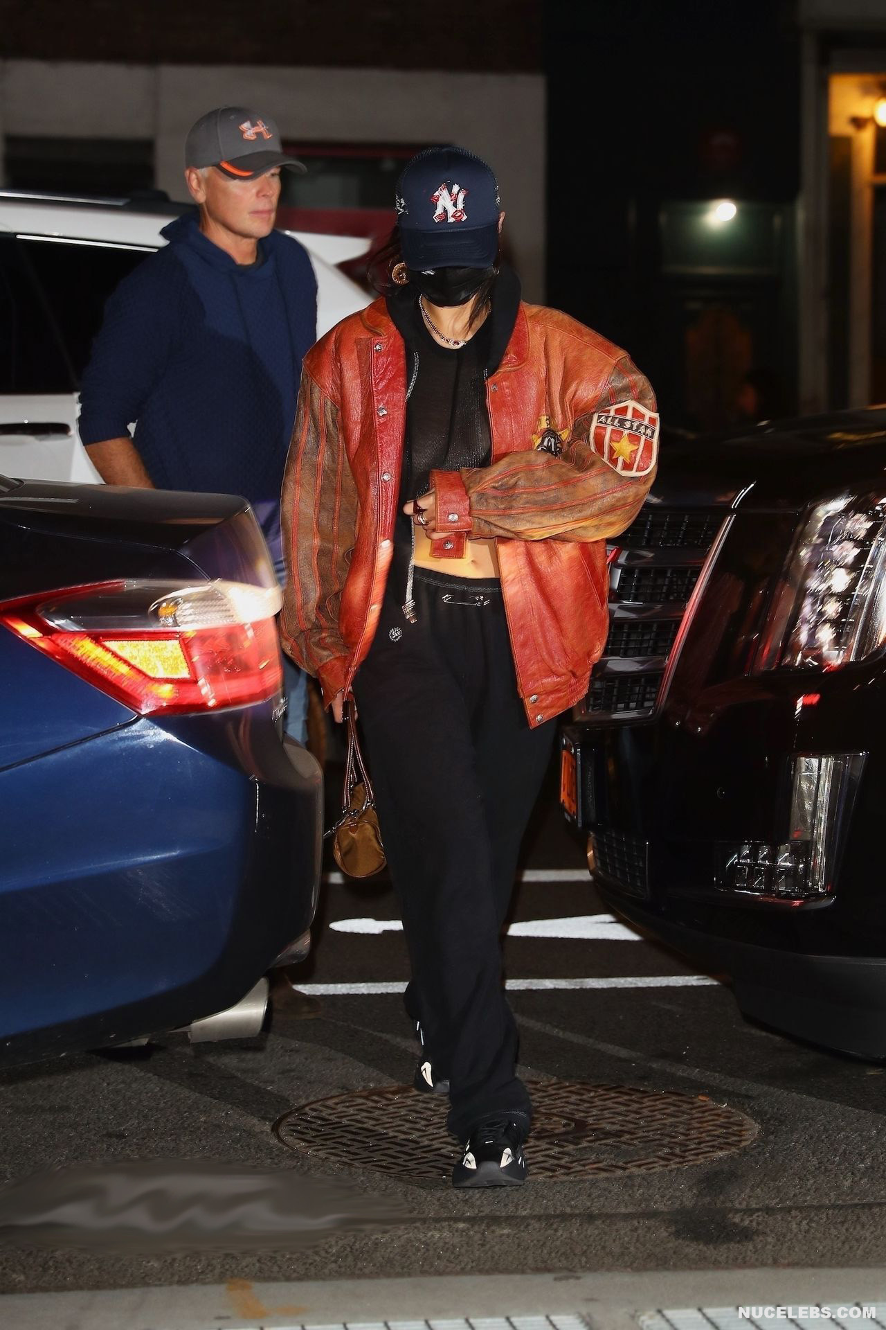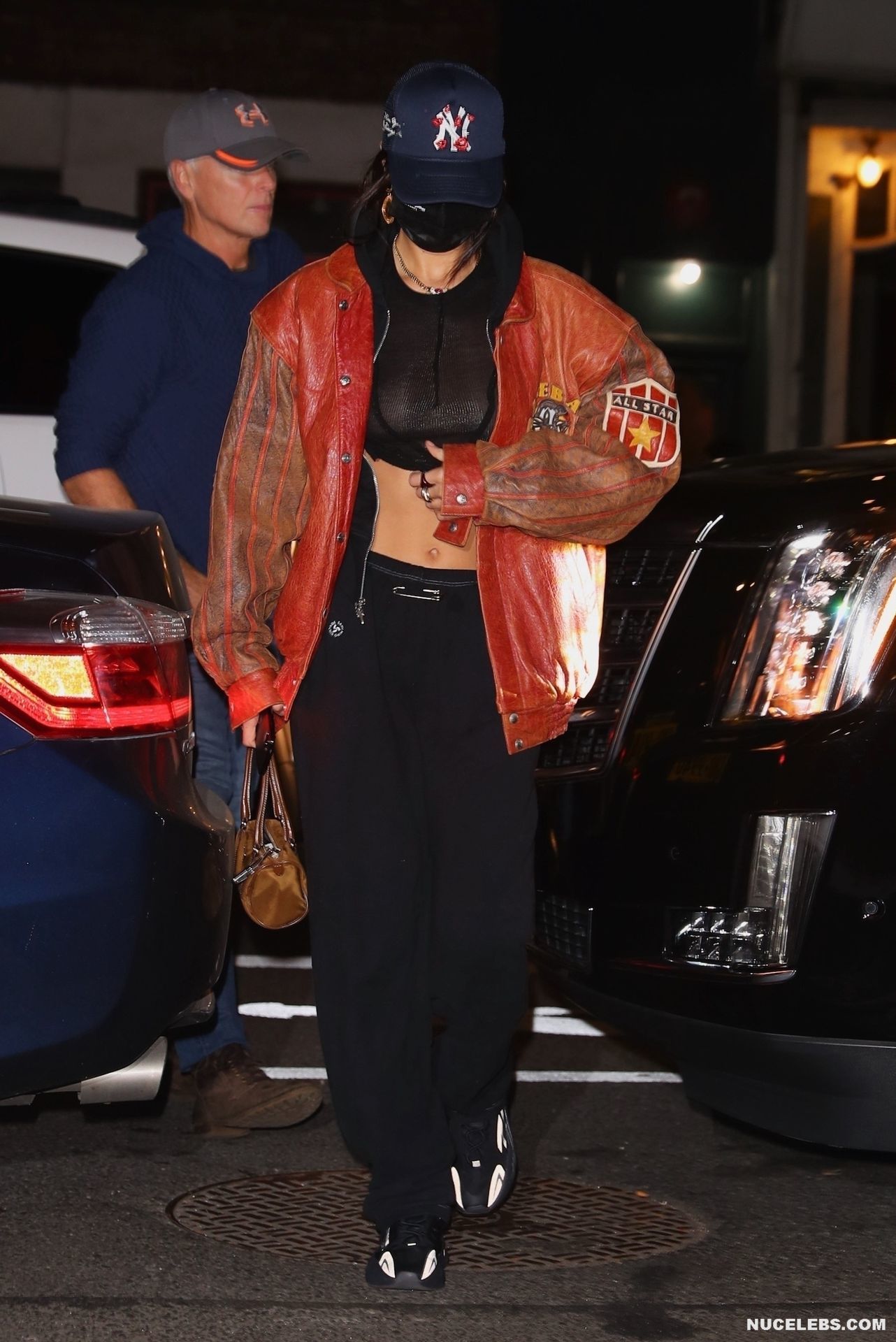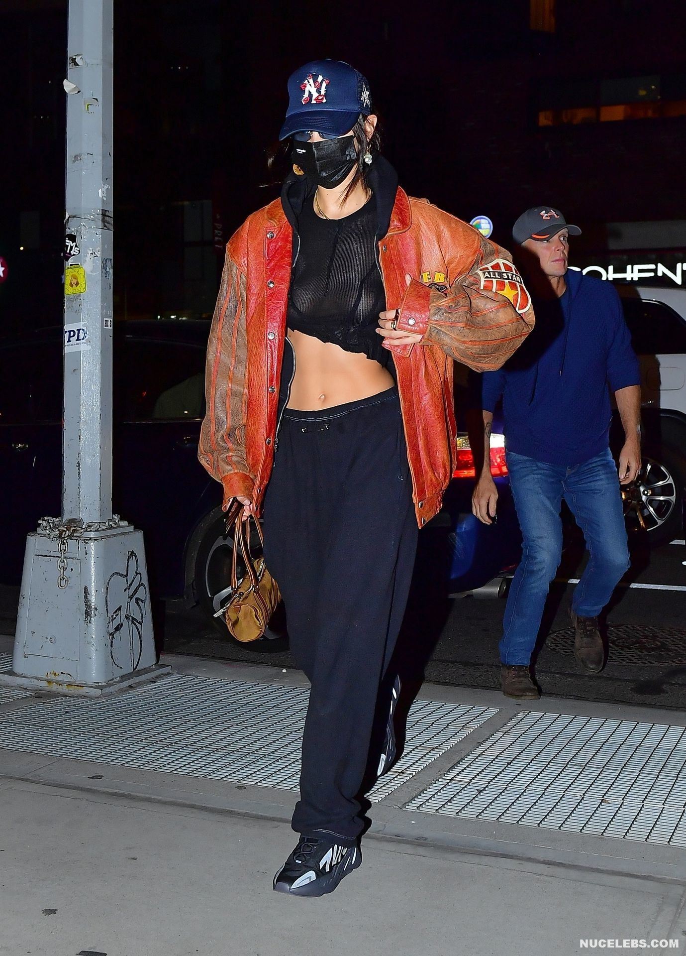 The quarantine is making its own adjustments by forcing celebrities to wear masks. Bella Hadid, who was recently photographed by the paparazzi wearing a mask in the middle of the street, was no exception. Although the girl’s face was covered with a black mask and black sunglasses, she looked incredibly sexy. And all because Bella Hadid decided not to hide her nude tits from the public. The celebrity was wearing a braless, in a black crop top, sweatpants, and a red jacket unbuttoned. As you can see, her top was so transparent that Bella Hadid’s nude boobs with brown nipples were visible through it.