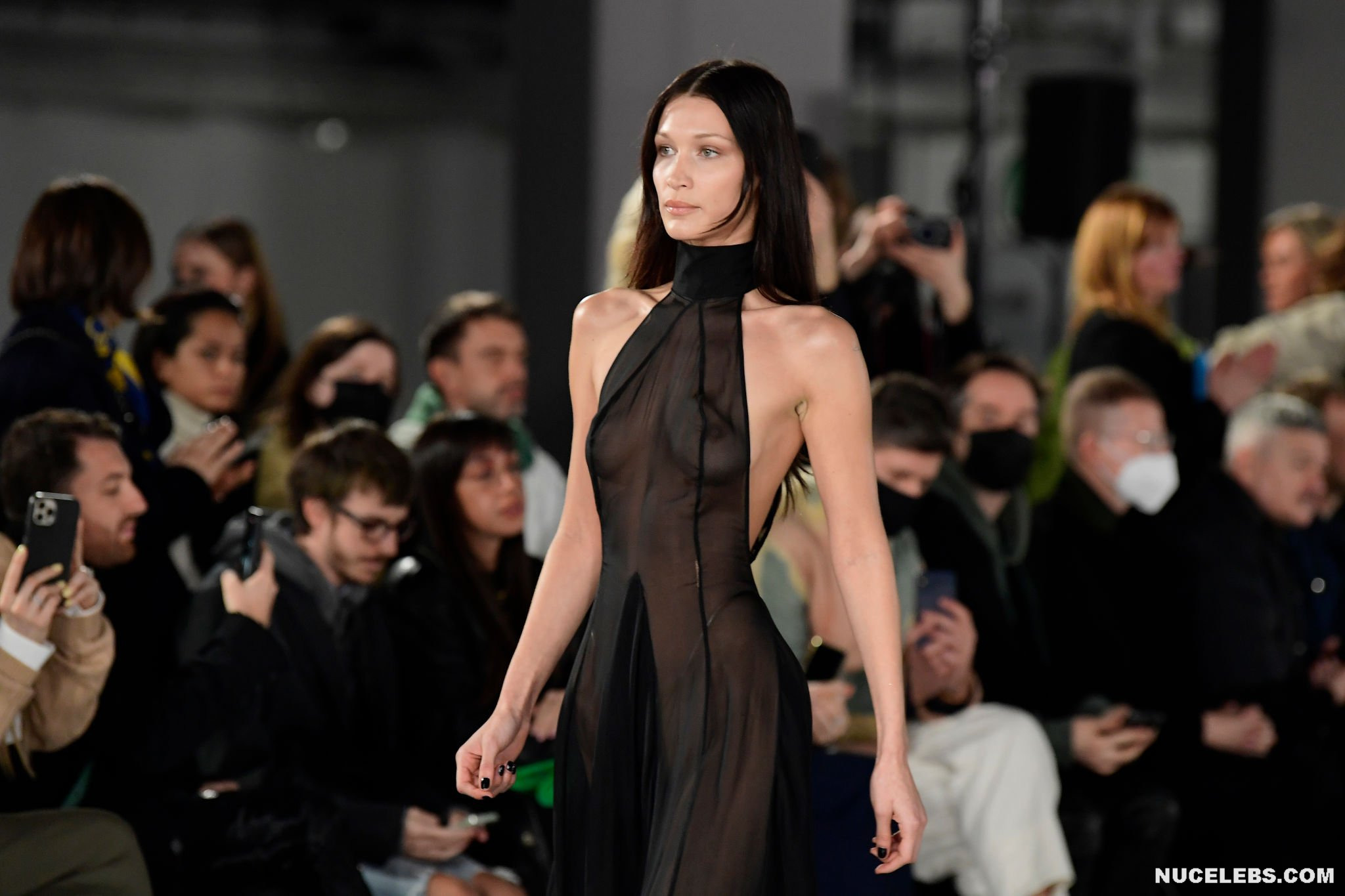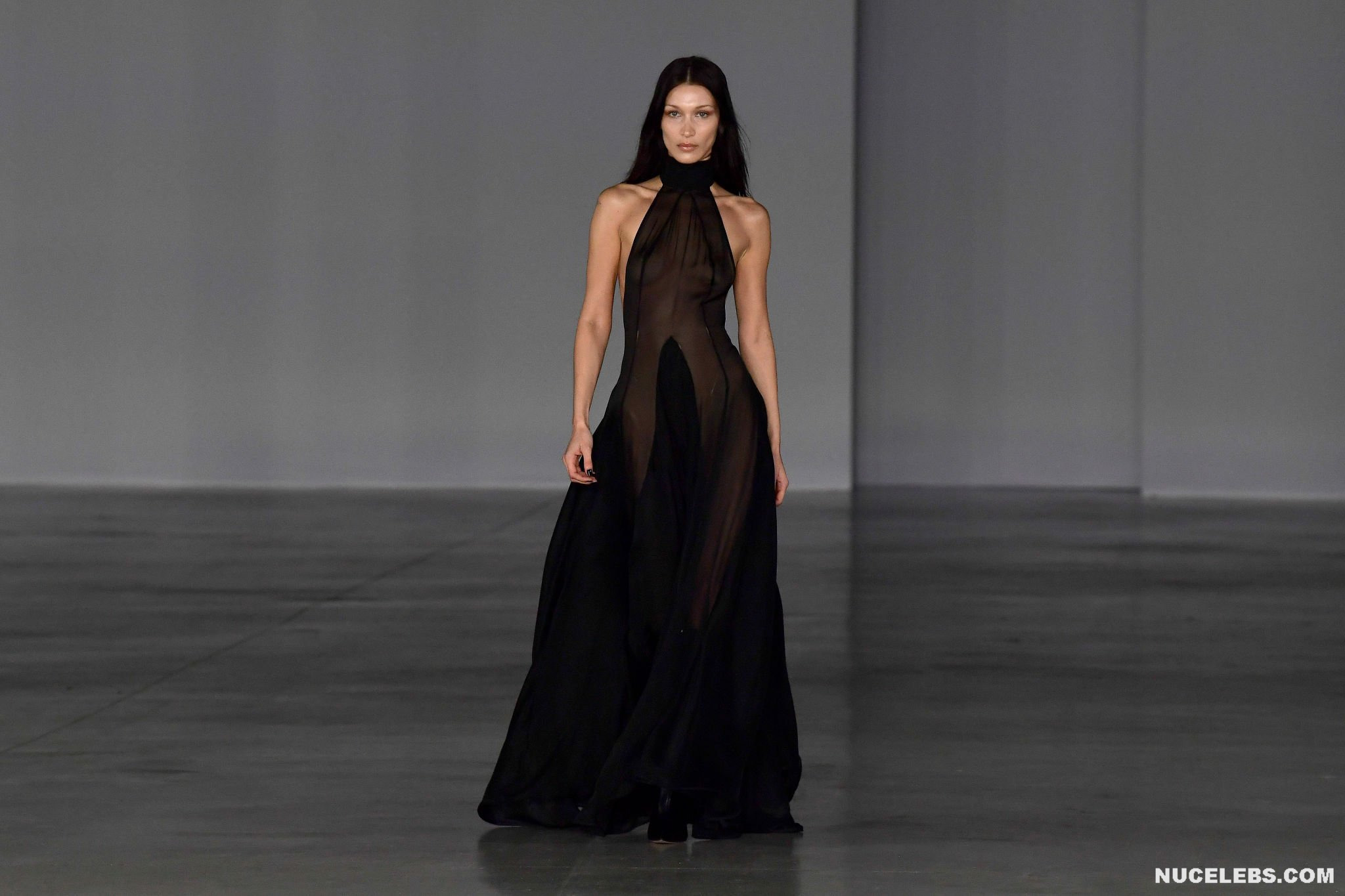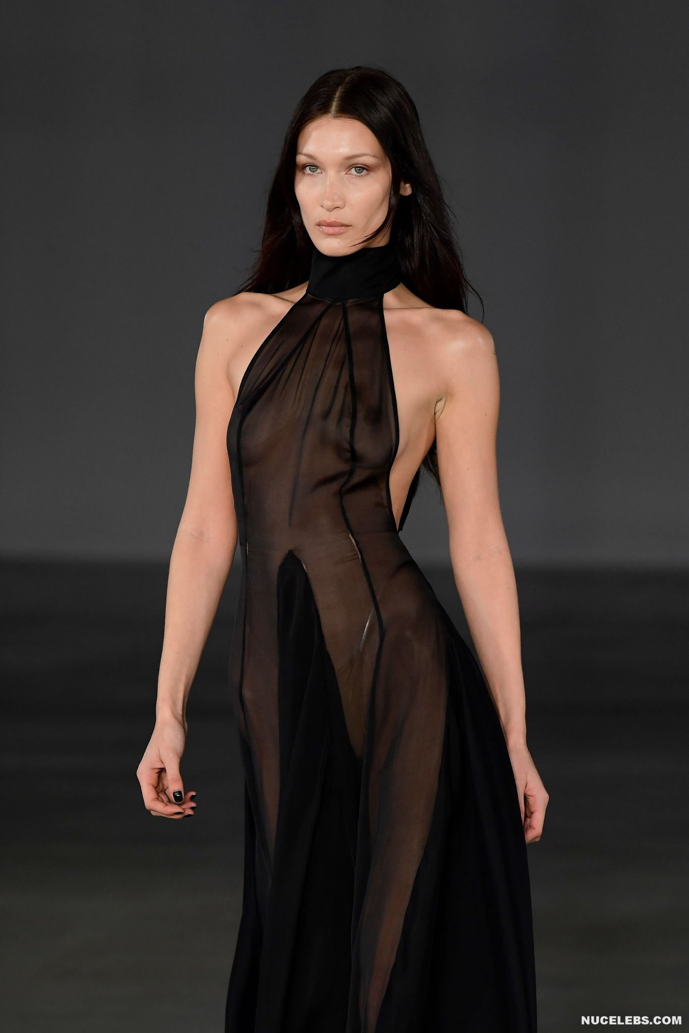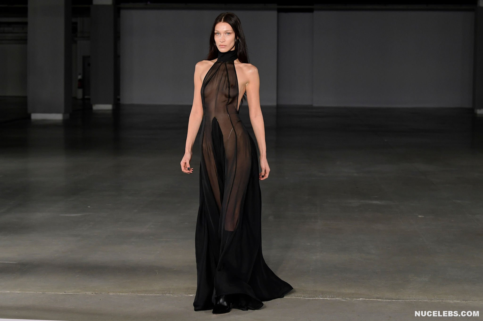 Bella Hadid looked incredibly confident as she walked the runway in a long black dress. It seems that she was not at all embarrassed by the fact that the dress was almost completely transparent! By the way, that’s why Bella Hadid’s nude juicy boobs were put on public display! This celebrity also looked incredibly seductive in a short dress decorated with rhinestones. And although Bella Hadid’s nude pussy was covered with black panties, her gorgeous boobies were completely naked!