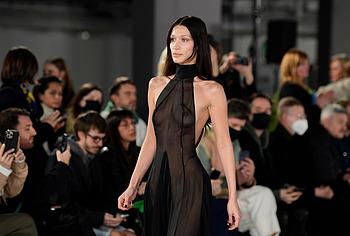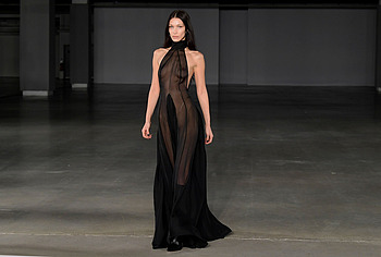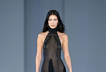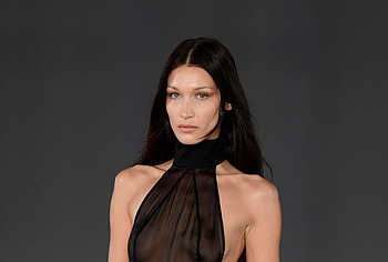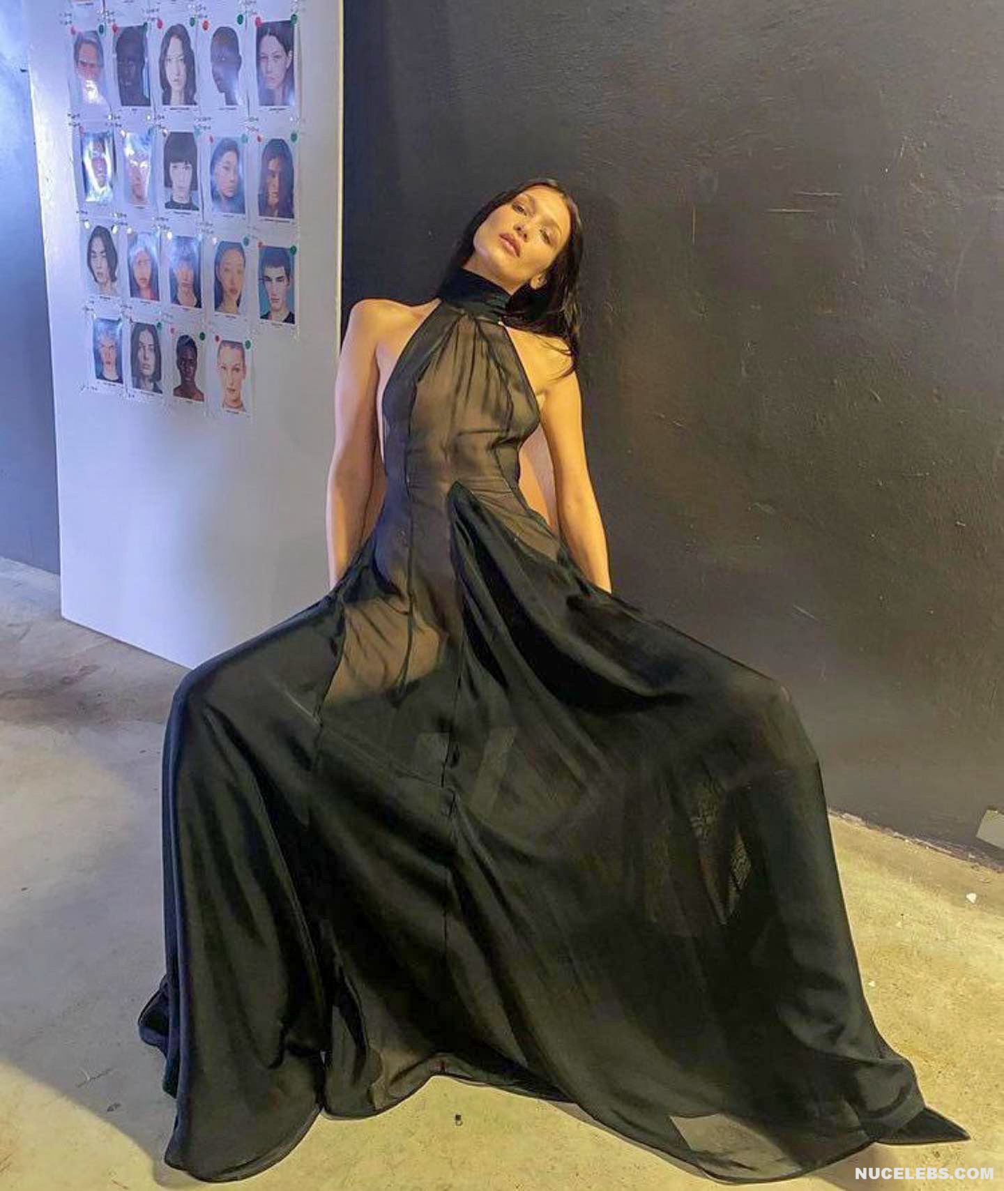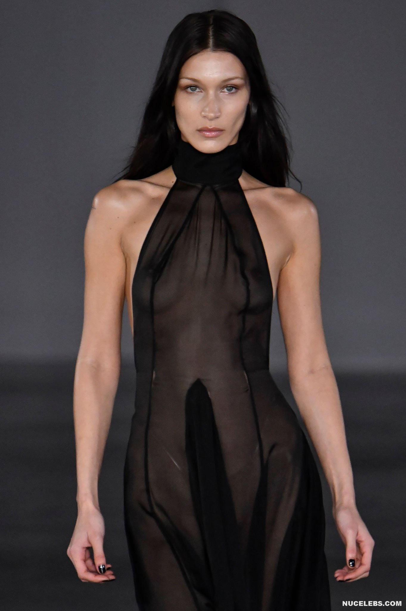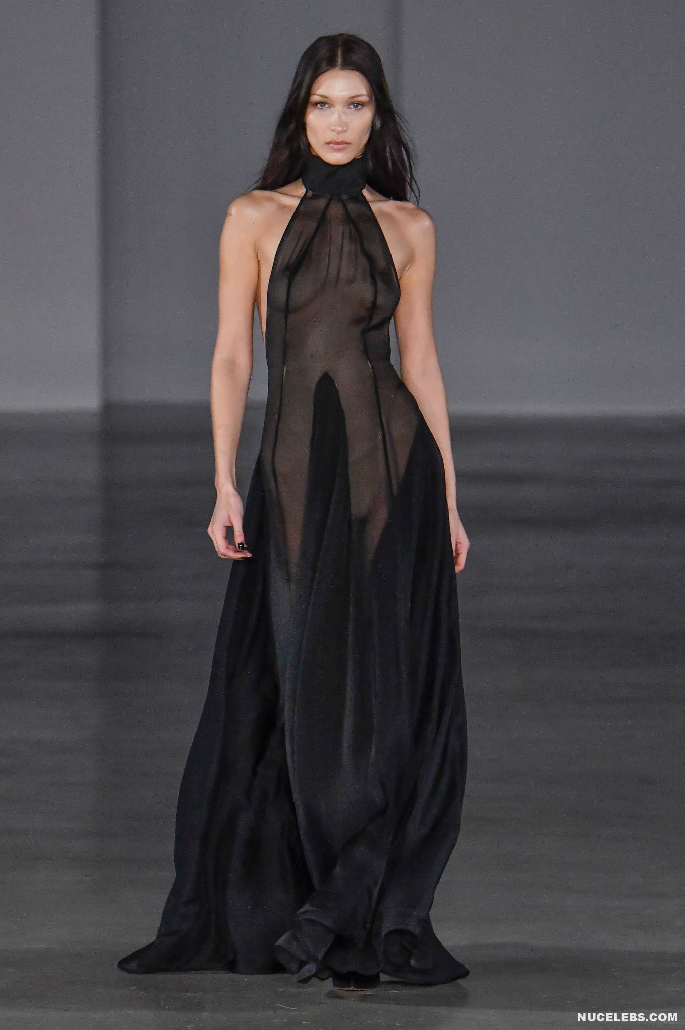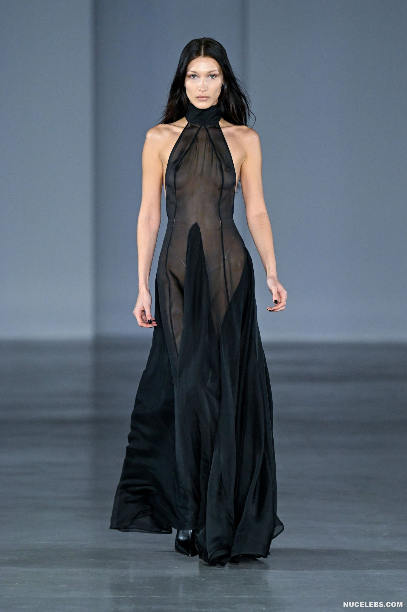 Bella Hadid looked incredibly confident as she walked the runway in a long black dress. It seems that she was not at all embarrassed by the fact that the dress was almost completely transparent! By the way, that’s why Bella Hadid’s nude juicy boobs were put on public display! This celebrity also looked incredibly seductive in a short dress decorated with rhinestones. And although Bella Hadid’s nude pussy was covered with black panties, her gorgeous boobies were completely naked!