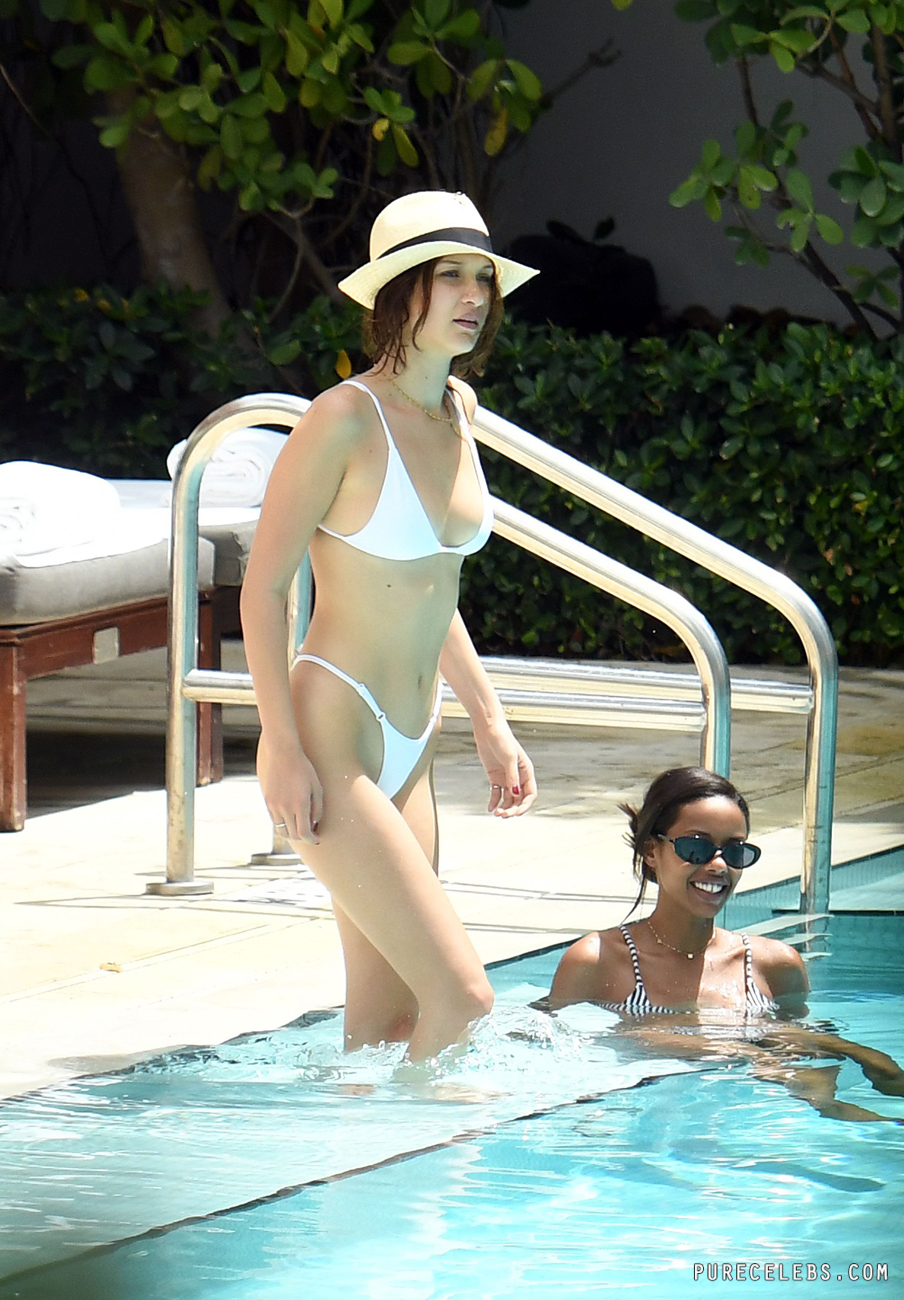 What else is better than enjoying watching wet Bella getting out of the pool wearing her white bikini? On one of the pictures you can see that she is pulling up the thongs so her butt chicks can be more visible. You should also notice her sexy legs and how is she relaxing while hiding from the sun in the shadows, lying on the bed with spread legs.