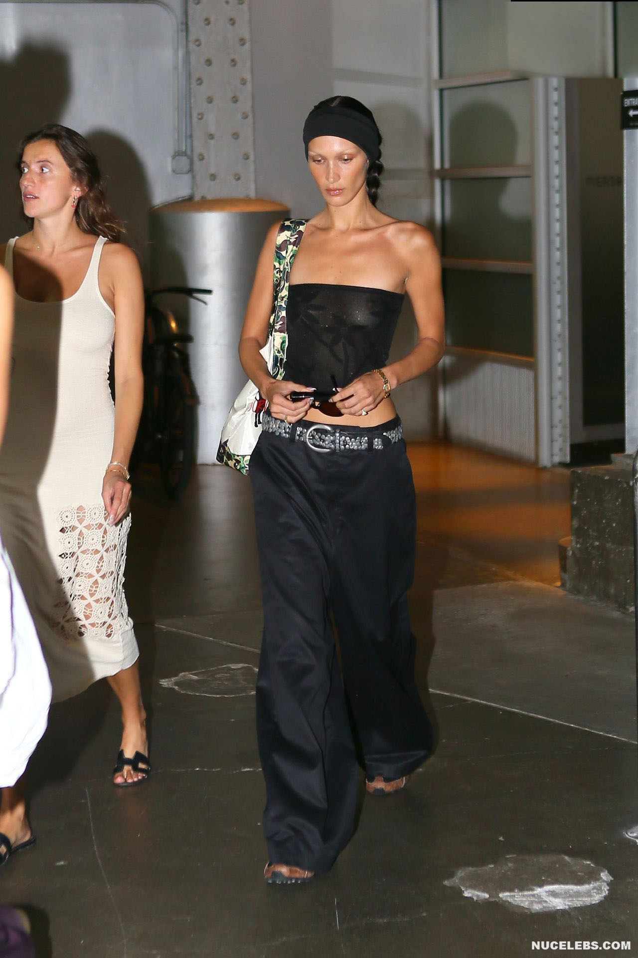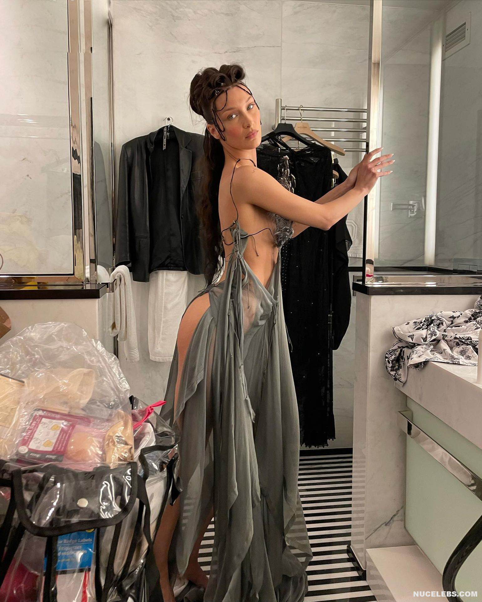 Bella Hadid’s pics can be viewed over and over as this American model loves to tease her fans. So, Bella Hadid quite often demonstrates her nude body in whole or in part, making everyone howl with delight. For example, in the fitting room, this 25-year-old celebrity posed in a gray transparent outfit that barely covered her awesome ass. And in another photo of Bella Hadid, nude tits with brown nipples were visible through a black knitted top.