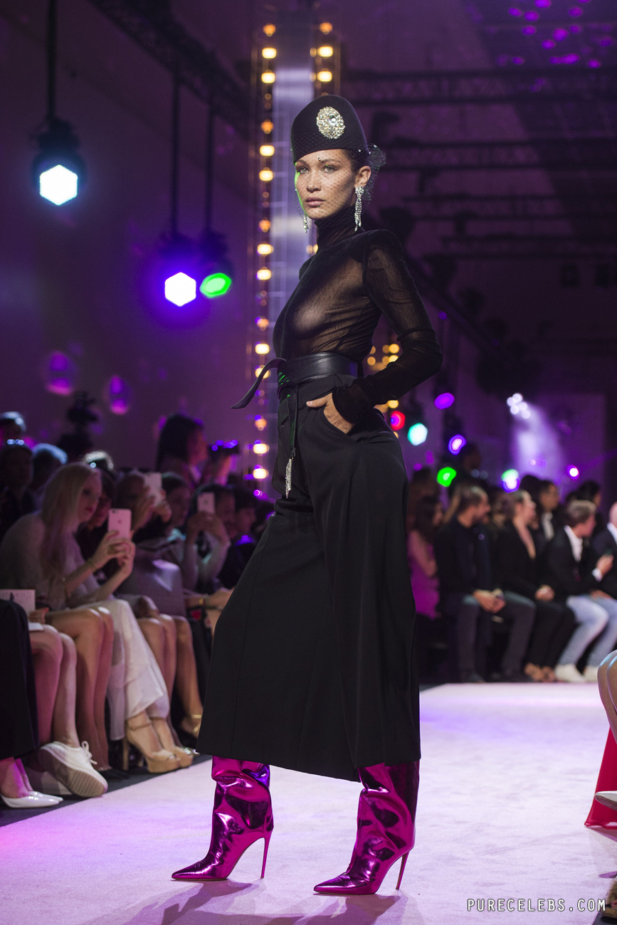 American model Bella Hadid is happy to showcase her nude body at any convenient opportunity. This time, the beauty appeared on the stage in black wide pants, a black top and a black hat with a veil in a mesh. The celebrity was braless. Therefore, everyone could admire Bella Hadid’s nude boobs with brown nipples that shine through the transparent fabric.