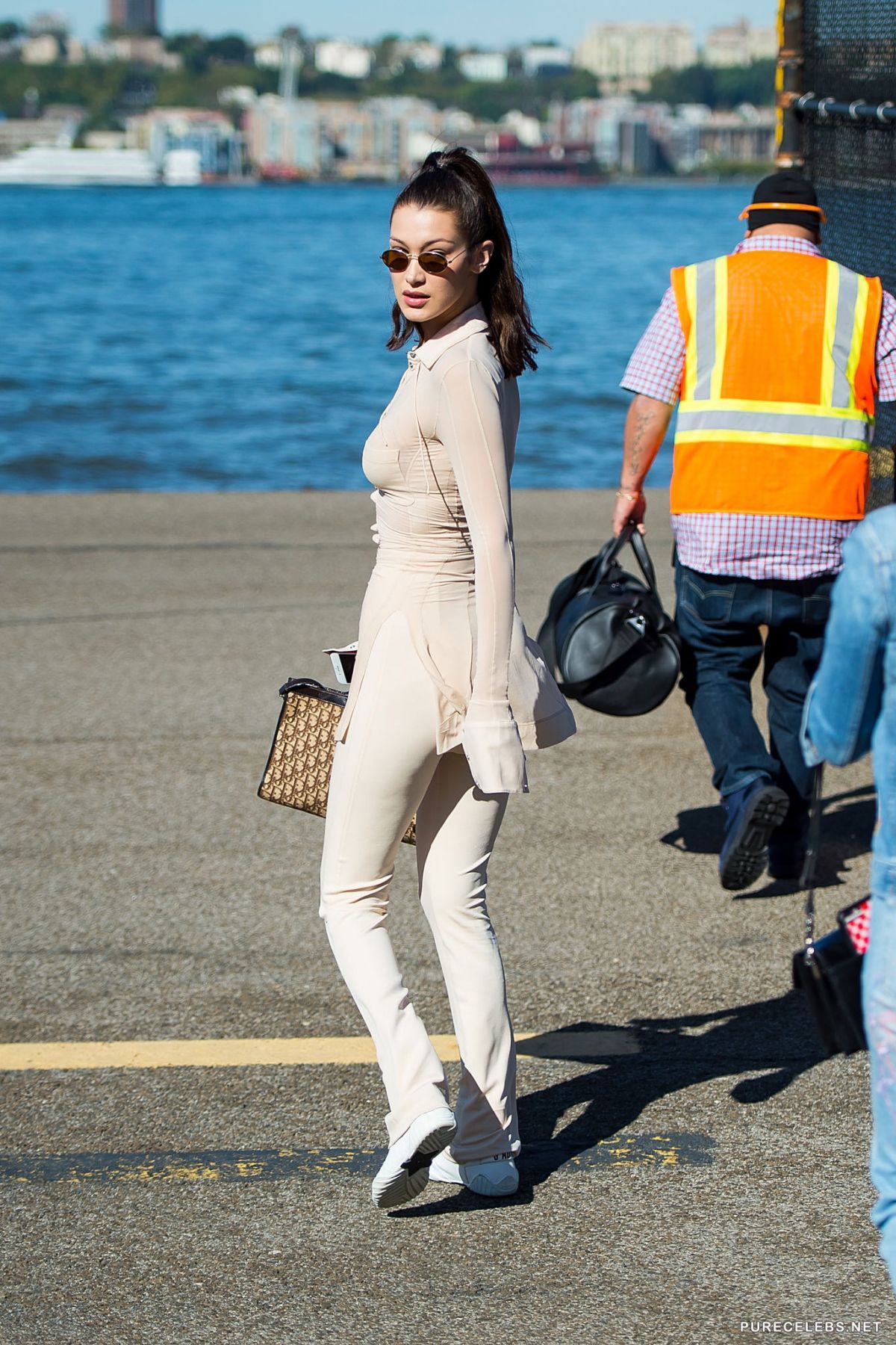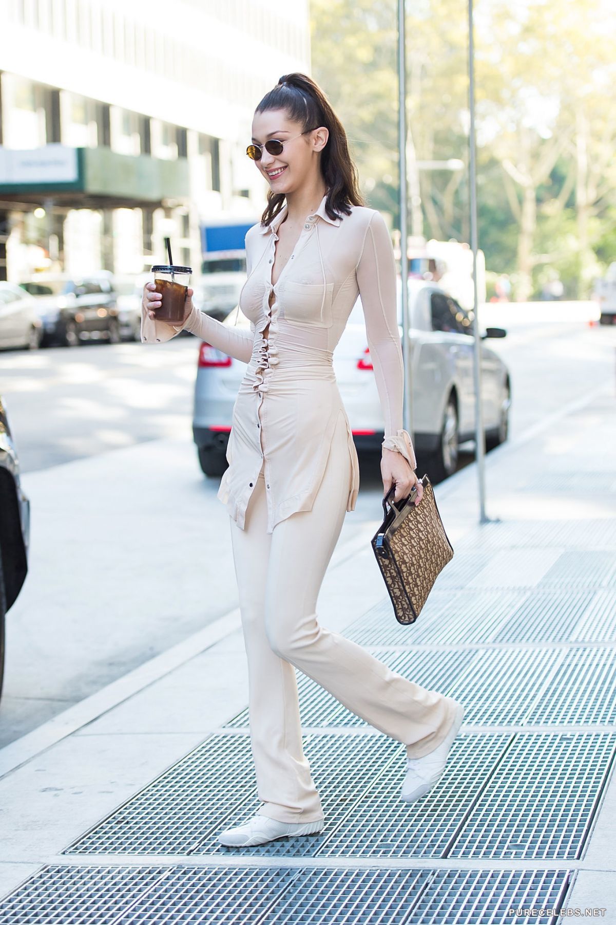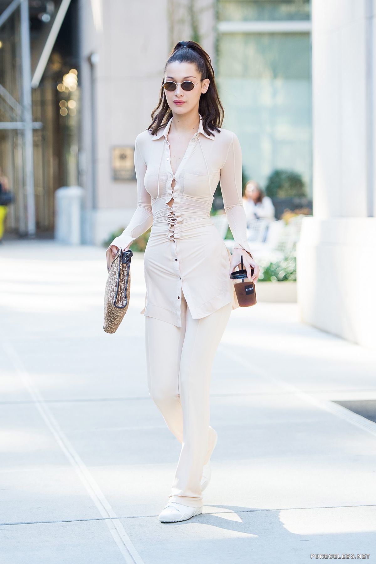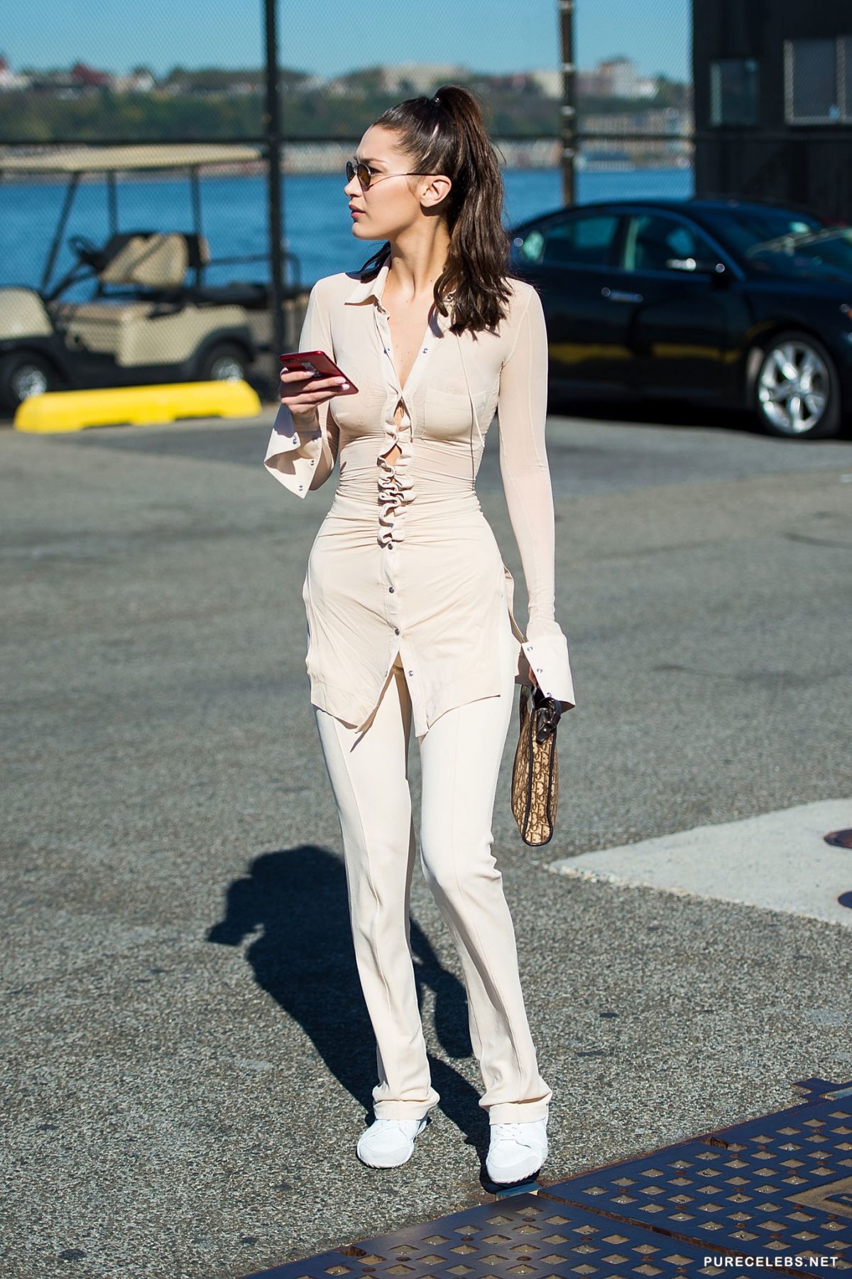 We are always happy to see a slutty babe like Bella Hadid flaunt her assets. This time she was photographed on her way to the airport wearing a see-through tan shirt which showed off her nipple piercings. This stunning young brunette model is known for teasing the public with her skimpy outfits, but this time she surprised even the paparazzi with this provocative sheer lace up shirt.