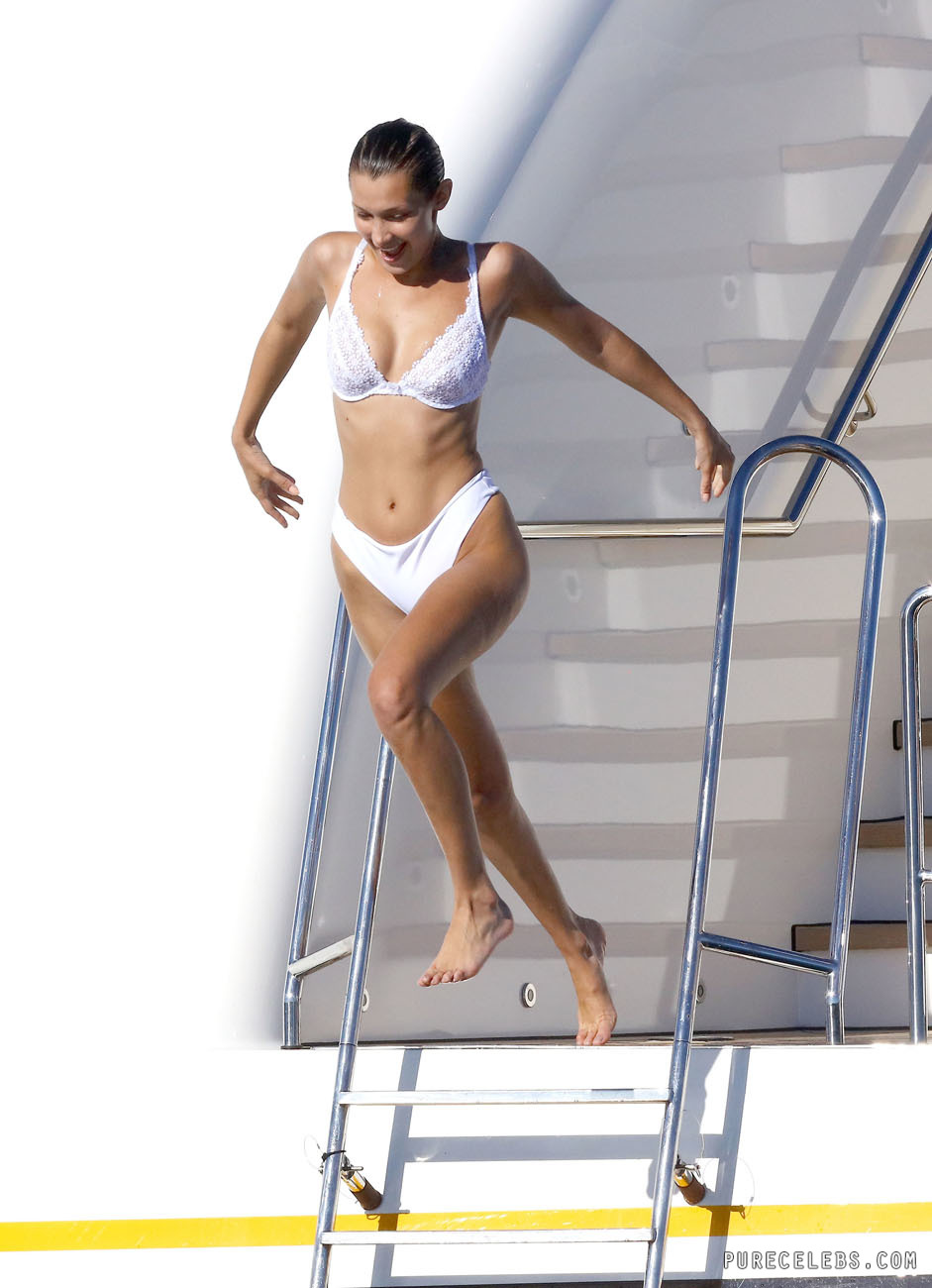 Paparazzi managed to catch the American model Bella Hadid during her vacation on a yacht. This celebrity was wearing a white bikini that accentuated the curves of her amazing body. It was impossible to look away from her buns in white panties as she climbed the steps. And her boobies also looked very sexy in a white lace bra when she was taking a shower. Agree, everyone would dream to see Bella Hadid nude!
