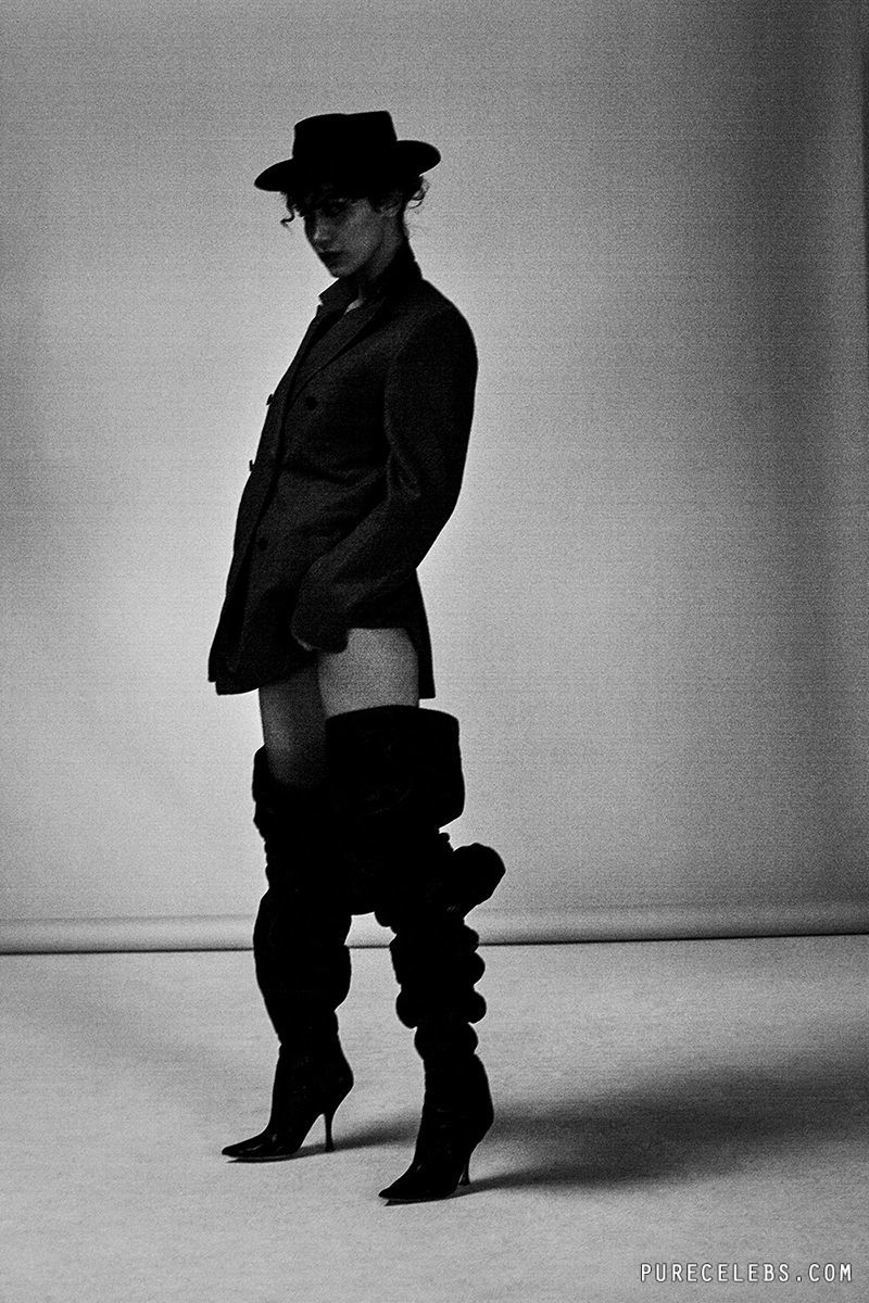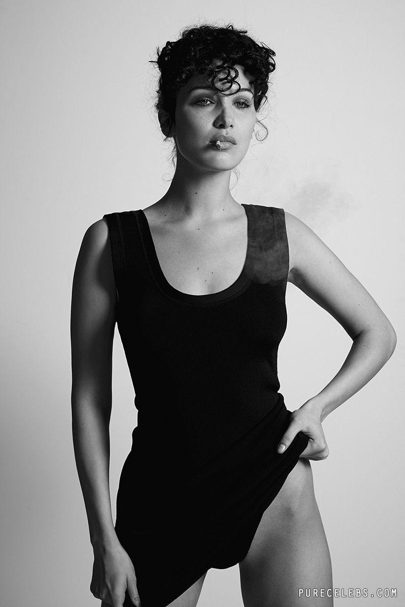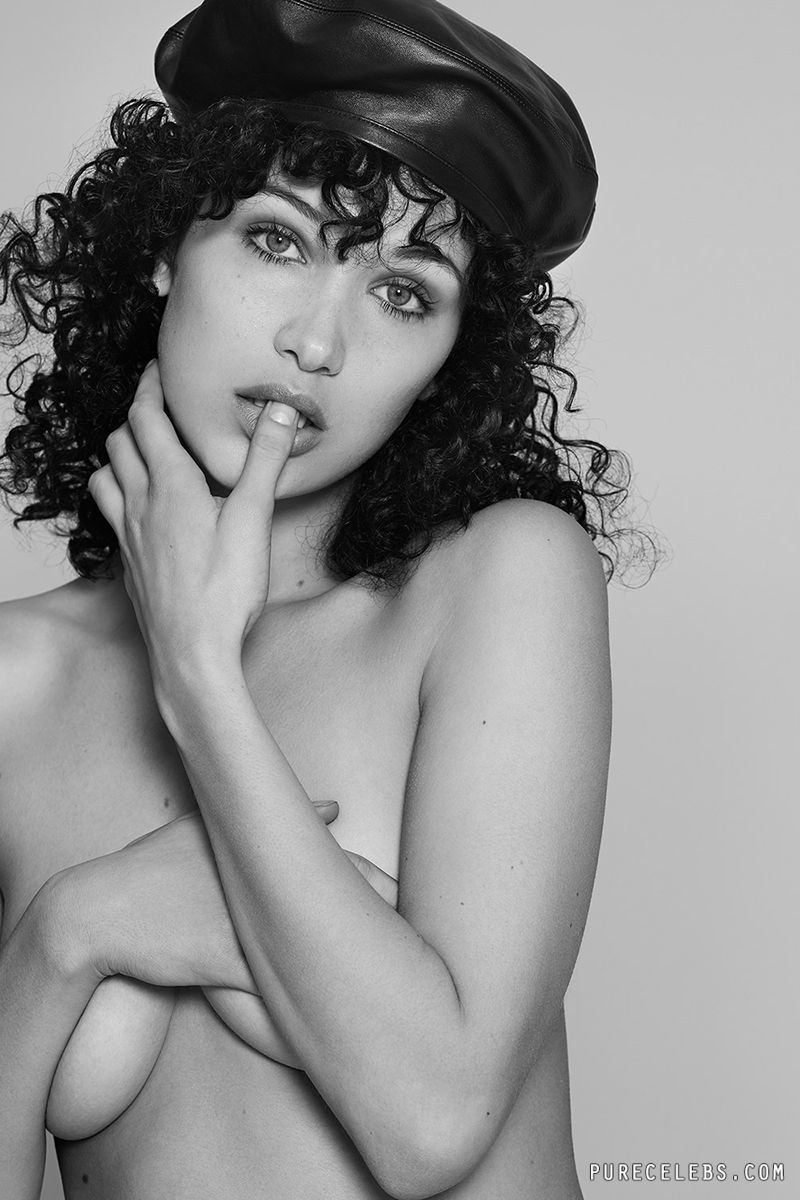 American model Bella Hadid showed off her nude boobs in a photo shoot for 032c Magazine. This charming chick posed in black boots and leather thongs, which demonstrated the beauty of her amazing buttocks. Also, the celebrity showed off her chic ass in a narrow black bodysuit, turning her back on the camera. Just look at her topless photo! The star posed in a black cap and jeans, covering her awesome big boobs with her hands! Oh, how juicy and seductive they were! This model can drive anyone crazy, right?