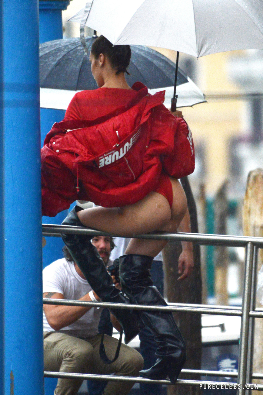 Paparazzi are constantly trying to catch the American model Bella Hadid nude. Well, recently they almost succeeded. They photographed this charming brunette sitting on handrails and with a white umbrella in her hand. The girl was wearing red thongs, and a red jacket was draped over her. Agree, Bella Hadid ass, covered with a narrow strip, looked almost like a naked!