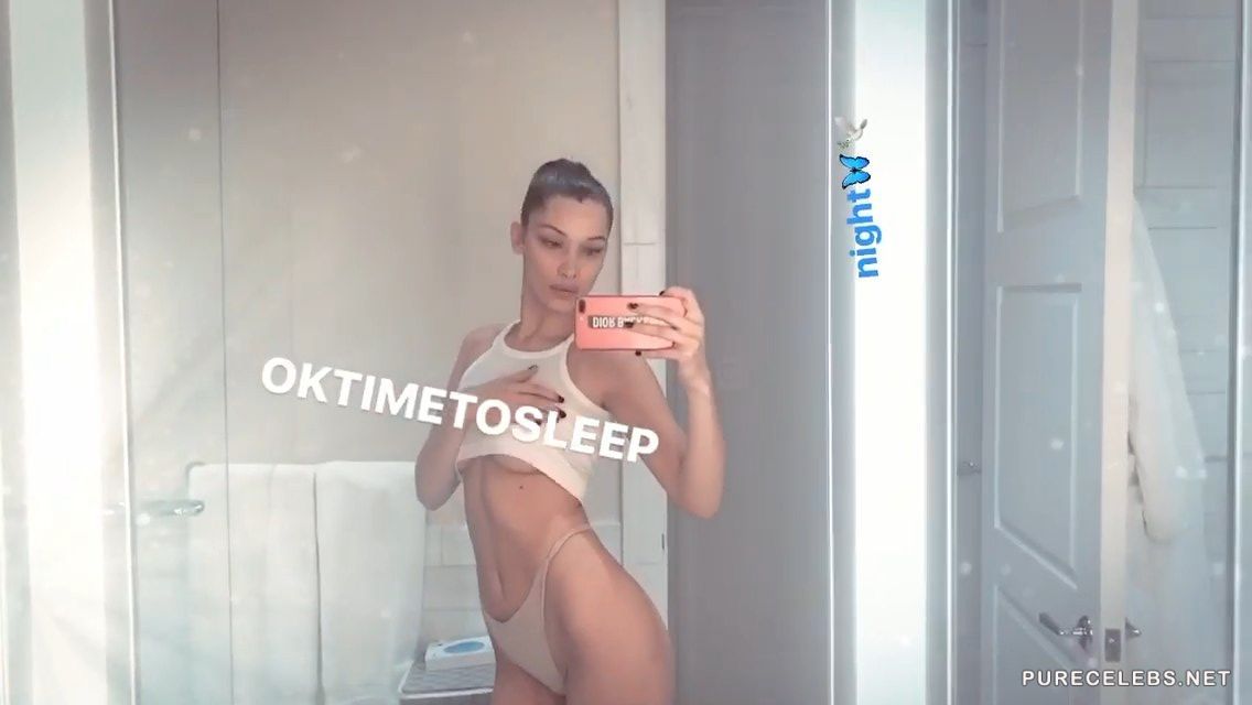 It seems young model Bella Hadid is horny late at night. The beautiful model posted some sexy photos of herself in the bathroom trying on some lingerie before bed. She stood in front of a big mirror to allow the camera on her phone to catch every inch of her perfect body. Bella grabbed her luscious tits with her hand in an effort to conceal her nipples.