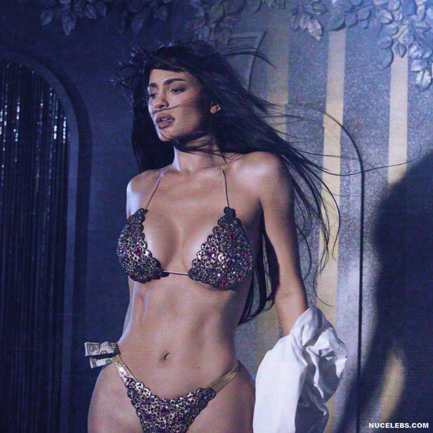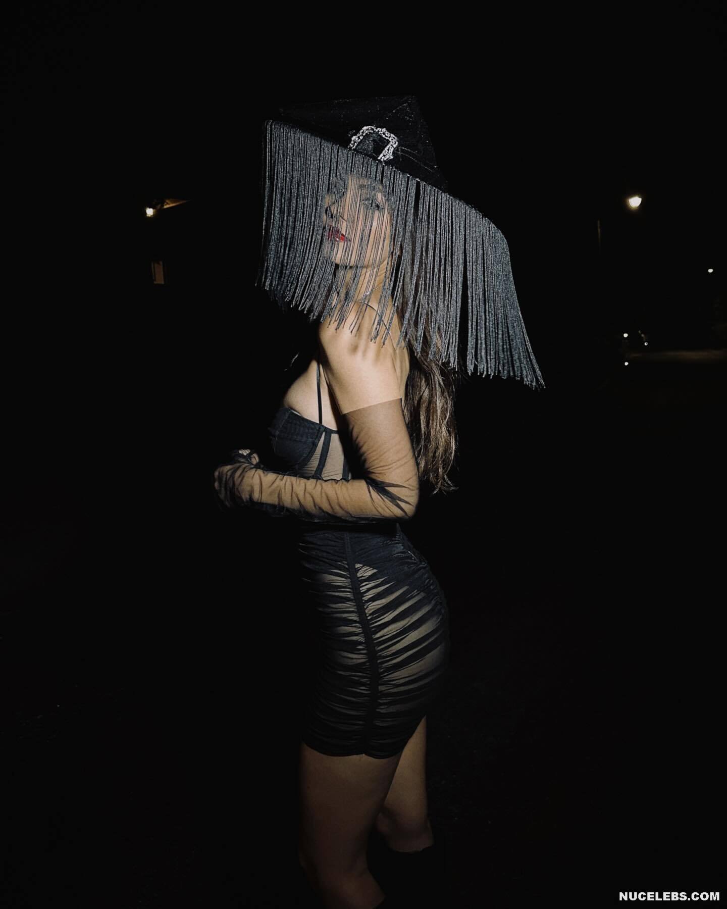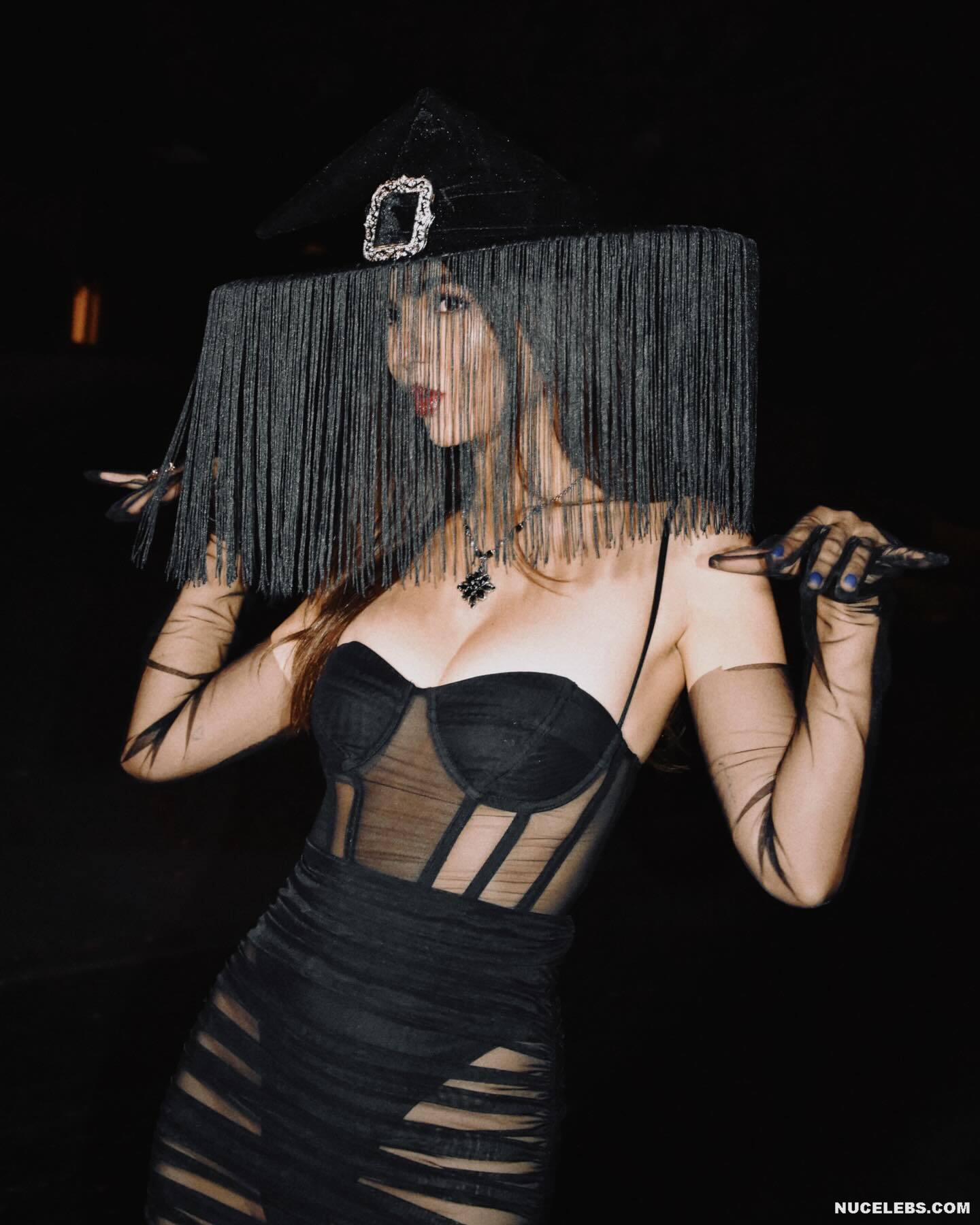 Stassie Karanikolaou dressed up in a black latex bodysuit with thin straps, and she’s looking sexy! She pairs it with fishnet tights and a tiny black crossbody bag to keep things sleek and stylish. Her dark hair is perfectly styled into a chic ponytail, but here’s where it gets spooky – there’s a big, creepy red blood stain on the side of her neck, adding just the right touch of Halloween horror. But let’s be real, it’s hard to notice the blood because all eyes are on her amazing cleavage! This look is hot and haunting at the same time!