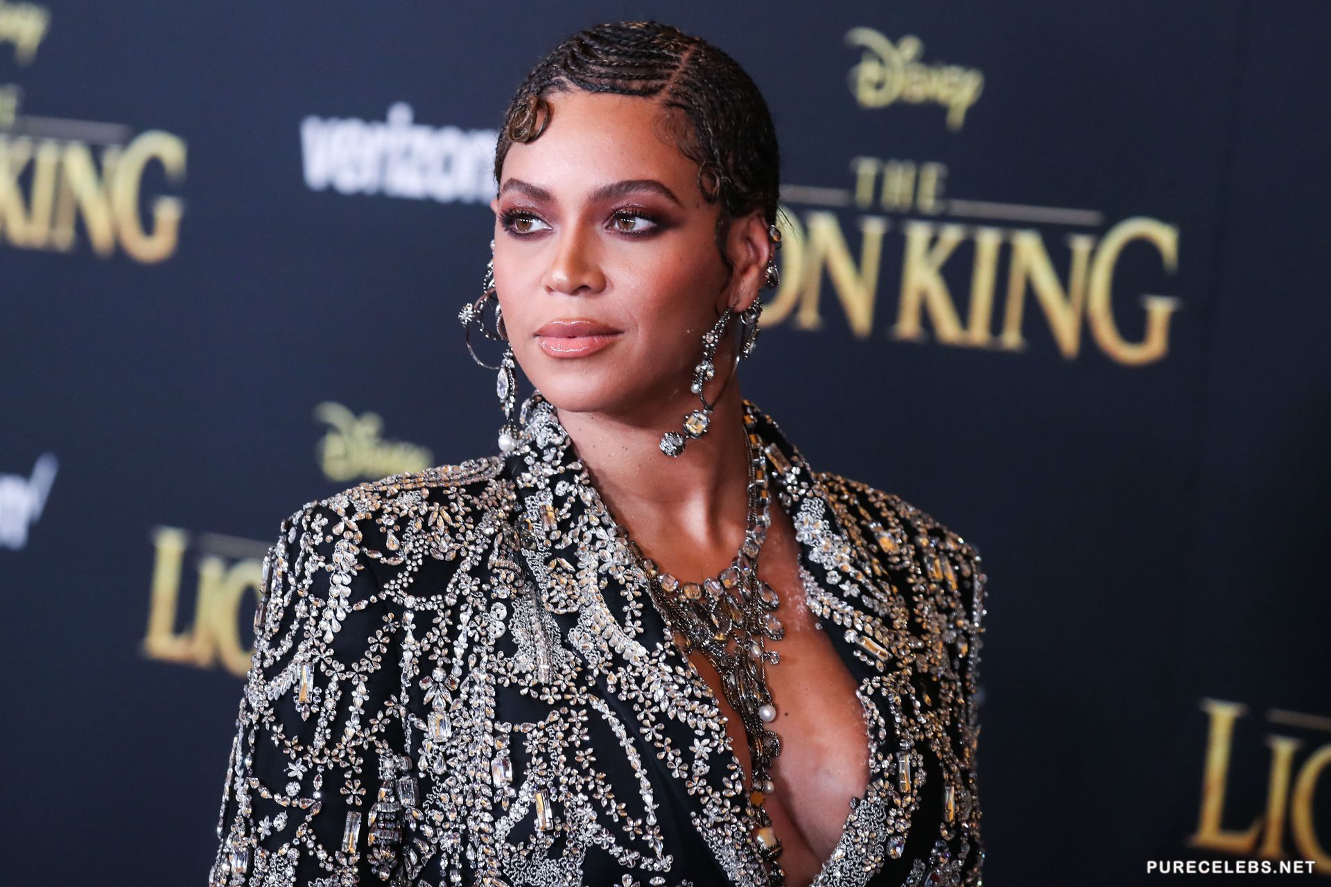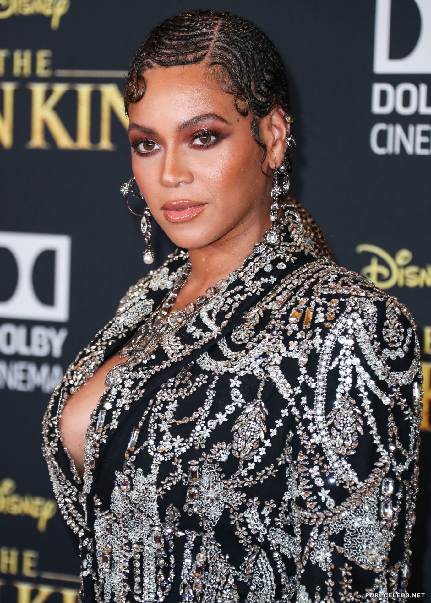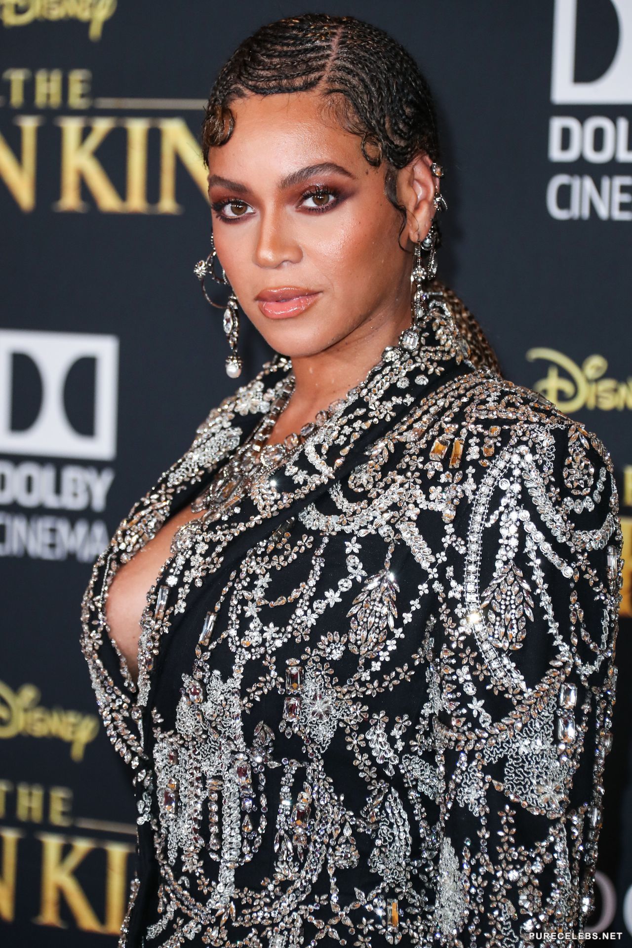 Not so long ago, the American singer Beyonce arrived at an event, in a very extravagant outfit. Hot beauty made herself an unusual hairstyle from a multitude of small braids and bright make-up. The star was wearing a black jacket, embroidered with rhinestones, which demonstrated her great cleavage. In some photos, you can even see the areola of her nipple, which slipped out of the deep neckline of the jacket.