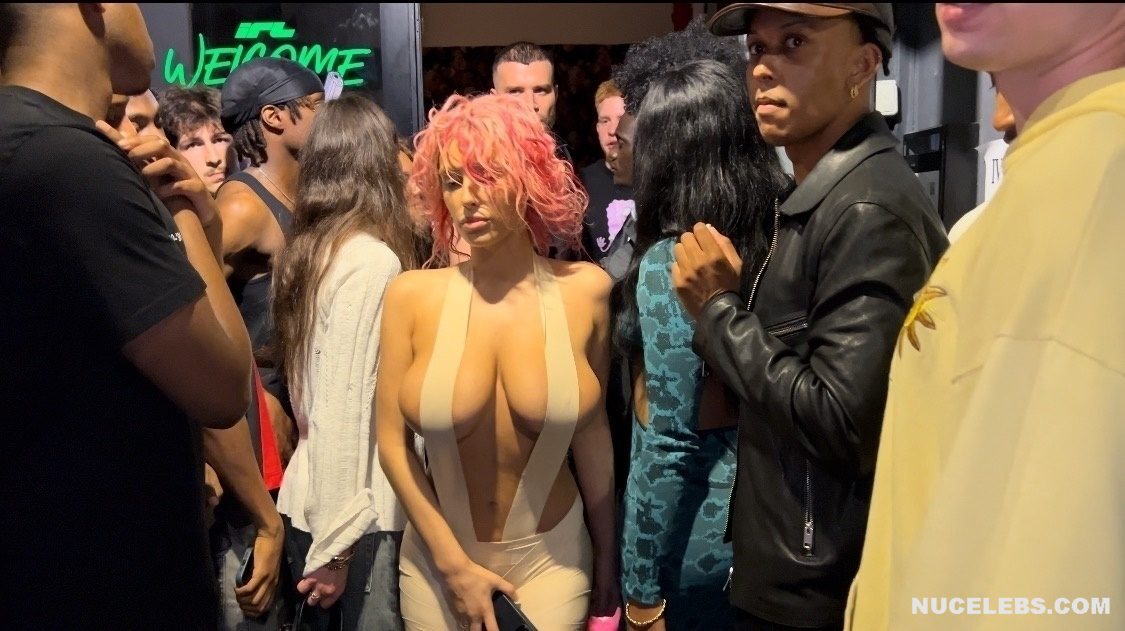 Bianca Censori loves to excite the public’s attention. This 29-year-old celebrity drove everyone crazy when she appeared in transparent tights without panties and a fur coat. As you can see Bianca Censori nude shaved pussy was visible through the tights! And another time this girl decided to pamper you with her awesome boobs. And here are her impressive shots near the car. Bianca Censori bare huge boobs were covered only by narrow white ribbons running from her neck to her stomach!